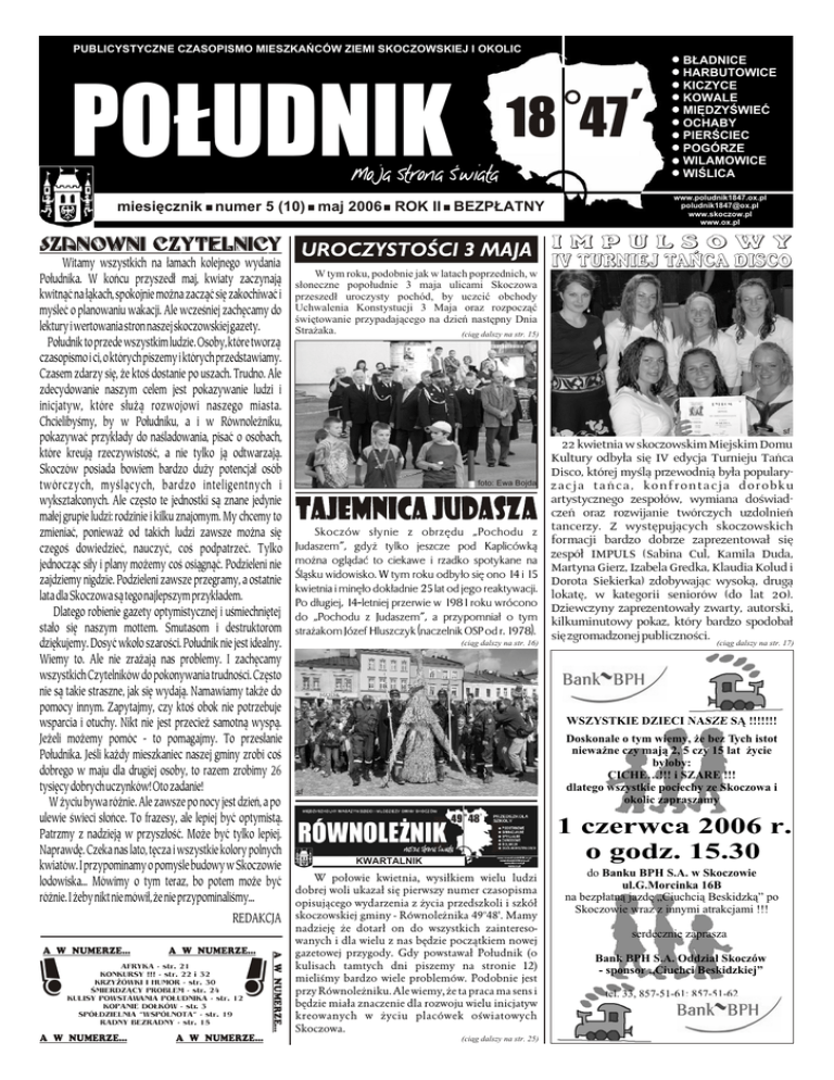 PUBLICYSTYCZNE CZASOPISMO MIESZKAÑCÓW ZIEMI SKOCZOWSKIEJ I OKOLIC miesiêcznik numer 5 (10) maj 2006 ROK II BEZP£ATNY Witamy wszystkich na ³amach kolejnego wydania Po³udnika. W koñcu przyszed³ maj, kwiaty zaczynaj¹ kwitn¹æ na ³¹kach, spokojnie mo¿na zacz¹æ siê zakochiwaæ i myœleæ o planowaniu wakacji. Ale wczeœniej zachêcamy do lektury i wertowania stron naszej skoczowskiej gazety. Po³udnik to przede wszystkim ludzie. Osoby, które tworz¹ czasopismo i ci, o których piszemy i których przedstawiamy. Czasem zdarzy siê, ¿e ktoœ dostanie po uszach. Trudno. Ale zdecydowanie naszym celem jest pokazywanie ludzi i inicjatyw, które s³u¿¹ rozwojowi naszego miasta. Chcielibyœmy, by w Po³udniku, a i w Równole¿niku, pokazywaæ przyk³ady do naœladowania, pisaæ o osobach, które kreuj¹ rzeczywistoœæ, a nie tylko j¹ odtwarzaj¹. Skoczów posiada bowiem bardzo du¿y potencja³ osób twórczych, myœl¹cych, bardzo inteligentnych i wykszta³conych. Ale czêsto te jednostki s¹ znane jedynie ma³ej grupie ludzi: rodzinie i kilku znajomym. My chcemy to zmieniaæ, poniewa¿ od takich ludzi zawsze mo¿na siê czegoœ dowiedzieæ, nauczyæ, coœ podpatrzeæ. Tylko jednocz¹c si³y i plany mo¿emy coœ osi¹gn¹æ. Podzieleni nie zajdziemy nigdzie. Podzieleni zawsze przegramy, a ostatnie lata dla Skoczowa s¹ tego najlepszym przyk³adem. Dlatego robienie gazety optymistycznej i uœmiechniêtej sta³o siê naszym mottem. Smutasom i destruktorom dziêkujemy. Dosyæ wko³o szaroœci. Po³udnik nie jest idealny. Wiemy to. Ale nie zra¿aj¹ nas problemy. I zachêcamy wszystkich Czytelników do pokonywania trudnoœci. Czêsto nie s¹ takie straszne, jak siê wydaj¹. Namawiamy tak¿e do pomocy innym. Zapytajmy, czy ktoœ obok nie potrzebuje wsparcia i otuchy. Nikt nie jest przecie¿ samotn¹ wysp¹. Je¿eli mo¿emy pomóc - to pomagajmy. To przes³anie Po³udnika. Jeœli ka¿dy mieszkaniec naszej gminy zrobi coœ dobrego w maju dla drugiej osoby, to razem zrobimy 26 tysiêcy dobrych uczynków! Oto zadanie! W ¿yciu bywa ró¿nie. Ale zawsze po nocy jest dzieñ, a po ulewie œwieci s³oñce. To frazesy, ale lepiej byæ optymist¹. Patrzmy z nadziej¹ w przysz³oœæ. Mo¿e byæ tylko lepiej. Naprawdê. Czeka nas lato, têcza i wszystkie kolory polnych kwiatów. I przypominamy o pomyœle budowy w Skoczowie lodowiska... Mówimy o tym teraz, bo potem mo¿e byæ ró¿nie. I ¿eby nikt nie mówi³, ¿e nie przypominaliœmy... REDAKCJA ! A W NUMERZE... AFRYKA - str. 21 KONKURSY !!! - str. 22 i 32 KRZY¯ÓWKI I HUMOR - str. 30 ŒMIERDZ¥CY PROBLEM - str. 24 KULISY POWSTAWANIA PO£UDNIKA - str. 12 KOPANIE DO£KÓW - str. 3 SPÓ£DZIELNIA “WSPÓLNOTA” - str. 19 RADNY BEZRADNY - str. 15 A W NUMERZE... A W NUMERZE... A W NUMERZE... ! A W NUMERZE... ‘ PO£UDNIK 18 47 B£ADNICE HARBUTOWICE KICZYCE KOWALE MIÊDZYŒWIEÆ OCHABY PIERŒCIEC POGÓRZE WILAMOWICE WIŒLICA www.poludnik1847.ox.pl [email protected] www.skoczow.pl www.ox.pl W tym roku, podobnie jak w latach poprzednich, w s³oneczne popo³udnie 3 maja ulicami Skoczowa przeszed³ uroczysty pochód, by uczciæ obchody Uchwalenia Konstystucji 3 Maja oraz rozpocz¹æ œwiêtowanie przypadaj¹cego na dzieñ nastêpny Dnia Stra¿aka. (ci¹g dalszy na str. 15) sf foto: Ewa Bojda Skoczów s³ynie z obrzêdu „Pochodu z Judaszem”, gdy¿ tylko jeszcze pod Kaplicówk¹ mo¿na ogl¹daæ to ciekawe i rzadko spotykane na Œl¹sku widowisko. W tym roku odby³o siê ono 14 i 15 kwietnia i minê³o dok³adnie 25 lat od jego reaktywacji. Po d³ugiej, 14-letniej przerwie w 1981 roku wrócono do „Pochodu z Judaszem”, a przypomnia³ o tym stra¿akom Józef Hluszczyk (naczelnik OSP od r. 1978). (ci¹g dalszy na str. 16) 22 kwietnia w skoczowskim Miejskim Domu Kultury odby³a siê IV edycja Turnieju Tañca Disco, której myœl¹ przewodni¹ by³a popularyzacja tañca, konfrontacja dorobku artystycznego zespo³ów, wymiana doœwiadczeñ oraz rozwijanie twórczych uzdolnieñ tancerzy. Z wystêpuj¹cych skoczowskich formacji bardzo dobrze zaprezentowa³ siê zespó³ IMPULS (Sabina Cul, Kamila Duda, Martyna Gierz, Izabela Gredka, Klaudia Kolud i Dorota Siekierka) zdobywaj¹c wysok¹, drug¹ lokatê, w kategorii seniorów (do lat 20). Dziewczyny zaprezentowa³y zwarty, autorski, kilkuminutowy pokaz, który bardzo spodoba³ siê zgromadzonej publicznoœci. (ci¹g dalszy na str. 17) WSZYSTKIE DZIECI NASZE S¥ !!!!!!! Doskonale o tym wiemy, ¿e bez Tych istot niewa¿ne czy maj¹ 2, 5 czy 15 lat ¿ycie by³oby: CICHE…!!! i SZARE !!! dlatego wszystkie pociechy ze Skoczowa i okolic zapraszamy sf 1 czerwca 2006 r. o godz. 15.30 KWARTALNIK W po³owie kwietnia, wysi³kiem wielu ludzi dobrej woli ukaza³ siê pierwszy numer czasopisma opisuj¹cego wydarzenia z ¿ycia przedszkoli i szkó³ skoczowskiej gminy - Równole¿nika 49o48'. Mamy nadziejê ¿e dotar³ on do wszystkich zainteresowanych i dla wielu z nas bêdzie pocz¹tkiem nowej gazetowej przygody. Gdy powstawa³ Po³udnik (o kulisach tamtych dni piszemy na stronie 12) mieliœmy bardzo wiele problemów. Podobnie jest przy Równole¿niku. Ale wiemy, ¿e ta praca ma sens i bêdzie mia³a znaczenie dla rozwoju wielu inicjatyw kreowanych w ¿yciu placówek oœwiatowych Skoczowa. (ci¹g dalszy na str. 25) do Banku BPH S.A. w Skoczowie ul.G.Morcinka 16B na bezp³atn¹ jazdê „Ciuchci¹ Beskidzk¹” po Skoczowie wraz z innymi atrakcjami !!! serdecznie zaprasza Bank BPH S.A. Oddzia³ Skoczów - sponsor „Ciuchci Beskidzkiej” tel. 33, 857-51-61; 857-51-62 PO£UDNIK 18o47’ ¯ycie jest to czas, którego jedn¹ po³owê zatruwaj¹ nam rodzice, a drug¹ dzieci. P R Z Y R O D A Wa¿ne miejsce we florze leœnej zajmuj¹ przedstawiciele rodziny storczykowatych (Orchidaceae). S¹ to roœliny o piêknym kszta³cie i wzorzystych, barwnych kwiatach, niestety niezwykle szybko gin¹ce i coraz rzadsze w przyrodzie. Pe³niê rozwoju osi¹gaj¹ storczykowate w krajach podzwrotnikowych. W parnych puszczach tropikalny