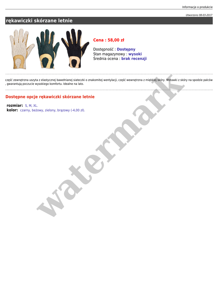 Informacje o produkcie Utworzono 08-03-2017 rękawiczki skórzane letnie Cena : 58,00 zł Dostępność : Dostępny Stan magazynowy : wysoki Średnia ocena : brak recenzji er m ar k część zewnętrzna uszyta z elastycznej bawełnianej siateczki o znakomitej wentylacji, część wewnętrzna z miękkiej skóry. Wstawki z skóry na spodzie palców , gwarantują poczucie wysokiego komfortu. Idealne na lato. Dostępne opcje rękawiczki skórzane letnie w at rozmiar: S, M, XL. kolor: czarny, beżowy, zielony, brązowy (-4,00 zł).