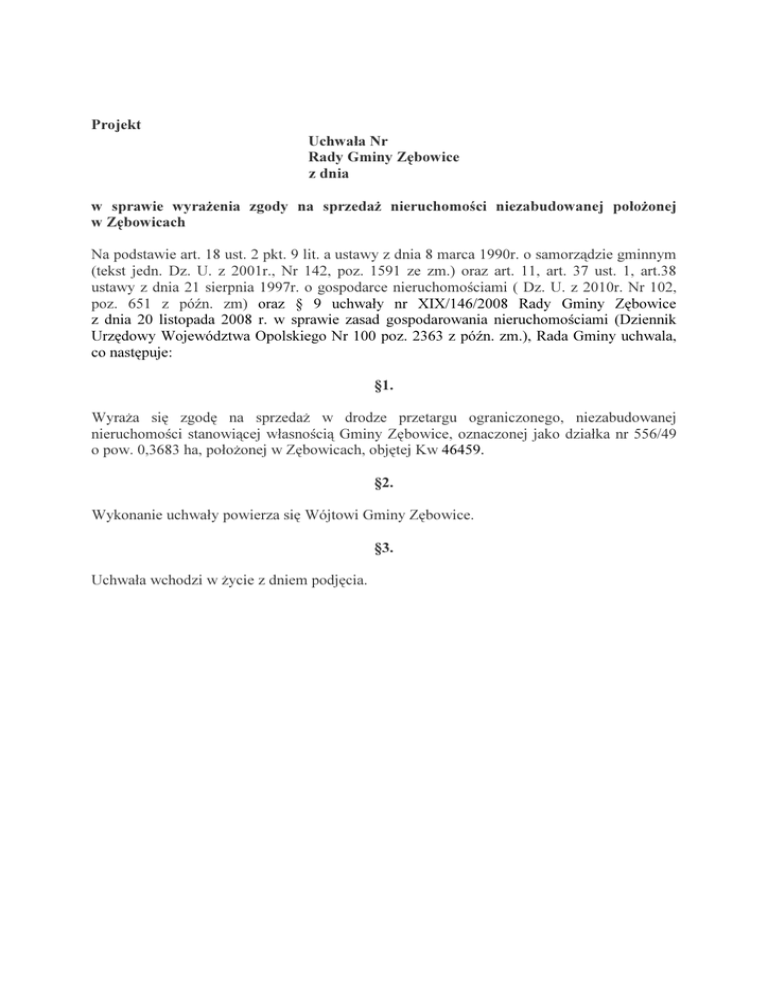 Projekt Uchwała Nr Rady Gminy Zębowice z dnia w sprawie wyrażenia zgody na sprzedaż nieruchomości niezabudowanej położonej w Zębowicach Na podstawie art. 18 ust. 2 pkt. 9 lit. a ustawy z dnia 8 marca 1990r. o samorządzie gminnym (tekst jedn. Dz. U. z 2001r., Nr 142, poz. 1591 ze zm.) oraz art. 11, art. 37 ust. 1, art.38 ustawy z dnia 21 sierpnia 1997r. o gospodarce nieruchomościami ( Dz. U. z 2010r. Nr 102, poz. 651 z późn. zm) oraz § 9 uchwały nr XIX/146/2008 Rady Gminy Zębowice z dnia 20 listopada 2008 r. w sprawie zasad gospodarowania nieruchomościami (Dziennik Urzędowy Województwa Opolskiego Nr 100 poz. 2363 z późn. zm.), Rada Gminy uchwala, co następuje: §1. Wyraża się zgodę na sprzedaż w drodze przetargu ograniczonego, niezabudowanej nieruchomości stanowiącej własnością Gminy Zębowice, oznaczonej jako działka nr 556/49 o pow. 0,3683 ha, położonej w Zębowicach, objętej Kw 46459. §2. Wykonanie uchwały powierza się Wójtowi Gminy Zębowice. §3. Uchwała wchodzi w życie z dniem podjęcia. Uzasadnienie do uchwały Przedmiotem uchwały jest nieruchomość tj. działka nr 556/49, obręb Zębowice ( działka położona obok piekarni, która nie posiada dostępu do drogi publicznej), zgodnie z planem zagospodarowania przestrzennego wsi Zębowice wymieniona działka spełnia funkcję: w 50% powierzchni działki oznaczona jest symbolem 1MU- tereny zabudowy mieszkaniowousługowej oraz w 50% powierzchni działki oznaczona jest symbolem 3MN-tereny zabudowy mieszkaniowej jednorodzinnej. Podjęcie uchwały umożliwi sprzedaż nieruchomości. Aktualnie nieruchomość jest niezabudowana. W wyniku realizacji uchwały nastąpi sprzedaż z zachowaniem trybu przetargowego, a gmina uzyska dochód w postaci ceny sprzedaży. Dochodem gminy będzie również należność z tytułu podatku od nieruchomości.