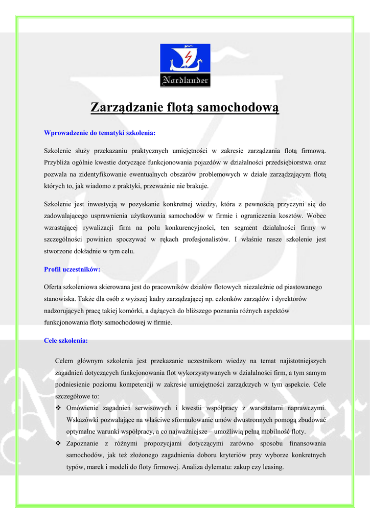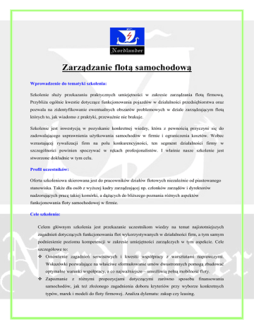 Zarządzanie flotą samochodową Wprowadzenie do tematyki szkolenia: Szkolenie służy przekazaniu praktycznych umiejętności w zakresie zarządzania flotą firmową. Przybliża ogólnie kwestie dotyczące funkcjonowania pojazdów w działalności przedsiębiorstwa oraz pozwala na zidentyfikowanie ewentualnych obszarów problemowych w dziale zarządzającym flotą których to, jak wiadomo z praktyki, przeważnie nie brakuje. Szkolenie jest inwestycją w pozyskanie konkretnej wiedzy, która z pewnością przyczyni się do zadowalającego usprawnienia użytkowania samochodów w firmie i ograniczenia kosztów. Wobec wzrastającej rywalizacji firm na polu konkurencyjności, ten segment działalności firmy w szczególności powinien spoczywać w rękach profesjonalistów. I właśnie nasze szkolenie jest stworzone dokładnie w tym celu. Profil uczestników: Oferta szkoleniowa skierowana jest do pracowników działów flotowych niezależnie od piastowanego stanowiska. Także dla osób z wyższej kadry zarządzającej np. członków zarządów i dyrektorów nadzorujących pracę takiej komórki, a dążących do bliższego poznania różnych aspektów funkcjonowania floty samochodowej w firmie. Cele szkolenia: Celem głównym szkolenia jest przekazanie uczestnikom wiedzy na temat najistotniejszych zagadnień dotyczących funkcjonowania flot wykorzystywanych w działalności firm, a tym samym podniesienie poziomu kompetencji w zakresie umiejętności zarządczych w tym aspekcie. Cele szczegółowe to: Omówienie zagadnień serwisowych i kwestii współpracy z warsztatami naprawczymi. Wskazówki pozwalające na właściwe sformułowanie umów dwustronnych pomogą zbudować optymalne warunki współpracy, a co najważniejsze – umożliwią pełną mobilność floty. Zapoznanie z różnymi propozycjami dotyczącymi zarówno sposobu finansowania samochodów, jak też złożonego zagadnienia doboru kryteriów przy wyborze konkretnych typów, marek i modeli do floty firmowej. Analiza dylematu: zakup czy leasing. Identyfikowanie kosztów eksploatacyjnych związanych z użytkowaniem samochodów. Także kontrolowanie i obniżanie kosztów, szacowanie ryzyka wartości rezydualnej, przybliżenie stylu jazdy zgodnie z zasadami ecodriving-u czyli wskazanie możliwości likwidowania zbędnych kosztów flotowych. Przybliżenie tematyki ubezpieczeń komunikacyjnych oraz szkód we flocie firmowej Zapoznanie uczestnika z zarządzaniem szkodowością samochodów służbowych, przede wszystkim na podstawie przykładów z życia wziętych. Nabycie wiedzy w zakresie bardzo istotnej kwestii zaopatrzenia pojazdów firmowych w paliwo. Rozważenie korzyści/wad dywersyfikacji źródeł zaopatrzenia, wskazanie na typowe błędy w tej mierze mogące generować dodatkowe koszty dla firmy. Zapoznanie z podstawowymi systemami oraz analiza zasadności korzystania ze wsparcia informatycznego i telemetrycznego w zarządzaniu flotą. Ocena kiedy, przy jakiej specyfice pracy, jest to niezbędne, a kiedy Fleet Manager poradzi sobie przy pomocy innych narzędzi. Uświadomienie występowania różnorakich specyficznych ryzyk w pracy Fleet Managera oraz radzenia sobie w trudnych sytuacjach w aspekcie opieki nad flotą firmową. Korzyści z udziału w szkoleniu: Dzięki uczestnictwu w szkoleniu z zarządzania flotą samochodową każdy uczestnik dowie się jak prawidłowo powinien funkcjonować dział flotowy. Pod okiem specjalisty-praktyka otrzyma niezbędną wiedzę, której źródłem są praktyczne doświadczenia prowadzącego, jak też innych uczestników. Po szkoleniu uczestnik będzie w stanie wprowadzić usprawnienia w pracy swojego działu, a co za tym idzie, wpłynąć na poprawę i/lub optymalizację funkcjonowania floty w firmie. Oprócz tych bezpośrednich korzyści związanych ze wskazywaniem konkretnych rozwiązań stosowanych w branży, każdy uczestnik wyjdzie ze szkolenia ze wzmocnioną motywacją do pracy w tym nowym i ciekawym zawodzie, jak też refleksją na temat konieczności rozwoju osobistego jako pracownika firmy. Podczas intensywnego treningu uczestnik nauczy się: jakie stosować rozwiązania mając na celu poprawę bezpieczeństwa użytkowników oraz floty jak zbudować dobrą współpracę z warsztatami naprawczymi, co umożliwi pełną mobilność i optymalny stan techniczny naszej floty jak wybrać odpowiedni sposób finansowania samochodów oraz jakie kryteria uwzględnić przy wyborze konkretnych typów, marek i modeli do floty firmowej jak identyfikować koszty eksploatacyjne związane z użytkowaniem samochodów, a następnie kontrolować je i redukować jak zarządzać szkodowością aut służbowych, na podstawie przykładów z życia wziętych jak najbardziej optymalnie zorganizować zaopatrzenie pojazdów firmowych w paliwo czy i jak korzystać ze wsparcia informatycznego i telemetrycznego w zarządzaniu flotą jakie specyficzne ryzyka i problemy występują w pracy Fleet Managera oraz jak radzić sobie w trudnych sytuacjach w aspekcie opieki nad flotą firmową jakie są najistotniejsze kwestie prawne w pracy Fleet Managera Program szkolenia: WSTĘP DO SZKOLENIA Metodyka szkolenia Co to jest zarządzanie flota samochodową? Teoria i praktyka Rola samochodów w firmie Wprowadzenie do szkolenia, poza przedstawieniem Uczestników i ich flot, porządkuje pojęcia oraz pozwala ukierunkować trening na konkretne, pożądane przez zarządzających zagadnienia. KOSZTY FLOTOWE I SZUKANIE OSZCZĘDNOŚCI Miejsca powstawania kosztów, nabywanie samochodów do floty firmowej Całkowite koszty posiadania pojazdów (Total Cost of Ownership) Niewidoczny koszt ryzyka wartości końcowej Czynniki pozafinansowe decyzji finansowych Analiza kosztowa zaczyna się długo przed pozyskaniem składników floty czyli samochodów. Omówienie kwestii ich nabywania uzmysławia jak wielkie, choć początkowo niewidoczne, mogą być koszty nieprzemyślanych i niewłaściwych decyzji zakupowych. Outsourcing Co to jest Car Fl