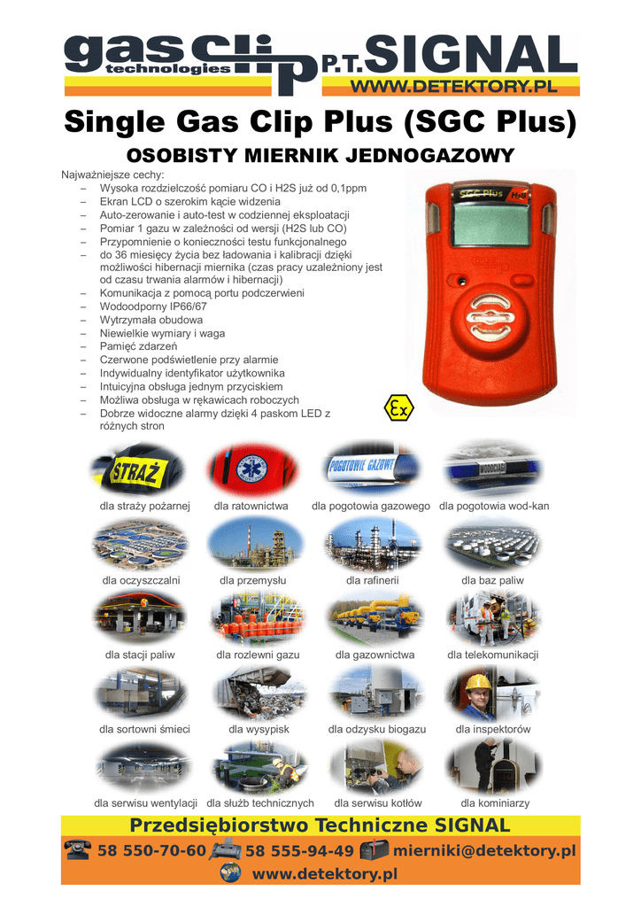 Single Gas Clip Plus (SGC Plus) OSOBISTY MIERNIK JEDNOGAZOWY Najważniejsze cechy: – Wysoka rozdzielczość pomiaru CO i H2S już od 0,1ppm – Ekran LCD o szerokim kącie widzenia – Auto-zerowanie i auto-test w codziennej eksploatacji – Pomiar 1 gazu w zależności od wersji (H2S lub CO) – Przypomnienie o konieczności testu funkcjonalnego – do 36 miesięcy życia bez ładowania i kalibracji dzięki możliwości hibernacji miernika (czas pracy uzależniony jest od czasu trwania alarmów i hibernacji) – Komunikacja z pomocą portu podczerwieni – Wodoodporny IP66/67 – Wytrzymała obudowa – Niewielkie wymiary i waga – Pamięć zdarzeń – Czerwone podświetlenie przy alarmie – Indywidualny identyfikator użytkownika – Intuicyjna obsługa jednym przyciskiem – Możliwa obsługa w rękawicach roboczych – Dobrze widoczne alarmy dzięki 4 paskom LED z różnych stron dla straży pożarnej dla oczyszczalni dla stacji paliw dla sortowni śmieci dla ratownictwa dla pogotowia gazowego dla pogotowia wod-kan dla przemysłu dla rafinerii dla baz paliw dla rozlewni gazu dla gazownictwa dla telekomunikacji dla wysypisk dla odzysku biogazu dla inspektorów dla serwisu kotłów dla kominiarzy dla serwisu wentylacji dla służb technicznych DANE TECHNICZNE: DOSTĘPNE WERSJE MIERNIKA: - H2S (elektrochemiczny) - CO (elektrochemiczny) BUDOWA: Wielkość: Waga: ZAKRESY: 0-100ppm 0-300ppm ROZDZIELCZOŚĆ: 0,1ppm 0,1ppm Przykładowe opcje noszenia miernika: 85,6mm x 50,0mm x 29,2mm 76g WARUNKI PRACY: Wilgotność: 5-95% RH(bez kondensacji) Temperatura: Od -40oC do +50oC wersja CO Od -40oC do +50oC wersja H2S Stopień IP: 66/67 NA KASKU ZASILANIE: Niewymienna bateria* *Po wyczerpaniu się baterii urządzenie nie nadaje się do dalszej eksploatacji i należy je poddać utylizacji. Czas pracy 36 miesięcy dzięki hibernacji** **Czas pracy urządzenia uzależniony jest od warunków eksploatacji i czasu trwania alarmów. Przy długotrwałych ekspozycjach czas pracy może ulec skróceniu. NA KIESZENI PRZEDNIEJ CERTYFIKATY: ATEX EEx II 1 G IIC T4 Ga IECEx Ex ia IIC T4 Ga CE kompatybilny z dyrektywą EMC 89/336/EEC NA KIESZENI NARAMIENNEJ ALARMY: optyczny LED, akustyczny 95dB, wibracyjny 4 paski alarmowe LED alarm przekroczenia progu stężenia czerwony LED RODZAJE ALARMÓW: NA PASKU LUB SMYCZY STEL, TWA, Low, High, Multi, OL (przekroczenie zakresu), Sensor Error (uszkodzenie sensora), LOW BATT (słabej baterii), EOL (koniec życia urządzenia) POZIOMY ALARMÓW: H2S – niski 10ppm, wysoki 15ppm CO – niski 35ppm, wysoki 200ppm PAMIĘĆ: 25 zdarzeń NA KIESZENI BOCZNEJ SPODNI WYTRZYMAŁY METALOWY KLIPS DO WYGODNEGO ZACZEPIENIA LUB ZAWIESZENIA NA SMYCZY Ilustracja poglądowa. Kolorystyka urządzenia może odbiegać od prezentowanej. Opcje zaczepienia urządzenia są uwarunkowane możliwościami ubioru i pozostałego wyposażenia pracownika. Producent ani importer nie odpowiadają za jakiekolwiek wykorzystanie powyższych przykładów. Prawidłowa eksploatacja urządzenia zawarta jest w instrukcji obsługi. Wszelkie prawa autorskie zastrzeżone. Niniejsza karta katalogowa nie może być powielana, dystrybuowana ani modyfikowana w żaden sposób ani przy wykorzystaniu jakichkolwiek środków bez zgody P.T.SIGNAL. Treść karty katalogowej oraz parametry urządzenia mogą być zmienione bez uprzedzenia.