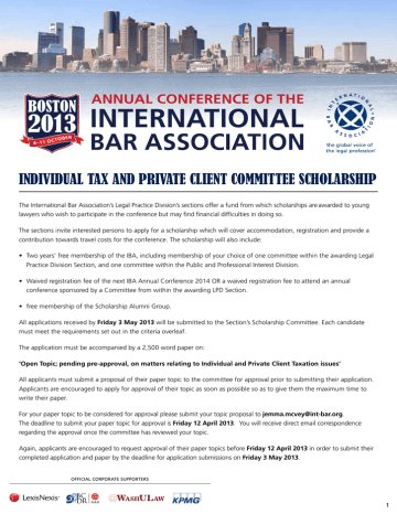 Individual Tax and Private Client Committee Scholarship The International Bar Association’s Legal Practice Division’s sections offer a fund from which scholarships are awarded to young lawyers who wish to participate in the conference but may find financial difficulties in doing so. The sections invite interested persons to apply for a scholarship which will cover accommodation, registration and provide a contribution towards travel costs for the conference. The scholarship will also include: • Two years’ free membership of the IBA, including membership of your choice of one committee within the awarding Legal Practice Division Section, and one committee within the Public and Professional Interest Division. • Waived registration fee of the next IBA Annual Conference 2014 OR a waived registration fee to attend an annual conference sponsored by a Committee from within the awarding LPD Section. • free membership of the Scholarship Alumni Group. All applications received by Friday 3 May 2013 will be submitted to the Section’s Scholarship Committee. Each candidate must meet the requirements set out in the criteria overleaf. The application must be accompanied by a 2,500 word paper on: ‘Open Topic; pending pre-approval, on matters relating to Individual and Private Client Taxation issues’ All applicants must submit a proposal of their paper topic to the committee for approval prior to submitting their application. Applicants are encouraged to apply for approval of their topic as soon as possible so as to give them the maximum time to write their paper. For your paper topic to be considered for approval please submit your topic proposal to [email protected]. The deadline to submit your paper topic for approval is Friday 12 April 2013. You will receive direct email correspondence regarding the approval once the committee has reviewed your topic. Again, applicants are encouraged to request approval of their paper topics before Friday 12 April 2013 in order to submit their completed application and paper by the deadline for application submissions on Friday 3 May 2013. Official corporate supporters 1 Boston 2013 The International Bar Association (IBA), the world’s largest international organisation of law societies, bar associations and individual lawyers engaged in transnational law, will hold its 2013 Conference in Boston from 6–11 October. As one of the largest international legal gatherings in 2013, it will attract over 4000 lawyers from more than 100 jurisdictions. All 55 specialist Committees of the Legal Practice Division will present programmes covering current topics of significance to commercial lawyers worldwide. The IBA’s Public and Professional Interest Division’s Committees and Other Entities will also be presenting full sessions, covering topics dealing with public interest and general professional work. For a list of all IBA Committees and entities, please see page 5. The working programmes will be complemented by a full social programme which helps to establish and maintain business contacts and friendships with the legal profession worldwide. Criteria (1) The Individual Tax and Private Client Committee Scholarship is free to enter. It is open to all lawyers up to and including the age of 35, whether or not they are members of the IBA. Papers shall answer the following question or be based on the following topic: ‘Open Topic; pending pre-approval, on matters relating to Individual and Private Client Taxation issues’ All applicants must submit a proposal of their paper topic to the committee for approval prior to submitting their application. Applicants are encouraged to apply for approval of their topic as soon as possible so as to give them the maximum time to write their paper. For your paper topic to be considered for approval please submit your topic proposal to jemma.mcvey@ int-bar.org. The deadline to submit your paper topic for approval is Friday 12 April 2013. You will receive direct email correspondence regarding the approval once the committee has reviewed your topic. Again, applicants are encouraged to request approval of their paper topics before Friday 12 April 2013 in order to submit their completed application and paper by the deadline for application submissions on Friday 3 May 2013. Papers must be original, unpublished works. They will not be under consideration for any commercial contract by any publishing house. The author is warranting his or her unrestricted copyright to the paper submitted. 2 (2) Participation with a pen name will be permitted, provided that an operative contact and a valid address are provided for a term until 1 July 2013. If authors using pen names are chosen as finalists, they will be required to prove their identity, age and qualification as a lawyer. If these requirements are not met, the candidate will automatically fail. Submissions with pen names will in any case need to be disclosed by all participants once the scholar has been chosen, at the request of the scholarship committee. Pen names are mandated for lawyers working in the corporations of the members of the judging committee. (3) In the case of papers submitted under a pen name, the e-mail address or any other reference of the sender shall not disclose the real details of the participant. In the case of e-mail addresses, for example, this can be achieved by using free e-mail services. (4) Papers must be sent by e-mail, preferably as Word documents or in PDF format to Jemma McVey, Divisions Administrative Assistant at the IBA Office ([email protected]) before Friday 3 May 2013. (5) Papers are to be written in English and should be at least 2,500 words. The text should be double-spaced. Each paper must contain the author’s name or the author’s pen name, and a valid contact address on the front page. (6) Papers must be submitted and received by Friday 3 May 2013. Papers received after this time will not be considered. (7) The Scholarship Committee