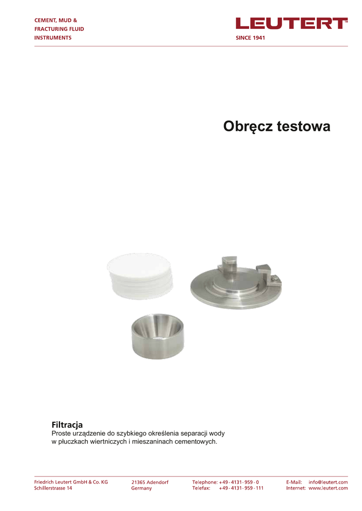 Obręcz testowa Filtracja Proste urządzenie do szybkiego określenia separacji wody w płuczkach wiertniczych i mieszaninach cementowych. Opis Proste urządzenie do szybkiego określenia separacji wody w płuczkach wiertniczych i mieszaninach cementowych. Częściowo może zastąpić prasę filtracyjną w aplikacjach nie wymagających dużej dokładności, jednak wystarczających do określenia charakteru płuczek i mieszanin cementowych. Dane techniczne Średnica Wysokość Ciężar : 75 mm : 22 mm : 0,3 kg | 2,95” | 0,86” | 0,66 lbs Akcesoria Filtry 100 szt. Moze uledz zmianie bez ostrzezenia 2 11/2009 Obręcz testowa