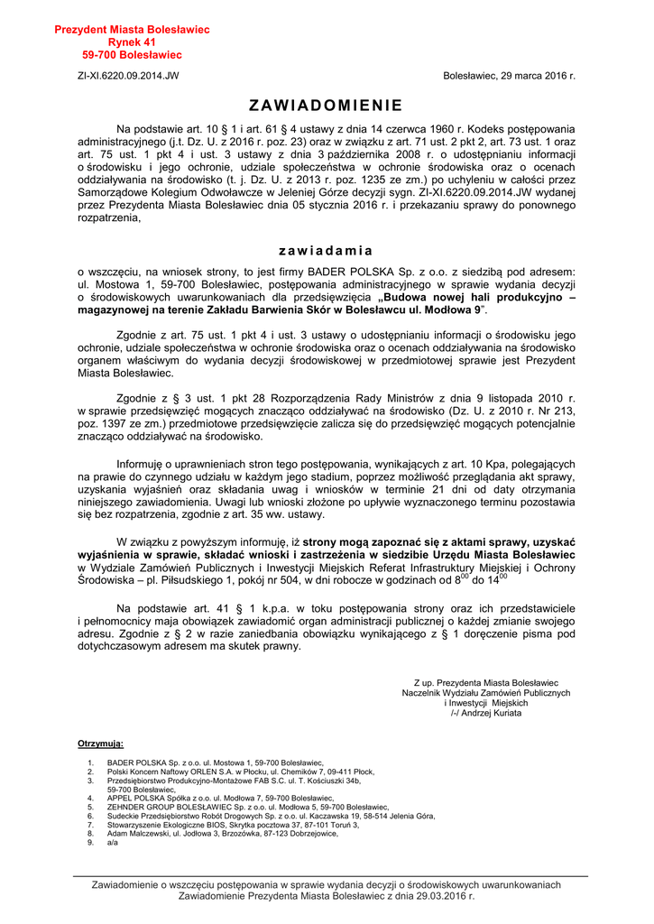 Prezydent Miasta Bolesławiec Rynek 41 59-700 Bolesławiec Bolesławiec, 29 marca 2016 r. ZI-XI.6220.09.2014.JW ZAWIADOMIENIE Na podstawie art. 10 § 1 i art. 61 § 4 ustawy z dnia 14 czerwca 1960 r. Kodeks postępowania administracyjnego (j.t. Dz. U. z 2016 r. poz. 23) oraz w związku z art. 71 ust. 2 pkt 2, art. 73 ust. 1 oraz art. 75 ust. 1 pkt 4 i ust. 3 ustawy z dnia 3 października 2008 r. o udostępnianiu informacji o środowisku i jego ochronie, udziale społeczeństwa w ochronie środowiska oraz o ocenach oddziaływania na środowisko (t. j. Dz. U. z 2013 r. poz. 1235 ze zm.) po uchyleniu w całości przez Samorządowe Kolegium Odwoławcze w Jeleniej Górze decyzji sygn. ZI-XI.6220.09.2014.JW wydanej przez Prezydenta Miasta Bolesławiec dnia 05 stycznia 2016 r. i przekazaniu sprawy do ponownego rozpatrzenia, zawiadamia o wszczęciu, na wniosek strony, to jest firmy BADER POLSKA Sp. z o.o. z siedzibą pod adresem: ul. Mostowa 1, 59-700 Bolesławiec, postępowania administracyjnego w sprawie wydania decyzji o środowiskowych uwarunkowaniach dla przedsięwzięcia „Budowa nowej hali produkcyjno – magazynowej na terenie Zakładu Barwienia Skór w Bolesławcu ul. Modłowa 9”. Zgodnie z art. 75 ust. 1 pkt 4 i ust. 3 ustawy o udostępnianiu informacji o środowisku jego ochronie, udziale społeczeństwa w ochronie środowiska oraz o ocenach oddziaływania na środowisko organem właściwym do wydania decyzji środowiskowej w przedmiotowej sprawie jest Prezydent Miasta Bolesławiec. Zgodnie z § 3 ust. 1 pkt 28 Rozporządzenia Rady Ministrów z dnia 9 listopada 2010 r. w sprawie przedsięwzięć mogących znacząco oddziaływać na środowisko (Dz. U. z 2010 r. Nr 213, poz. 1397 ze zm.) przedmiotowe przedsięwzięcie zalicza się do przedsięwzięć mogących potencjalnie znacząco oddziaływać na środowisko. Informuję o uprawnieniach stron tego postępowania, wynikających z art. 10 Kpa, polegających na prawie do czynnego udziału w każdym jego stadium, poprzez możliwość przeglądania akt sprawy, uzyskania wyjaśnień oraz składania uwag i wniosków w terminie 21 dni od daty otrzymania niniejszego zawiadomienia. Uwagi lub wnioski złożone po upływie wyznaczonego terminu pozostawia się bez rozpatrzenia, zgodnie z art. 35 ww. ustawy. W związku z powyższym informuję, iż strony mogą zapoznać się z aktami sprawy, uzyskać wyjaśnienia w sprawie, składać wnioski i zastrzeżenia w siedzibie Urzędu Miasta Bolesławiec w Wydziale Zamówień Publicznych i Inwestycji Miejskich Referat Infrastruktury Miejskiej i Ochrony 00 00 Środowiska – pl. Piłsudskiego 1, pokój nr 504, w dni robocze w godzinach od 8 do 14 Na podstawie art. 41 § 1 k.p.a. w toku postępowania strony oraz ich przedstawiciele i pełnomocnicy maja obowiązek zawiadomić organ administracji publicznej o każdej zmianie swojego adresu. Zgodnie z § 2 w razie zaniedbania obowiązku wynikającego z § 1 doręczenie pisma pod dotychczasowym adresem ma skutek prawny. Z up. Prezydenta Miasta Bolesławiec Naczelnik Wydziału Zamówień Publicznych i Inwestycji Miejskich /-/ Andrzej Kuriata Otrzymują: 1. 2. 3. 4. 5. 6. 7. 8. 9. BADER POLSKA Sp. z o.o. ul. Mostowa 1, 59-700 Bolesławiec, Polski Koncern Naftowy ORLEN S.A. w Płocku, ul. Chemików 7, 09-411 Płock, Przedsiębiorstwo Produkcyjno-Montażowe FAB S.C. ul. T. Kościuszki 34b, 59-700 Bolesławiec, APPEL POLSKA Spółka z o.o. ul. Modłowa 7, 59-700 Bolesławiec, ZEHNDER GROUP BOLESŁAWIEC Sp. z o.o. ul. Modłowa 5, 59-700 Bolesławiec, Sudeckie Przedsiębiorstwo Robót Drogowych Sp. z o.o. ul. Kaczawska 19, 58-514 Jelenia Góra, Stowarzyszenie Ekologiczne BIOS, Skrytka pocztowa 37, 87-101 Toruń 3, Adam Malczewski, ul. Jodłowa 3, Brzozówka, 87-123 Dobrzejowice, a/a Zawiadomienie o wszczęciu postępowania w sprawie wydania decyzji o środowiskowych uwarunkowaniach Zawiadomienie Prezydenta Miasta Bolesławiec z dnia 29.03.2016 r.