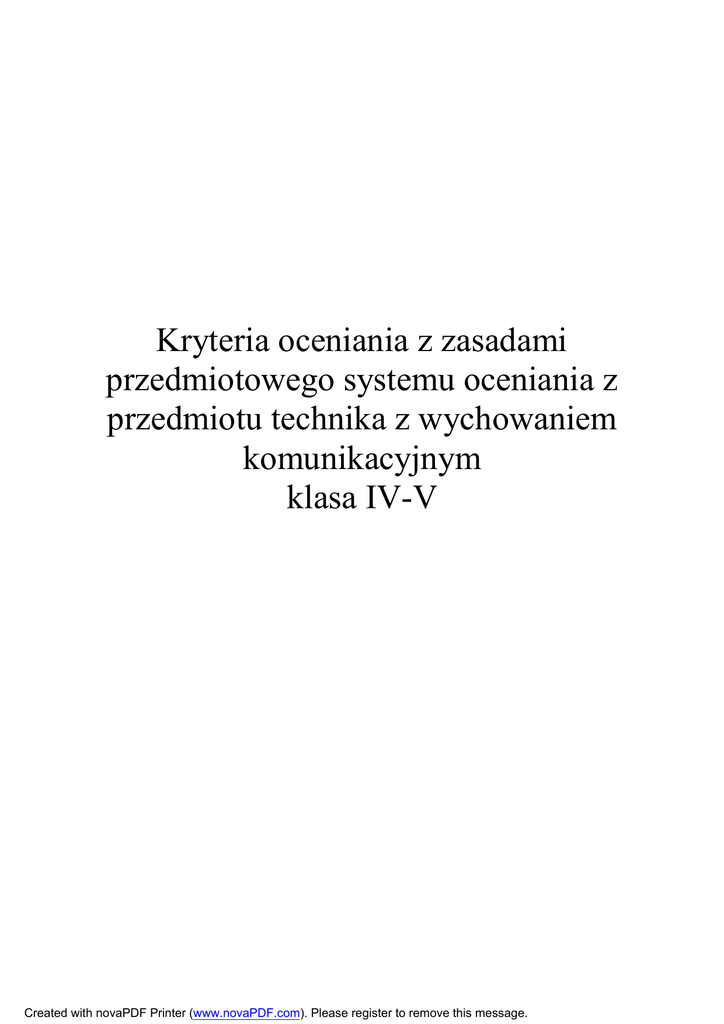 Kryteria oceniania z zasadami przedmiotowego systemu oceniania z przedmiotu technika z wychowaniem komunikacyjnym klasa IV-V Created with novaPDF Printer (www.novaPDF.com). Please register to remove this message. WSTĘP 1. Uczniowie zostają poinformowani o zasadach przedmiotowego systemu oceniania na początku roku szkolnego, a o ewentualnych poprawkach natychmiast po ich wprowadzeniu. 2. Niniejsze kryteria oceniania są zgodne z wewnątrzszkolnym systemem oceniania. 3. Ocenianie osiągnięć edukacyjnych ma na celu: a. poinformowanie ucznia o poziomie jego osiągnięć edukacyjnych i postępach w tym zakresie, b. pomoc uczniowi w samodzielnym planowaniu jego rozwoju, c. motywowanie ucznia do dalszej pracy, d. dostarczenie rodzicom i nauczycielom informacji o postępach, trudnościach i specjalnych uzdolnieniach ucznia. 4. Ocenie podlegają następujące obszary aktywności uczniów: a. porozumiewanie się językiem technicznym, b. rozwiązywanie problemów, c. obsługa narzędzi i urządzeń technicznych, d. stosowanie wiedzy przedmiotowej w sytuacjach praktycznych, e. aktywność na zajęciach, f. wkład pracy, zaangażowanie w podejmowane działania, g. praca w grupie, h. działalność pozaszkolna. 5. Najczęściej stosowane sposoby sprawdzania osiągnięć uczniów: a. formy ustne: odpowiedzi, aktywność na zajęciach, prezentacja, b. formy praktyczne: prace wytwórcze (indywidualne, zespołowe), ćwiczenia praktyczne, c. zeszyt przedmiotowy, zeszyt ćwiczeń, d. obserwacja pracy uczniów, e. formy pisemne: klasówki, sprawdziany, f. samoocena pracy własnej. KRYTERIA USTALANIA OCENY 1. Przy ocenianiu zajęć praktycznych będą brane pod uwagę: a. przygotowanie stanowiska pracy i przestrzeganie zasad BHP, b. organizacja pracy, c. ład i porządek na stanowisku pracy, d. sprawność w posługiwaniu się narzędziami, e. oszczędne gospodarowanie materiałami, f. estetyka wykonanej pracy, g. samodzielność pracy. 2. Przy ocenianiu prac pisemnych będą brane pod uwagę: a. spójność merytoryczna i językowa wypowiedzi, b. zastosowanie właściwego języka przedmiotu, c. dbałość o poprawność użycia języka ojczystego, d. prawidłowość i estetyka wykonanych rysunków. 3. Przy ocenianiu prac dodatkowych będą brane pod uwagę: a. pomysłowość, inwencja twórcza i nowatorstwo, b. samodzielność, zaangażowanie oraz ilość włożonej pracy, c. różnorodność zastosowanych materiałów i technik. Created with novaPDF Printer (www.novaPDF.com). Please register to remove this message. POZIOMY WYMAGAŃ PROGRAMOWYCH ocena celujący bardzo dobry dobry dostateczny dopuszczający wymagania Wiadomości i umiejętności znacznie wykraczające poza materiał nauczania w danej klasie, charakterystyczne dla ucznia o indywidualnych zainteresowaniach, nie dające opisać się w zestaw ścisłych określonych kryteriów Wiadomości i umiejętności trudne do opanowania, najbardziej złożone, twórcze i oryginalne, wymagają stosowania w sytuacjach problemowych, korzystania z różnorodnych źródeł informacji Wiadomości i umiejętności średnio trudne, umiarkowanie przystępne, bardziej złożone i mniej typowe, przydatne, ale nie niezbędne na dalszym etapie kształcenia, pośrednio użyteczne w życiu Wiadomości i umiejętności stosunkowo łatwe, bezpośrednio użyteczne w życiu codziennym, najpewniejsze naukowo i najbardziej niezawodne, niezbędne na danym etapie kształcenia, proste i uniwersalne Wiadomości i umiejętności najprostsze, potrzebne w życiu, które umożliwiają uczniowi świadome korzystanie z lekcji UMOWY I UZGODNIENIA 1. Uczeń może być nieprzygotowany do lekcji z powodów osobistych, ale musi to być udokumentowane przez rodzica lub prawnego opiekuna 2. Brak zeszytu, podręcznika, wykazanie się nieprzygotowanie może zostać ukarane znakiem „minus”; uzyskanie przez ucznia trzykrotnego znaku „minus” jest równoważne z uzyskaniem oceny niedostatecznej 3. Duża aktywność ucznia podczas zajęć lekcyjnych lub poza nimi może zostać nagrodzona oceną bardzo dobrą lub znakiem „plus”; trzykrotne uzyskanie znaku „plus” powoduje uzyskanie oceny bardzo dobrej 4. Reprezentowanie szkoły w konkursach i olimpiadach przedmiotowych pozwala uzyskać ocenę bardzo dobrą za każdy udział, a ocenę celującą za zajęcie miejsca punktowanego lub wyróżnienia 5. Rodzice i uczniowie mają obowiązek zgłosić nauczycielowi wszelkie przeciwwskazania do czynnego udziału w lekcjach techniki 6. Uczeń ma prawo poprawić ocenę cząstkową w formie i terminie uzgodnionym z nauczycielem 7. Uczeń ma obowiązek przestrzegania regulaminu pracowni technicznej, w przypadku jego łamania może być ukarany znakiem „minus” lub w skrajnych przypadkach otrzymaniem oceny niedostatecznej. Opracował mgr Grzegorz Cymerman Created with novaPDF Printer (www.novaPDF.com). Please register to remove this message.