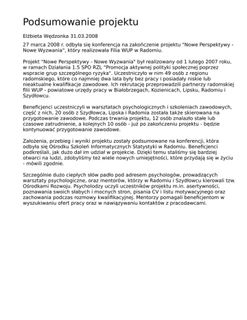 Podsumowanie projektu Elżbieta Wędzonka 31.03.2008 27 marca 2008 r. odbyła się konferencja na zakończenie projektu "Nowe Perspektywy Nowe Wyzwania", który realizowała Filia WUP w Radomiu. Projekt "Nowe Perspektywy - Nowe Wyzwania" był realizowany od 1 lutego 2007 roku, w ramach Działania 1.5 SPO RZL "Promocja aktywnej polityki społecznej poprzez wspracie grup szczególnego ryzyka". Uczestniczyło w nim 49 osób z regionu radomskiego, które co najmniej dwa lata były bez pracy i posiadały niskie lub nieaktualne kwalifikacje zawodowe. Ich rekrutację przeprowadzili partnerzy radomskiej filii WUP - powiatowe urzędy pracy w Białobrzegach, Kozienicach, Lipsku, Radomiu i Szydłowcu. Beneficjenci uczestniczyli w warsztatach psychologicznych i szkoleniach zawodowych, część z nich, 20 osób z Szydłowca, Lipska i Radomia została także skierowana na przygotowanie zawodowe. Podczas trwania projektu, 12 osób znalazło stałe lub czasowe zatrudnienie, a kolejnych 10 osób - już po zakończeniu projektu - będzie kontynuować przygotowanie zawodowe. Założenia, przebieg i wyniki projektu zostały podsumowane na konferencji, która odbyła się Ośrodku Szkoleń Informatycznych Statystyki w Radomiu. Beneficjenci podkreślali, jak dużo dał im udział w projekcie. Dzięki temu staliśmy się bardziej otwarci na ludzi, zdobyliśmy też wiele nowych umiejętności, które przydają się w życiu - mówili zgodnie. Szczególnie dużo ciepłych słów padło pod adresem psychologów, prowadzących warsztaty psychologiczne, oraz mentorów, którzy w Radomiu i Szydłowcu kierowali tzw. Ośrodkami Rozwoju. Psycholodzy uczyli uczestników projektu m.in. asertywności, poznawania swoich słabych i mocnych stron, pisania CV i listu motywacyjnego oraz zachowania podczas rozmowy kwalifikacyjnej. Mentorzy pomagali beneficjentom w wyszukiwaniu ofert pracy oraz w nawiązywaniu kontaktów z pracodawcami.