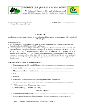 ............................................................ ( Pieczęć firmowa pracodawcy) Kraków, dnia………………….……. WNIOSEK o dofinansowanie wynagrodzenia za zatrudnienie skierowanego bezrobotnego, który ukończył 50 rok życia Podstawa prawna: 1. art. 60 d ustawy z dnia 20 kwietnia 2004r. o promocji zatrudnienia i instytucjach rynku pracy (tekst jedn. Dz. U. z 2015 r., poz. 149 z późn.zm.) 2. rozporządzenie Komisji (UE)nr 1407/2013 z 18 grudnia 2013r. w sprawie stosowania art. 107 i 108 Traktatu o funkcjonowaniu Unii Europejskiej do pomocy de minimis (Dz. Urz. UE L 352 z 24.12.2013, str. 1), rozporządzenie Komisji (UE) nr 1408/2013 z 18 grudnia 2013r. w sprawie stosowania art. 107 i 108 Traktatu o funkcjonowaniu Unii Europejskiej do pomocy de minimis w sektorze rolnym (Dz. Urz. UE L 352 z 24.12.2013, str. 9) lub we właściwych przepisach prawa Unii Europejskiej dotyczących pomocy de minimis w sektorze rybołówstwa i akwakultury. A. DANE DOTYCZĄCE WNIOSKODAWCY 1. Nazwa pracodawcy lub przedsiębiorcy…............................................................................ 2. Adres siedziby……………………...................................................................................... 3. Miejsce prowadzenia działalności…………………………………………………… 4. NIP...................................................................................... 5. REGON …………………………….................................. 6. Oznaczenie formy organizacyjno-prawnej prowadzonej działalności ………………………………………………................................................................... 7. Wielkość podmiotu ubiegającego się o pomoc: Mikro Mały Średni Inny właściwe zakreślić X 8. Numer rachunku bankowego................................................................................................ 9. Osoba upoważniona do podpisania umowy (ZGODNIE Z DOKUMENTEM REJESTROWYM) …………………………………………………………………................................................ (imię i nazwisko, stanowisko/funkcja, nr telefonu, EMAIL) 10. Osoba wyznaczona przez podmiot do kontaktu z Grodzkim Urzędem Pracy …................................................................................................................................................ . (imię i nazwisko, stanowisko/funkcja,nr telefonu) B. INFORMACJE DOTYCZĄCE DOFINANSOWANIA WYNAGRODZENIA 1. Zgłaszam zapotrzebowanie na zatrudnienie ………… bezrobotnego/ych, który/e ukończył/y 50 lat, (liczba osób) a nie ukończył/y 60 lat. 2. Zgłaszam zapotrzebowanie na zatrudnienie …………… bezrobotnego/ych, który/e ukończył/y 60 lat. (liczba osób) 3. Osoby bezrobotne zostaną zatrudnione w okresie: od………………………………………do…………...……………… w pełnym wymiarze czasu pracy. 4. Miejsce i rodzaj prac (nazwa stanowiska), które mają być wykonywane przez skierowanego/ych bezrobotnego/ych: …………………………………………………………………………………………………………… …………………………………………………………………………………………………………… 5. Niezbędne lub pożądane kwalifikacje oraz inne wymogi (w tym poziom i kierunek wykształcenia): …………………………………………………………………………………………………………… …………………………………………………………………………………………………………… 6. Wysokość proponowanego wynagrodzenia brutto dla skierowanego/ych bezrobotnego/ych: ………………zł/m-c . 7. Termin wypłaty wynagrodzenia (proszę zaznaczyć znakiem X właściwą odpowiedź): a) do ostatniego dnia miesiąca za miesiąc bieżący: b) do 10 dnia miesiąca za miesiąc poprzedni : 8. Wnioskowany okres dofinansowania od ……...........do ....................( proponowany okres podać w miesiącach). 9. Wnioskowana wysokość dofinansowania wynagrodzenia: …………………………… zł/m-c . Po upływie okresu przysługiwania dofinansowania dalsze zatrudnienie(a) .........osoby/ób bezrobotnych skierowanych przez PUP nastąpi na okres:* co najmniej 6 miesięcy – osoby 50+ co najmniej 12 miesięcy – osoby 60+ *właściwe zakreślić X OŚWIADCZENIE 1. Stan zatrudnienia na dzień złożenia wniosku w przeliczeniu na pełen etat wynosi : ………………etaty/ów. (dotyczy wyłącznie osób zatrudnionych na umowę o pracę). W okresie 6 miesięcy przed dniem złożenia wniosku: a/. nie uległ zmniejszeniu wymiar czasu pracy zatrudnianych pracowników oraz b/. nie rozwiązano stosunku pracy z pracownikiem: - w drodze wypowiedzenia dokonanego przez podmiot, - bądź na mocy porozumienia stron z przyczyn niedotyczących pracowników. 2. Toczy/nie toczy* się w stosunku do parcodawcy lub przedsiębiorcy postępowanie upadłościowe i został/nie został* zgłoszony wniosek o likwidację . 3. W okresie 365 dni przed dniem zgłoszenia oferty pracy zostałem / nie zostałem * skazany prawomocnym wyrokiem za naruszenie praw pracowniczych i jestem / nie jestem * objęty postępowaniem wyjaśniającym w tej sprawie. 4. Zapoznałem się z informacją dotyczącą dofinansowania wynagrodzenia za zatrudnienie skierowanego bezrobotnego który ukończył 50 rok życia. 5. Pracodawca/przedsiębiorca zalega / nie zalega* z zapłatą wynagrodzeń pracowników oraz należnych składek na ubezpieczenia społeczne, zdrowotne, Fundusz Pracy, Fundusz Gwarantowanych Świadczeń Pracowniczych oraz innych danin publicznych. 6. Pracodawca /przedsiębiorca otrzymał/ nie otrzymał* pomocy de minimis oraz pomocy de minimis w rolnictwie/w rybołówstwie* w wysokości ……………….. w roku, w którym ubiega się o pomoc oraz w ciągu 2 poprzedzających go lat obrotowych; 7. P