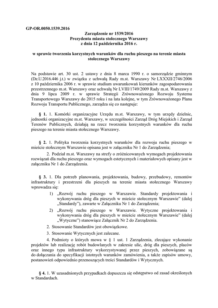 GP-OR.0050.1539.2016 Zarządzenie nr 1539/2016 Prezydenta miasta stołecznego Warszawy z dnia 12 października 2016 r. w sprawie tworzenia korzystnych warunków dla ruchu pieszego na terenie miasta stołecznego Warszawy Na podstawie art. 30 ust. 2 ustawy z dnia 8 marca 1990 r. o samorządzie gminnym (Dz.U.2016.446 j.t.) w związku z uchwałą Rady m.st. Warszawy Nr LXXXII/2746/2006 z 10 października 2006 r. w sprawie studium uwarunkowań kierunków zagospodarowania przestrzennego m.st. Warszawy oraz uchwałą Nr LVIII/1749/2009 Rady m.st. Warszawy z dnia 9 lipca 2009 r. w sprawie Strategii Zrównoważonego Rozwoju Systemu Transportowego Warszawy do 2015 roku i na lata kolejne, w tym Zrównoważonego Planu Rozwoju Transportu Publicznego, zarządza się co następuje: § 1. 1. Komórki organizacyjne Urzędu m.st. Warszawy, w tym urzędy dzielnic, jednostki organizacyjne m.st. Warszawy, w szczególności Zarząd Dróg Miejskich i Zarząd Terenów Publicznych, działają na rzecz tworzenia korzystnych warunków dla ruchu pieszego na terenie miasta stołecznego Warszawy. § 2. 1. Polityka tworzenia korzystnych warunków dla rozwoju ruchu pieszego w mieście stołecznym Warszawie opisana jest w załączniku Nr 1 do Zarządzenia; 2. Podział m.st. Warszawy na strefy o zróżnicowanych wymogach projektowania rozwiązań dla ruchu pieszego oraz wymogach estetycznych i materiałowych opisany jest w załączniku Nr 1 do Zarządzenia. § 3. 1. Dla potrzeb planowania, projektowania, budowy, przebudowy, remontów infrastruktury i przestrzeni dla pieszych na terenie miasta stołecznego Warszawy wprowadza się: 1) „Rozwój ruchu pieszego w Warszawie. Standardy projektowania i wykonywania dróg dla pieszych w mieście stołecznym Warszawie” (dalej „Standardy”), zawarte w Załączniku Nr 1 do Zarządzenia; 2) „Rozwój ruchu pieszego w Warszawie. Wytyczne projektowania i wykonywania dróg dla pieszych w mieście stołecznym Warszawie” (dalej „Wytyczne”) stanowiące Załącznik Nr 2 do Zarządzenia. 2. Stosowanie Standardów jest obowiązkowe. 3. Stosowanie Wytycznych jest zalecane. 4. Podmioty o których mowa w § 1 ust. 1 Zarządzenia, zlecające wykonanie projektów lub realizację robót budowlanych w zakresie ulic, dróg dla pieszych, placów oraz innego typu infrastruktury wykorzystywanej przez pieszych, zobowiązane są do dołączania do specyfikacji istotnych warunków zamówienia, a także zapisów umowy, postanowień odpowiednio przenoszących treści Standardów i Wytycznych. § 4. 1. W uzasadnionych przypadkach dopuszcza się odstępstwo od zasad określonych w Standardach. 2. Zgody na odstępstwo udziela Dyrektor Biura Drogownictwa i Komunikacji Urzędu m.st. Warszawy, po zasięgnięciu opinii Dyrektora Biura Architektury i Planowania Przestrzennego Urzędu m.st. Warszawy, oraz Dyrektora Biura Stołecznego Konserwatora Zabytków Urzędu m.st. Warszawy w przypadku obszarów objętych ochroną konserwatorską. 3. Pisemny wniosek o odstępstwo składa inwestor w sekretariacie Biura Drogownictwa i Komunikacji. Wniosek powinien zawierać opis problemu wymagającego odstępstwa, uzasadnienie ubiegania się o odstępstwo oraz opis proponowanego rozwiązania. § 5. Wykonanie zarządzenia powierza się Zastępcy Prezydenta m.st. Warszawy prowadzącemu zadania z zakresu drogownictwa i komunikacji. § 6. Zarządzenie wchodzi w życie w terminie 30 dni od dnia ogłoszenia. Prezydent Miasta Stołecznego Warszawy /-/ Hanna Gronkiewicz-Waltz