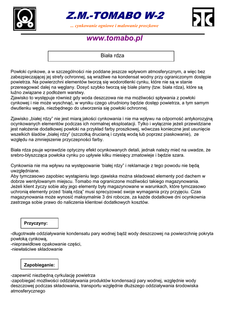 Z.M.-TOMABO W-2 ... cynkowanie ogniowe i malowanie proszkowe www.tomabo.pl Biała rdza Powłoki cynkowe, a w szczególności nie poddane jeszcze wpływom atmosferycznym, a więc bez zabezpieczającej jej strefy ochronnej, są wrażliwe na kondensat wodny przy ograniczonym dostępie powietrza. Na powierzchni elementów tworzą się wodorotlenki cynku, które nie są w stanie przereagować dalej na węglany. Dosyć szybko tworzą się białe plamy (tzw. biała rdza), które są luźno związane z podłożem warstwy. Zjawisko to występuje również gdy woda deszczowa nie ma możliwości spływania z powłoki cynkowej i nie może wyschnąć, w wyniku czego utrudniony będzie dostęp powietrza, a tym samym dwutlenku węgla, niezbędnego do utworzenia się powłoki ochronnej. Zjawisko „białej rdzy” nie jest miarą jakości cynkowania i nie ma wpływu na odporność antykorozyjną ocynkowanych elementów podczas ich normalnej eksploatacji. Tylko i wyłącznie jeżeli przewidziane jest nałożenie dodatkowej powłoki na przykład farby proszkowej, wówczas konieczne jest usunięcie wszelkich śladów „białej rdzy” (szczotką drucianą i czystą wodą lub poprzez piaskowanie), ze względu na zmniejszenie przyczepności farby. Biała rdza psuje wprawdzie optyczny efekt ocynkowanych detali, jednak należy mieć na uwadze, że srebro-błyszcząca powłoka cynku po upływie kilku miesięcy zmatowieje i będzie szara. Cynkownia nie ma wpływu na występowanie ‘białej rdzy” i reklamacje z tego powodu nie będą uwzględniane. Aby tymczasowo zapobiec wystąpieniu tego zjawiska można składować elementy pod dachem w dobrze wentylowanym miejscu. Tomabo ma ograniczone możliwości takiego magazynowania. Jeżeli klient życzy sobie aby jego elementy były magazynowane w warunkach, które tymczasowo uchronią elementy przed ‘białą rdzą” musi sprecyzować swoje wymagania przy przyjęciu. Czas magazynowania może wynosić maksymalnie 3 dni robocze, za każde dodatkowe dni ocynkownia zastrzega sobie prawo do naliczenia klientowi dodatkowych kosztów. Przyczyny: -długotrwałe oddziaływanie kondensatu pary wodnej bądź wody deszczowej na powierzchnię pokryta powłoką cynkową, -nieprawidłowe opakowanie części, -niewłaściwe składowanie Zapobieganie: -zapewnić niezbędną cyrkulację powietrza -zapobiegać możliwości oddziaływania produktów kondensacji pary wodnej, względnie wody deszczowej podczas składowania, transportu względnie dłuższego oddziaływania środowiska atmosferycznego