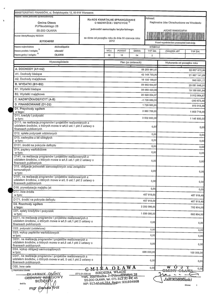 MINISTERSTWO FINANS6W, ul. Swi?tokrzyska 12, 00-916 Warszawa Nazwa i adres jednostki sprawozdawczej Gmina Otawa Pl.PHsudskiego 28 55-200 OtAWA Numer identyfikaoyjny REGON Adresat: Rb-NDS KWARTALNE SPRAWOZDANIE 0 NADWYZCE / DEFICYCIE 1) Regionalna izba Obrachunkowa we Wroctawiu jednostki samorz^du terytorialnego A5D9E18983E23F91 za okres od pocza_tku roku do dnia 30 czerwca roku 2012 931934868 Przed wypetnieniem przeczytac instrukcje SYMBOLS Nazwa wojewodztwa dolno^f^skfe Nazwa powiatu / zwi^zku o/a wski WOJ. POWIAT GMINA TYP GM. Nazwa gminy / zwi^ku " OtAWA 02 16 04 2 Plan (po zmianach) Wyszczegolnienie ZWIA2 EK JST TYP ZW. Wykonanie od poczatku roku A. DOCHODY (A1+A2) 58253961,97 22 837 972,86 A1. Dochody biezqce 42 148 793,90 21 997 141,69 A2. Dochody majqtkowe 16105168,07 840831,17 B.WYDATKi(B1+B2) 59 982 644,97 23 081 646,31 B1. Wydatkibieza.ce 39 059 420,90 19168691,64 B2. Wydatki majatkowe 20 923 224,07 3912954,67 C. NADWYZKA/DEFICYT (A-B) -1 728 683,00 -243 673,45 1 728 683,00 810915,49 3 960 769,00 1 603719,49 3 502 850,00 1 145 800,00 ( D. FINANSOWANIE (D1-D2) D1. Przychody ogotem ztego: D1 1 . kredyty i pozyczki wtym: D1 1 1 . na realizacje programow i projektow realizowanych z udziatem srodkow, o ktorych mowa w art.5 ust.1 pkt 2 ustawy o finansach pubiicznych D12. sp-tata pozyczek udzielonych D13. nadwyzka z lat ubiegfych wtym: D131. srodki na pokrycie deficytu D14. papiery wartosciowe wtym: D141. na realizacje programow i projektow realizowanych z udziatem srodkow, o ktorych mowa w art.5 ust.1 pkt 2 ustawy o finansach pubiicznych D15. obligacje jednostek samorzqdowych orazzwiazkow komunalnych wtym: D151. na realizacje programow i projektow realizowanych z udziatem srodkow, o ktorych mowa w art. 5 ust.1 pkt 2 ustawy o finansach pubiicznych [01 6. prywatyzacja majajku jst FD17. innezrodta wtym: D171. srodki na pokrycie deficytu D2. Rozchody ogotem z tego: D21. spfaty kredytow i pozyczek wtym: D211. na realizacje programow i projektow realizowanych z udziatem srodkow, o ktorych mowa w art.5 ust.1 pkt 2 ustawy o finansach pubiicznych D22. pozyczki (udzielone) D23. wykup papierow wartosciowych wtym: D231. na realizacje programow i projektow realizowanych z udziatem srodkow, o ktorych mowa w art.5 ust.1 pkt 2 ustawy o finansach pubiicznych D24. wykup obligacji sarmorzadowych wtym: D241. na realizacje programow i projektow realizowanych z udziatem srodkow, o ktorych mowa w art. 5 ust.1 pkt 2 ustawy o finansach pubiicznych D25. inne cele ^ -^ -j- -j J A 1 nlepotrzeone SKresnc r,,, A r ^ n x i r f /-1K/IMV •*-f071 131-330-44 0,00 0,00 0,00 0,00 0,00 0,00 0,00 0,00 0,00 0,00 0,00 0,00 0,00 0,00 0,00 0,00 0,00 0,00 457919,00 457919,49 457919,00 457919,49 2 232 086,00 792 804,00 1 536 086,00 692 804,00 0,00 0,00 0,00 0,00 0,00 0,00 0,00 0,00 696 000,00 100000,00 0,00 O fc AW A aTTTTl'/.T'RA. WHiADZ &1&LJL1LU'-'^mxjW-dfl OQ teiejM.. jviai'szalka J. * ""rva;^c a™ 45 55-200 OtAWA,tel. 0713i^f.^'^8 NIP: 912^fe^^n: 931934868 0,00 0,00 W 6 J I <-l^<-TT.TTr <-i ^ •*•'•*"" * •*• \S\^r *_ v_ /^T. ooo ATITA x^^-t^j...^ Wt \^ ^