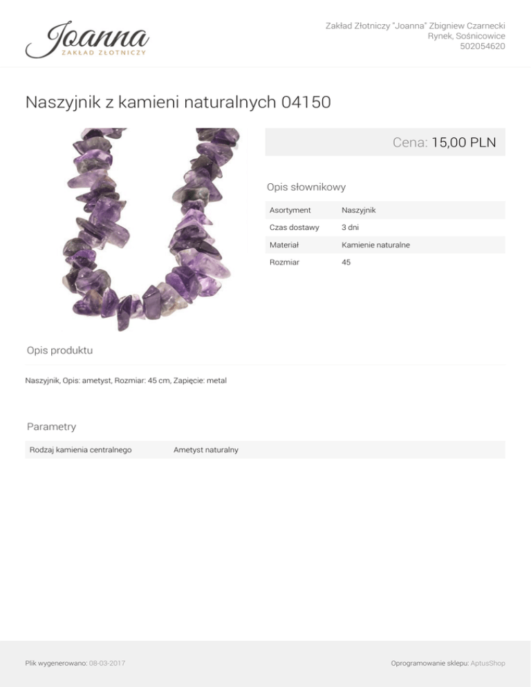 Zakład Złotniczy "Joanna" Zbigniew Czarnecki Rynek, Sośnicowice 502054620 Naszyjnik z kamieni naturalnych 04150 Cena: 15,00 PLN Opis słownikowy Asortyment Naszyjnik Czas dostawy 3 dni Materiał Kamienie naturalne Rozmiar 45 Opis produktu Naszyjnik, Opis: ametyst, Rozmiar: 45 cm, Zapięcie: metal Parametry Rodzaj kamienia centralnego Plik wygenerowano: 08-03-2017 Powered by TCPDF (www.tcpdf.org) Ametyst naturalny Oprogramowanie sklepu: AptusShop