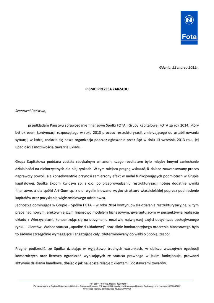 Gdynia, 23 marca 2015r. PISMO PREZESA ZARZĄDU Szanowni Państwo, przedkładam Państwu sprawozdanie finansowe Spółki FOTA i Grupy Kapitałowej FOTA za rok 2014, który był okresem kontynuacji rozpoczętego w roku 2013 procesu restrukturyzacji, zmierzającego do ustabilizowania sytuacji, w której znalazła się nasza organizacja poprzez ogłoszenie przez Sąd w dniu 13 września 2013 roku jej upadłości z możliwością zawarcia układu. Grupa Kapitałowa poddana została radykalnym zmianom, czego rezultatem było między innymi zaniechanie działalności na niekorzystnych dla niej rynkach. W tym miejscu pragnę wskazać, iż dalece zaawansowany proces naprawczy powoli, ale konsekwentnie przynosi zamierzony efekt w nadal funkcjonujących podmiotach w Grupie kapitałowej. Spółka Expom Kwidzyn sp. z o.o. po przeprowadzeniu restrukturyzacji notuje dodatnie wyniki finansowe, a dla spółki Art-Gum sp. z o.o. wyeliminowano ryzyko struktury właścicielskiej poprzez podniesienie kapitałów oraz pozyskanie większościowego udziałowca. Jednostka dominująca w Grupie – Spółka FOTA – w roku 2014 kontynuowała działania restrukturyzacyjne, w tym prace nad nowym, efektywniejszym finansowo modelem biznesowym, gwarantującym w perspektywie realizację układu z Wierzycielami, koncentrując się na utrzymaniu możliwie największej części dotychczas obsługiwanego rynku i klientów. Wobec statusu „upadłości układowej” oraz silnie konkurencyjnego otoczenia biznesowego było to zadanie szczególnie wymagające i angażujące cały, zdeterminowany do walki o Spółkę, zespół. Pragnę podkreślić, że Spółka działając w wyjątkowo trudnych warunkach, w obliczu wszczętych egzekucji komorniczych oraz licznych ograniczeń wynikających ze statusu prawnego w jakim funkcjonuje, prowadzi aktywnie działania handlowe, dbając o jak najlepsze relacje z klientami i dostawcami towarów. NIP 589-17-50-856, Regon: 192598184 Zarejestrowana w Sądzie Rejonowym Gdańsk – Północ w Gdańsku, VIII Wydział Gospodarczy Krajowego Rejestru Sądowego pod numerem 0000047702 Wysokość kapitału zakładowego 18.832.000,00 zł Spółka na bieżąco reguluje zobowiązania powstałe po dacie 13 września 2013 roku, zobowiązania publicznoprawne oraz zobowiązania pracownicze. Założona w roku 2013 i wprowadzona w 2014 optymalizacja kosztowa związana z wdrożeniem projektów w obszarze IT oraz logistyki przyniosła realne oszczędności. Na koniec pragnę dodać, iż Spółka FOTA prowadzi proces upadłościowy z najwyższą starannością. Utrzymuje bieżący kontakt z Tymczasowym Nadzorcą Sądowym, prowadzi regularną i terminową sprawozdawczość oraz dba o prawidłowe z relacje i dobrą współpracę dla dobra Spółki i jej Wierzycieli. Żywię nadzieję, że zmiany jakim została poddana i jest poddawana nadal Spółka, jej potencjał oraz walka zdeterminowanego zespołu o organizację, doprowadzą w konsekwencji do możliwie szybkiej zmiany statusu prawnego Spółki FOTA. Jakub Fota Prezes Zarządu FOTA S.A. w upadłości układowej NIP 589-17-50-856, Regon: 192598184 Zarejestrowana w Sądzie Rejonowym Gdańsk – Północ w Gdańsku, VIII Wydział Gospodarczy Krajowego Rejestru Sądowego pod numerem 0000047702 Wysokość kapitału zakładowego 18.832.000,00 zł