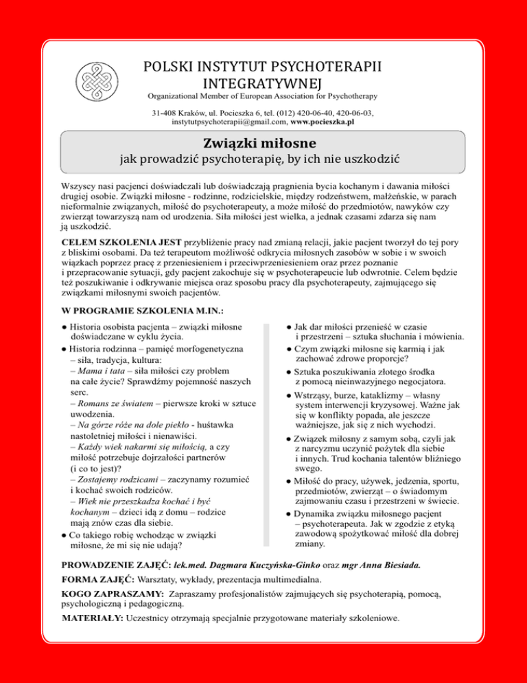 POLSKI INSTYTUT PSYCHOTERAPII INTEGRATYWNEJ Organizational Member of European Association for Psychotherapy 31-408 Kraków, ul. Pocieszka 6, tel. (012) 420-06-40, 420-06-03, [email protected], www.pocieszka.pl Związki miłosne jak prowadzić psychoterapię, by ich nie uszkodzić Wszyscy nasi pacjenci doświadczali lub doświadczają pragnienia bycia kochanym i dawania miłości drugiej osobie. Związki miłosne - rodzinne, rodzicielskie, między rodzeństwem, małżeńskie, w parach nieformalnie związanych, miłość do psychoterapeuty, a może miłość do przedmiotów, nawyków czy zwierząt towarzyszą nam od urodzenia. Siła miłości jest wielka, a jednak czasami zdarza się nam ją uszkodzić. CELEM SZKOLENIA JEST przybliżenie pracy nad zmianą relacji, jakie pacjent tworzył do tej pory z bliskimi osobami. Da też terapeutom możliwość odkrycia miłosnych zasobów w sobie i w swoich wiązkach poprzez pracę z przeniesieniem i przeciwprzeniesieniem oraz przez poznanie i przepracowanie sytuacji, gdy pacjent zakochuje się w psychoterapeucie lub odwrotnie. Celem będzie też poszukiwanie i odkrywanie miejsca oraz sposobu pracy dla psychoterapeuty, zajmującego się związkami miłosnymi swoich pacjentów. W PROGRAMIE SZKOLENIA M.IN.: ● Historia osobista pacjenta – związki miłosne doświadczane w cyklu życia. ● Historia rodzinna – pamięć morfogenetyczna – siła, tradycja, kultura: – Mama i tata – siła miłości czy problem na całe życie? Sprawdźmy pojemność naszych serc. – Romans ze światem – pierwsze kroki w sztuce uwodzenia. – Na górze róże na dole piekło - huśtawka nastoletniej miłości i nienawiści. – Każdy wiek nakarmi się miłością, a czy miłość potrzebuje dojrzałości partnerów (i co to jest)? – Zostajemy rodzicami – zaczynamy rozumieć i kochać swoich rodziców. – Wiek nie przeszkadza kochać i być kochanym – dzieci idą z domu – rodzice mają znów czas dla siebie. ● Co takiego robię wchodząc w związki miłosne, że mi się nie udają? ● Jak dar miłości przenieść w czasie i przestrzeni – sztuka słuchania i mówienia. ● Czym związki miłosne się karmią i jak zachować zdrowe proporcje? ● Sztuka poszukiwania złotego środka z pomocą nieinwazyjnego negocjatora. ● Wstrząsy, burze, kataklizmy – własny system interwencji kryzysowej. Ważne jak się w konflikty popada, ale jeszcze ważniejsze, jak się z nich wychodzi. ● Związek miłosny z samym sobą, czyli jak z narcyzmu uczynić pożytek dla siebie i innych. Trud kochania talentów bliźniego swego. ● Miłość do pracy, używek, jedzenia, sportu, przedmiotów, zwierząt – o świadomym zajmowaniu czasu i przestrzeni w świecie. ● Dynamika związku miłosnego pacjent – psychoterapeuta. Jak w zgodzie z etyką zawodową spożytkować miłość dla dobrej zmiany. PROWADZENIE ZAJĘĆ: lek.med. Dagmara Kuczyńska-Ginko oraz mgr Anna Biesiada. FORMA ZAJĘĆ: Warsztaty, wykłady, prezentacja multimedialna. KOGO ZAPRASZAMY: Zapraszamy profesjonalistów zajmujących się psychoterapią, pomocą, psychologiczną i pedagogiczną. MATERIAŁY: Uczestnicy otrzymają specjalnie przygotowane materiały szkoleniowe. TERMIN I CZAS TRWANIA ZAJĘĆ : 28-30 czerwca 2013 (weekend) 23 godziny akademickie JAK SIĘ ZAPISAĆ: 1. 1 ○ ○ ○ 2. ○ ○ Przez stronę www: Wpłać zadatek wysokości 140 zł na konto Instytutu. Wypełnij formularz zgłoszeniowy na www.pocieszka.pl. Potwierdzenie, że zostałeś zapisany i inne potrzebne informacje prześlemy na podany adres e-mail. KOSZT SZKOLENIA: ● płatne w ratach, łącznie: 460 zł ○ ○ 140 zł - zadatek do 28.05.2013 320 zł - do 28.06.2013 (można na zajęciach) ● lub wczesna wpłata ze zniżką: ○ 400 zł - płatne do 29.04.2013 Telefonicznie: Wpłać zadatek i zadzwoń do Instytutu. Podając swoje dane kontaktowe i wykształcenie oraz wybrane szkolenie. Z uwagi na ograniczoną ilość miejsc decyduje kolejność wpłat. WPŁATY NA KONTO: Polski Instytut Psychoterapii Integratywnej (z dopiskiem: „Związki miłosne") ING Bank Śląski 68 1050 1445 1000 0023 1942 2081 INFORMACJE I ZGŁOSZENIA: TEL. (012) 420-06-40, 420-06-03, 698-905-204 [email protected], www.pocieszka.pl lek. med. DAGMARA KUCZYŃSKA-GINKO – lekarz, psychoterapeuta certyfikowany przez Polskie Towarzystwo Psychoterapii Integratywnej i European Association for Psychotherapy (EAP). Superwizor Certyfikowany przez Polską Federację Psychoterapii. Absolwent Studium Psychoterapii Polskiego Instytutu Psychoterapii Integratywnej. Twórca autorskich programów szkoleniowych. Specjalizuje się w leczeniu zaburzeń jedzenia. Poetka i artysta-grafik. Prowadzi prywatną praktykę. mgr ANNA BIESIADA – certyfikowany psychoterapeuta Polskiego Towarzystwa Psychoterapii Integratywnej oraz European Association for Psychotherapy. Superwizor Certyfikowany przez Polską Federację Psychoterapii. Absolwentka Studium Psychoterapii w Instytucie. Stały współpracownik Instytutu, nauczyciel i koordynator programów szkoleniowych. Od ponad 20 lat pracuje w Poradni Psychologiczno-Pedagogicznej, obecnie w szpitalu MSWiA. Specjalizuje się w zaburzeniach osobowości. • W roku 2010 NFZ potwierdził respektowanie Certyfikatów PTP • Uczestnicy szkolenia otrzymają zaświadczenie Polskiego Instytutu Psychoterapii Integratywnej, potwierdzające podniesienie kwalifikacji zawodowych • Nauczyciele mogą otrzymać zaświadczenie NODN „Pocieszka” ukończenia kursu doskonalenia zawodowego • Osoby zakwalifikowane otrzymają pisemne potwierdzenie, informacje organizacyjne oraz informacje na temat noclegów w Krakowie • W przypadku rezygnacji do 2 tygodni przed rozpoczęciem zajęć zwracamy wpłaconą kwotę, pomniejszoną o zadatek i porto •