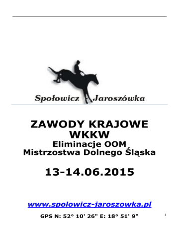 ZAWODY KRAJOWE WKKW Eliminacje OOM Mistrzostwa Dolnego Śląska 13-14.06.2015 www.spolowicz-jaroszowka.pl GPS N: 52° 10' 26" E: 18° 51' 9" 1 WKKW 2015 ZAWODY KRAJOWE ZAWODY REGIONALNE Miejsce: JAROSZÓWKA Data: 13-14.06.2015 Informacje podstawowe Zawody zostaną rozegrane zgodnie z: • Statutem Polskiego Związku Jeździeckiego • Przepisami Ogólnymi Polskiego Związku Jeździeckiego • Regulaminem rozgrywania zawodów krajowych w WKKW Polskiego Związku Jeździeckiego • Przepisami weterynaryjnymi Polskiego Związku Jeździeckiego • FEI Rules for Eventing, 24th Edition 1st January 2015 • Przepisami antydopingowymi Polskiego Związku Jeździeckiego Zatwierdzono w PZJ Warszawa dnia 08.05.2015 Korekta 11.06.2015 2 WKKW 2015 I. Sprawy Organizacyjne 1. Typ Zawodów Klasy: CNC 3* CNC/2* CNC/1* CNC/ P CNC/ L CNC/ LL Kuce PUCHAR POLSKI: ELIMINACJE MISTRZOSTWA POLSKI Kategoria: Seniorzy Młodzi Jeźdźcy Data: 13-14.06.2015 Miejsce : JAROSZÓWKA Region : DOLNOSLĄSKIE FINAŁ MISTRZOSTWA REGIONALNE Juniorzy Juniorzy Młodsi Młodzicy 2. Organizator (kompletny adres) Nazwa: KJ Jaroszówka & Trening Koni Artur Społowicz Adres: Jaroszówka 1a Kod pocztowy: 59-225 Chojnów Telefon: +48 602485114 Email : [email protected] Internet: www.spolowicz-jaroszowka.pl 3. Komitet Organizacyjny Przewodniczący: Andrzej Jakubiak Dyrektor Zawodów: Katarzyna Społowicz Biuro Zawodów: Małgorzata Odyniec Rzecznik Prasowy: Małgorzata Odyniec Dyrektor Techniczny: Artur Społowicz Szef Stajni: Paulina Burdyka 4. Dane kontaktowe na miejscu zawodów: Adres: Jaroszówka 1a, 59-225 Chojnów Tel.: Tel.: +48 602485114 +48 664763054 GPS N: 52° 10' 26" E: 18° 51' 9" 3 WKKW 2015 II. Osoby oficjalne (zgodnie z załącznikiem nr.1 do Regulaminu WKKW 2014) 1. Komisja sędziowska Lp. Imię Nazwisko Funkcja KLASA 1. Jerzy Woźniczko Sędzia Główny zawodów 1*/2* 2. Józef Śnieżek Sędzia 1*/2* 3. Anna AugustyńskaMincger Sędzia L/LL 4. Marek Pawłowicz Sędzia P 5. Krzysztof Ksztoń Sędzia L/LL 6. Justyna Borysewicz-Rudy Sędzia skoki 7. Dorota Kornatowska Asystent Sędzia skoki 2. Delegat Techniczny 1. Delegat Techniczny Imię Nazwisko: 3. Bogusław Jarecki Gospodarz Toru – próba terenowa Imię Nazwisko: Artur Społowicz 4. Gospodarz Toru – próba skoków Imię Nazwisko: 5. Artur Społowicz Komisarze Szef komisarzy Imię Nazwisko: Lucyna Łasica 6. Lekarz weterynarii Zawodów Imię Nazwisko: Michał Kornaszewski Email: [email protected] Tel. : +48 609 283 888 7. Lekarz medycyny zawodów Imię Nazwisko: Medical Rescue Rogojsza Paweł 8. Kowal Imię Nazwisko: Daniel Puzdrakiewicz 4 WKKW 2015 III. 1. Warunki Techniczne Program zawodów KLASA KLASA KLASA KLASA KLASA LL L P 1* 2* Data/Godz Data/Godz Data/Godz Data/Godz Data/Godz Otwarte trasy krosu 1szy Przegląd Koni 1szy Start Ujeżdzenie 12.06. od 16.00 13.06/8.00 13.06/10.00 13.06/12.00 13.06/9.00 13.06/11.00 1szy Start kros 3ci Przegląd Koni 14.06/8.00 14.06/9.00 14.06/11.00 14.06/13.00 14.06/14.30 1szy Start Skoki 13.06/8.30 13.06/10.30 13.06./12.30 13.06/16.00 13.06/17.00 Wręczanie Nagród 14.06 około godz 16.00 Powyższy program zawodów jest wstępny i może ulec zmianie. Uaktualniony program zostanie zamieszczony na stronie www.spolowicz-jaroszowka.pl w dniu 10.06..2015 W przypadku dużej ilości zgłoszeń( ponad 100 w konkursach narodowych) organizator zastrzega sobie prawo rozpoczęcia próby ujeżdżenia w dniu 12.06.2015 w godzinach południowych. Szczegóły zostaną podane po zamknięciu listy zgłoszeń. 2. Ujeżdżenie Klasa LL Klasa L LL WKKW kraj. L WKKW kraj./ El. OOM – kuce, duże konie Klasa P Klasa CNC1* Klasa CNC2* FEI 2009 1* A FEI 2015 1* B FEI 2015 2* B 5 WKKW 2015 3. PRÓBA TERENOWA KLASA LL/ El. OOM-kuce/Regionalne MJMŁ-kuce odcinek Typ podłoża: Długość : Tempo Ilośc skoków D Trawa , piach 1600-2000 Max: 450m/min 12 - 16 KLASA L/El.OOM-duże konie/ Regionalne MJM-duże konie Odcinek Typ podłoża: Długość : Tempo Ilośc skoków D Trawa , piach 1600-2500 470-500 m/min 15 - 20 KLASA P/Regionalne MJ odcinek Typ podłoża: Długość : Tempo Ilośc skoków D Trawa , piach 1600-2800 500 - 520 m/min 20 - 25 KLASA CNC1*/Regionalne MMJ i Regionalne MS odcinek Typ podłoża: Długość : Tempo Ilośc skoków D Trawa , piach 2400-3200 520m/min Max 29 KLASA CNC2* odcinek Typ podłoża: Długość : Tempo Ilośc skoków D Trawa , piach 2800-3600 550m/min Max 32 6 WKKW 2015 4. SKOKI KLASA LL trawa KLASA L trawa KLASA P trawa KLASA CNC1* KLASA CNC2* trawa trawa Dystans (m) 250-400 250-450 300-450 Max 600 Max 600 Tempo (m/min) 300 325 325 Ilośc przeszkód/skoków Ilość przeszkód 9 11 8 8-10 Typ podłoża IV. 350 350 11 14 13 10 10-11/14 10-11/13 Nagrody Miejsce I II III IV SUMA LL Nagr.rzecz Nagr.rzecz Nagr.rzecz Nagr.rzecz L Nagr.rzecz Nagr.rzecz Nagr.rzecz Nagr.rzecz P Nagr.rzecz Nagr.rzecz Nagr.rzecz Nagr.rzecz 1* 2* 400 325 275 200 400 325 275 200 1200 PLN 1200 PLN W przypadku mniejszej ilości startujących niż 10 w danej klasie organizator ma prawo do wypłaty tylko I i II nagrody. Flots dla min 25% koni uczestniczących w konkursie V. ZGŁOSZENIA 1. Terminy zgłoszeń Zgłoszenia ostateczne ( min.10 dni przed ) Data : 02.06.2015 1.1. Zgłaszający ma obowiązek dokonania przedpłaty w wysokości min.250 PLN oraz przesłania dowodu wpłaty (kserokopii) wraz ze zgłoszeniami – dotyczy koni z boksem. 1.2. W przypadku odwołania przyjazdu do 5 dni przed zawodami, przedpłata zostanie zwrócona. Osobom, które wycofają się ze startu w zawodach, na mniej niż 5 dni przed zawodami przedpłata nie zostanie zwrócona. 1.3. Osoby, które zrezygnują ze startu w zawodach na mniej niż 3 dni lub nie przyjadą w ogóle na zawody zobowiązane są do uiszczenie wszelkich opłat wynikających z propozycji zawodów w terminie do 3 dni po zawodach. 1.4. Zgłoszenia po terminie - Organizator ma prawo nie przyjęcia na zawody zawodników - koni, które nie zostały zgłoszone w terminie. Organizator w miarę 7 WKKW 2015 możliwośc