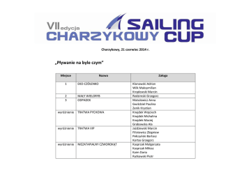 Charzykowy, 21 czerwiec 2014 r. „Pływanie na byle czym” Miejsce Nazwa 1 EKO-CZÓŁENKO 2 3 MAŁY WIELORYB ODPADEK wyróżnienie TRATWA PYCHOWA wyróżnienie TRATWA VIP wyróżnienie NIEZATAPIALNY CZWOROKĄT Załoga Klonowski Adrian Wilk Maksymilian Kroplewski Marcin Redzimski Grzegorz Matulewicz Anna Gwiździel Paulina Zenik Krystian Knajdek Wojciech Knajdek Michalina Knajdek Maciej Grabowska Ala Jażdżewski Marcin Filistowicz Zbigniew Pełczyński Bartosz Kortas Grzegorz Kasprzak Małgorzata Kasprzak Miłosz Kaim Daria Rutkowski Piotr