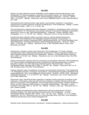 Rok 2009 Attitude of juvenile offenders towards rehablitation and its selected individual determinants / Piotr Kwiatkowski // W: Special pedagogy in researches and scientific analysis / ed. Teresa Żółkowska, Irena Ramik-Mażewska ; University of Stettin. Special Pedagogy Department. - Szczecin : ZAPOL, 2009. - S. 245-251. - Bibliogr. - Recenzenci: prof. dr hab. Władysław Dykcik, dr hab. Józef Binnebesel prof. UMK Neurobehawioralne niepohamowanie i jego relacje z zachowaniami, postawami i motywacjami narkotycznymi w świetle wybranych zmiennych kontekstowych / Piotr Kwiatkowski. - Bibliogr. // Opieka Wychowanie Terapia. - 2009, nr 1-2, s. 28-36 : tab. Poczucie koherencji a eksperymentowanie młodzieży z narkotykami : (perspektywa ryzyka i ochrony) / Piotr Kwiatkowski // W: Poszukiwanie uwarunkowań zaburzeń w zachowaniu młodzieży w interakcjach społecznych / pod red. nauk. Danuty Boreckiej-Biernat. - Wałbrzych : Wydaw. WWSZiP, 2009. (Pedagogika ; nr 1). - S. 133-146 : tab. - Bibliogr. - Recenzent: prof zw. dr hab. Bronisław Urban Samokontrola jako moderator wpływu czynników ryzyka na intencje eksperymentowania z narkotykami / Piotr Kwiatkowski // W: Pedagogika specjalna-koncepcje i rzeczywistość. T 4, Wielowymiarowość edukacji i rehabilitacji osób z niepełnosprawnością / red. Teresa Żółkowska, Irena Ramik-Mażewska ; Uniwersytet Szczeciński. Katedra Pedagogiki Specjalnej. - Szczecin : ZAPOL, 2009. - S. 183-189 : tab. - Bibliogr. - Recenzenci: prof. dr hab. Władysław Dykcik, dr hab. Józef Binnebesel, prof UMK Rok 2008 Asertywność a wybrane czynniki ryzyka narkomanii / Piotr Kwiatkowski // W: Teoria i praktyka resocjalizacyjna wobec współczesnych zachowań dewiacyjnych w Polsce i Republice Czeskiej / red. Adam Szecówka, Bohumil Koukola, Piotr Kwiatkowski. - Wrocław : Wrocławskie Wydaw. Naukowe Atla 2, 2008.- S. 215-223 : tab. - Bibliogr. - Recenzenci: prof. zw. dr hab. Bronisław Urban, Doc.PhDr. Pavel Mühlpachr Deficyty samokontroli w genezie zaburzeń zachowania (na przykładzie narkomanii) / Piotr Kwiatkowski // W: Teoria i praktyka resocjalizacyjna wobec współczesnych zachowań dewiacyjnych w Polsce i Republice Czeskiej / red. Adam Szecówka, Bohumil Koukola, Piotr Kwiatkowski. - Wrocław : Wrocławskie Wydaw. Naukowe Atla 2, 2008.- S. 196-209 : tab. - Bibliogr. - Recenzenci: prof. zw. dr hab. Bronisław Urban, Doc.PhDr. Pavel Mühlpachr Postawa nieletnich wobec resocjalizacji i jej wybrane uwarunkowania indywidualne / Piotr Kwiatkowski // W: Pedagogika specjalna - koncepcje i rzeczywistość : socjopedagogiczne aspekty rehabilitacji osób niepełnosprawnych / (red.) Teresa Żółkowska, Marcin Wlazło. - Szczecin : ZAPOL, 2008. - ([Konteksty Pedagogiki Specjalnej] ; T. 3).- S. 607-613 : tab. - Bibliogr. - Recenzenci: prof. dr hab. Aniela Korzon, prof. dr hab. Helena Łaś, Samoocena, stres i samokontrola jako moderatory w relacjach między wybranymi czynnikami ryzyka narkomanii = Self-esteem, stress and self-control as moderators in relations between selected risk factors for drug abuse / Piotr Kwiatkowski // W: Promocja zdrowia psychicznego : badania i działania w Polsce / pod red. Katarzyny Okulicz-Kozaryn i Krzysztofa Ostaszewskiego. - Warszawa : Instytut Psychiatrii i Neurologii, 2008.- S. 135-153 : tab. - Bibliogr. - Streszcz. w jęz. ang. - Recenzent: prof. dr hab. Czesław Czabała Teoria i praktyka resocjalizacyjna wobec współczesnych zachowań dewiacyjnych w Polsce i Republice Czeskiej / red. Adam Szecówka, Bohumil Koukola, Piotr Kwiatkowski. - Wrocław : Wrocławskie Wydaw. Naukowe Atla 2, 2008. - 310 s. : fot., tab., wykr. - Bibliogr. - S. 11-14 : Wstęp; Suplement S. 301-310 - Recenzenci: prof. zw. dr hab. Bronisław Urban, Doc.PhDr. Pavel Mühlpachr. Publikacja sfinansowana przez Instytut Pedagogiki UWr Rok 2006 Młodzież wobec eksperymentowania z narkotykami : kontekst pedagogiczny : między permisywnością a restryktywnością / Piotr Kwiatkowski // W: Wybrane problemy pedagogiki specjalnej : teoria-diagnoza-terapia / pod red. Małgorzaty Sekułowicz. - Wrocław : Wyd. Nauk. Dolnośląskiej Szkoły Wyższej Edukacji TWP we Wrocławiu, 2006. - S. 63-71. - Bibliogr. - Recenzenci : Marzenna Zaorska, Jacek Błeszyński. Uczestnictwo w kulturze a postawy młodzieży wobec eksperymentowania z narkotykami / Piotr Kwiatkowski. - Bibliogr. // Pedagogika Społeczna. - 2006, nr 2, s. 130-154 Wybrane czynniki interweniujące w sekwencję ryzyka używania substancji psychoaktywnych / Piotr Kwiatkowski // W: Diagnostyka i profilaktyka w teorii i praktyce pedagogicznej / pod red. Marii Deptuły. - Bydgoszcz : Wydaw. Uniwersytetu Kazimierza Wielkiego, 2006.- S. 158-176 : tab. - Bibliogr. Streszcz. w jęz. ang. - Recenzent: prof. dr hab. Jacek Piekarski Rok 2005 Mobbing w kontekście doświadczania przemocy w klasie szkolnej : nowe narzędzie diagnostyczne / Piotr Kwiatkowski, Adam Szecówka. - Załączniki s. 342-345. - Bibliogr. - Streszcz. w jęz. ang. // Szkoła Specjalna. - 2005, nr 5, s. 331-345 Propozycja nowego narzędzia do badania postawy młodzieży wobec eksperymentowania z narkotykami / Piotr Kwiatkowski // W: Diagnostyka, profilaktyka, socjoterapia w teorii i praktyce pedagogicznej / pod. red. Marii Deptuły. - Bydgoszcz : Wydaw. Uniwersytetu Kazimierza Wielkiego, 2005. - (Diagnostyka, Profilaktyka, Socjoterapia ... ; 2). - S. 64-74. - Bibliogr. - Do tekstu właściwego dodano załącznik Rok 2004 Miękkie narkotyki i ich używanie przez młodzież w świetle wybranych teorii / Piotr Kwiatkowski // W: Dewiacyjne aspekty współczesnego świata : przejawy - zapobieganie - terapia / pod red. Małgorzaty Prokosz. - Toruń, 2004. - S. 89-112. - Bibliogr. Związek stresu szkolnego z dolegliwościami zdrowotnymi występującymi w szkole u dzieci w wieku 11-13 lat / Wojciech Bolanowski, Piotr Kwiatkowski, Ludmiła Waszkiewicz. - Bibliogr. - Streszcz. w jęz. ang. // Zdrowie Publiczne. - T. 114, nr 4 (2004), s. 498-501 : tab., wykr. Rok