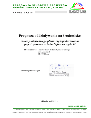 PRACOWNIA STUDIÓW I PROJEKTÓW PROŚRODOWISKOWYCH „LOCUS” PAWEŁ SĄGIN Prognoza oddziaływania na środowisko zmiany miejscowego planu zagospodarowania przestrzennego osiedla Dąbrowa część II Zleceniodawca: Miejskie Biuro Urbanistyczne w Elblągu ul. Łączności 1 82-300 Elbląg autor: mgr Paweł Sągin Gdynia, maj 2011 r. www.locus.com.pl 81-376 Gdynia, ul. Korzeniowskiego 29/6 • tel./fax 0-58-661-72-93 e-mail [email protected] Regon 192632455 • NIP 586-158-80-90 • Konto: ING Bank Śląski S.A. O/Gdynia 03 1050 1764 1000 0022 5851 8998 • Spis treści STRESZCZENIE........................................................................................................................ 2 Wstęp........................................................................................................................................... 4 1. Cel, zakres i podstawy sporządzenia prognozy.................................................................... 4 2. PołoŜenie, dotychczas planowane zagospodarowanie i aktualne uŜytkowanie………..… 6 3. Wybrane cechy środowiska przyrodniczego........................................................................ 9 3.1. Kluczowe komponenty środowiska.................................................................................... 9 3.2. Walory przyrodnicze, konieczny zakres ich ochrony....................................................... 16 3.3. Przyrodnicze powiązania z terenami sąsiednimi, konieczny zakres ich ochrony.......... 17 4. Cechy krajobrazu i walory kulturowe.................................................................................. 17 5. Źródła zagroŜeń i formy degradacji środowiska…………………………………………. 18 6. Obowiązujący i postulowany zakres ochrony środowiska przyrodniczego...................... 19 7. Uwarunkowania zagospodarowania określone w opracowaniu ekofizjograficznym……………………………………………………………………..….. 28 8. Ustalenia projektu miejscowego planu zagospodarowania przestrzennego....................................................................................................................... 28 8.1. Przeznaczenie terenu........................................................................................................... 28 8.2. Infrastruktura techniczna................................................................................................... 29 8.3. Ochrona jakości środowiska, tereny zieleni…………………………………………….. 30 9. Prognoza oddziaływania na środowisko projektu miejscowego planu zagospodarowania przestrzennego...................................................................................... 32 9.1. Zakres zmian funkcji i uŜytkowania terenu, stopień oddziaływania na środowisko........................................................................................................................... 32 9.2. Oddziaływanie ustaleń planu na poszczególne komponenty środowiska……………... 34 9.3. Stopień ochrony przyrody………………………………………………………………... 37 9.4. Oddziaływanie na wartości kulturowe i krajobraz.......................................................... 38 9.5. Zgodność z przepisami dotyczącymi zabezpieczenia wartości przyrodniczych i kulturowych oraz wskazaniami opracowania ekofizjograficznego……………............ 38 10. Metody analizy skutków realizacji postanowień planu………………………..………... 39 11. Kompensacja przyrodnicza, rozwiązania alternatywne…..………………….…………. 39 12. Wnioski.................................................................................................................................. 39 Załączniki: • uzgodnienie RDOŚ-28-WSTE-6613-0006-022/10/gk Regionalnego Dyrektora Ochrony Środowiska z dnia 02.06.2010 r. • opinia sanitarna ZNS-430/16/1/10 Państwowego Powiatowego Inspektora Sanitarnego dla miasta i powiatu Elbląg z dnia 29.05.2010 r. Mapa: PołoŜenie obszaru planu w systemie obszarowych form ochrony przyrody w rejonie Elbląga (1 : 100 000) Mapa: Skutki i warunki realizacji ustaleń miejscowego planu zagospodarowania przestrzennego (1 : 2 000) 1 STRESZCZENIE Opracowanie obejmuje ocenę skutków dla środowiska przyrodniczego, krajobrazu i wartości kulturowych zmiany miejscowego planu zagospodarowania przestrzennego osiedla Dąbrowa część II w Elblągu. Podstawą określenia warunków realizacji ustaleń planu są informacje o komponentach środowiska i ich jakości zawarte w publikacjach i dokumentacjach niepublikowanych oraz wizja terenowa, pozwalająca określić aktualny stan powierzchni ziemi, pokrywy roślinnej, zagospodarowania i uŜytkowania terenu. W przypadku analizowanego projektu planu dane te są wystarczające do przeprowadzenia oceny. Nie prowadzono odrębnych badań. Oddziaływanie na warunki Ŝycia mieszkańców jest ujmowane jako synteza oddziaływań na poszczególne elementy środowiska. Zapisy projektu zmiany planu utrzymują dotychczasowy zasadniczy zestaw funkcji oraz ustalone wcześniej charakter i intensywność zabudowy. Lasy zachowane zostały jako wydzielone tereny w obrębie przecinających obszar planu dolin lub powierzchnie wyłączone z zabudowy w obrębie terenów mieszkaniowo-usługowych. Wyznaczone w dotychczasowym planie, towarzyszące lasom tereny zieleni z funkcją rolną straciły rolniczy charakter i wiodącą na nich stała się funkcja ekologiczna. Funkcja rolna została zachowana jako tymczasowa. Projekt planu zachowuje załoŜenia rozwoju infrastruktury technicznej obsługującej rozwijającą się zabudowę. Zezwala jednak na tymczasowe stosowanie bezodpływowych zbiorników ścieków w sytuacji braku moŜliwości podłączenia zabudowy do istniejącego kolektora, nie później jednak jak do końca 2015 r. UmoŜliwia takŜe lokalizację inwestycji celu
