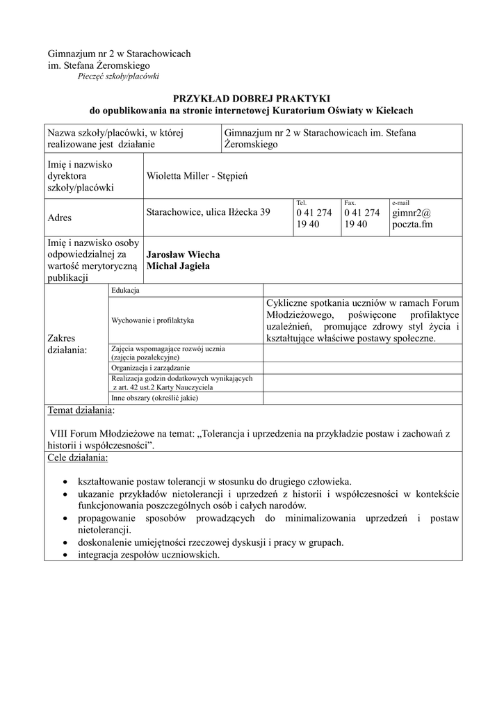 Gimnazjum nr 2 w Starachowicach im. Stefana Żeromskiego Pieczęć szkoły/placówki PRZYKŁAD DOBREJ PRAKTYKI do opublikowania na stronie internetowej Kuratorium Oświaty w Kielcach Nazwa szkoły/placówki, w której realizowane jest działanie Imię i nazwisko dyrektora szkoły/placówki Gimnazjum nr 2 w Starachowicach im. Stefana Żeromskiego Wioletta Miller - Stępień Starachowice, ulica Iłżecka 39 Adres Tel. Fax. e-mail 0 41 274 19 40 0 41 274 19 40 gimnr2@ poczta.fm Imię i nazwisko osoby odpowiedzialnej za Jarosław Wiecha wartość merytoryczną Michał Jagieła publikacji Edukacja Wychowanie i profilaktyka Zakres działania: Cykliczne spotkania uczniów w ramach Forum Młodzieżowego, poświęcone profilaktyce uzależnień, promujące zdrowy styl życia i kształtujące właściwe postawy społeczne. Zajęcia wspomagające rozwój ucznia (zajęcia pozalekcyjne) Organizacja i zarządzanie Realizacja godzin dodatkowych wynikających z art. 42 ust.2 Karty Nauczyciela Inne obszary (określić jakie) Temat działania: VIII Forum Młodzieżowe na temat: „Tolerancja i uprzedzenia na przykładzie postaw i zachowań z historii i współczesności”. Cele działania: kształtowanie postaw tolerancji w stosunku do drugiego człowieka. ukazanie przykładów nietolerancji i uprzedzeń z historii i współczesności w kontekście funkcjonowania poszczególnych osób i całych narodów. propagowanie sposobów prowadzących do minimalizowania uprzedzeń i postaw nietolerancji. doskonalenie umiejętności rzeczowej dyskusji i pracy w grupach. integracja zespołów uczniowskich. Opis działania: Przeprowadzone zajęcia miały charakter debaty. Złożone były z dwóch części. Pierwsza miała formę warsztatową. Uczestnicy spotkania po zapoznaniu się z opisem sytuacji dotyczącej nietolerancji, wyjaśniali znaczenie pojęć: dyskryminacja i uprzedzenie. Następnie podzieleni na zespoły pracowali techniką zdań niedokończonych, szukając odpowiedzi na pytanie: Czym dla mnie jest uprzedzenie? Po zaprezentowaniu pracy zespołowej, uczniowie dyskutowali na temat przejawów nietolerancji w ich lokalnej społeczności i szukali sposobów walki z nią. Wypracowane wnioski zostały sformułowane z formie Dekalogu Tolerancji. Cześć druga to dyskusja podczas której, młodzież z poszczególnych klas prezentowała wypowiedź na temat : „Postaci i narodów z historii i współczesności, które doświadczyły postaw nietolerancji i uprzedzeń” . Uczniowie wskazywali również drogi prowadzące do ograniczenia ww. zjawisk. Debata miała charakter edukacyjny i doprowadziła do wypracowania konstruktywnych wniosków. Opis uzyskanych efektów: Uczniowie poznali najczęstsze przyczyny postaw nietolerancyjnych, przykłady takich zachowań z historii i współczesności oraz wynikające z nich negatywne skutki. Wypracowali wspólnie Dekalog Tolerancji, który stanowi ich odpowiedź na uprzedzenia i jest drogą do pokonywania wszelkich postaw zagrażających egzystencji drugiego człowieka. Wnioski z realizacji: Realizacja przedsięwzięcia pokazała wielkie zaangażowanie młodzieży w nowatorskie i aktywizujące formy pracy. Pozwoliła uczniom na dużą swobodę w wyrażaniu swoich poglądów i opinii. Forum Młodzieżowe stworzyło im warunki nie tylko do gruntownego poznania omawianego zagadnienia, ale również do doskonalenia umiejętności dyskusji i współdziałania w zespole, przy realizacji powierzonych zadań. Instytucje wspomagające realizację podjętych działań: Brak Uzasadnienie zgłoszenia: Forum Młodzieżowe odbywa się w Gimnazjum nr 2 cyklicznie, już od kilku lat. Cieszy się wielką popularnością wśród uczniów i obserwatorów. Daje gimnazjalistom poczucie decydowania o sobie i wpływu na kształtowanie środowiska, w którym funkcjonują. Stanowi także ciekawy sposób zdobywania i poszerzania wiedzy z zakresu wychowania, profilaktyki oraz promuje odpowiednie postawy prospołeczne. Trudności w realizacji: Brak Wykaz załączników: Zdjęcia ze spotkania. Wyrażam zgodę na opublikowanie na stronie internetowej Kuratorium Oświaty w Kielcach przedstawionego przykładu dobrej praktyki. Starachowice, 21 maja 2012 r. Miejscowość, data Wioletta Miller - Stępień Podpis dyrektora UWAGI ! Przykłady dobrej praktyki można przesyłać pocztą elektroniczną na adres [email protected] Wymagania: 1. Opracowanie proszę przygotować w formie plików tekstowych: pdf, doc lub prezentacji ppt. Można uzupełnić 6 zdjęciami do 400 kb każde (dołączone osobno). 2. Publikacja nie może przekroczyć 5 Mb. Świętokrzyski Kurator Oświaty zastrzega sobie prawo do zamieszczenia na stronie Kuratorium Oświaty w Kielcach tylko wybranych przykładów dobrej praktyki.