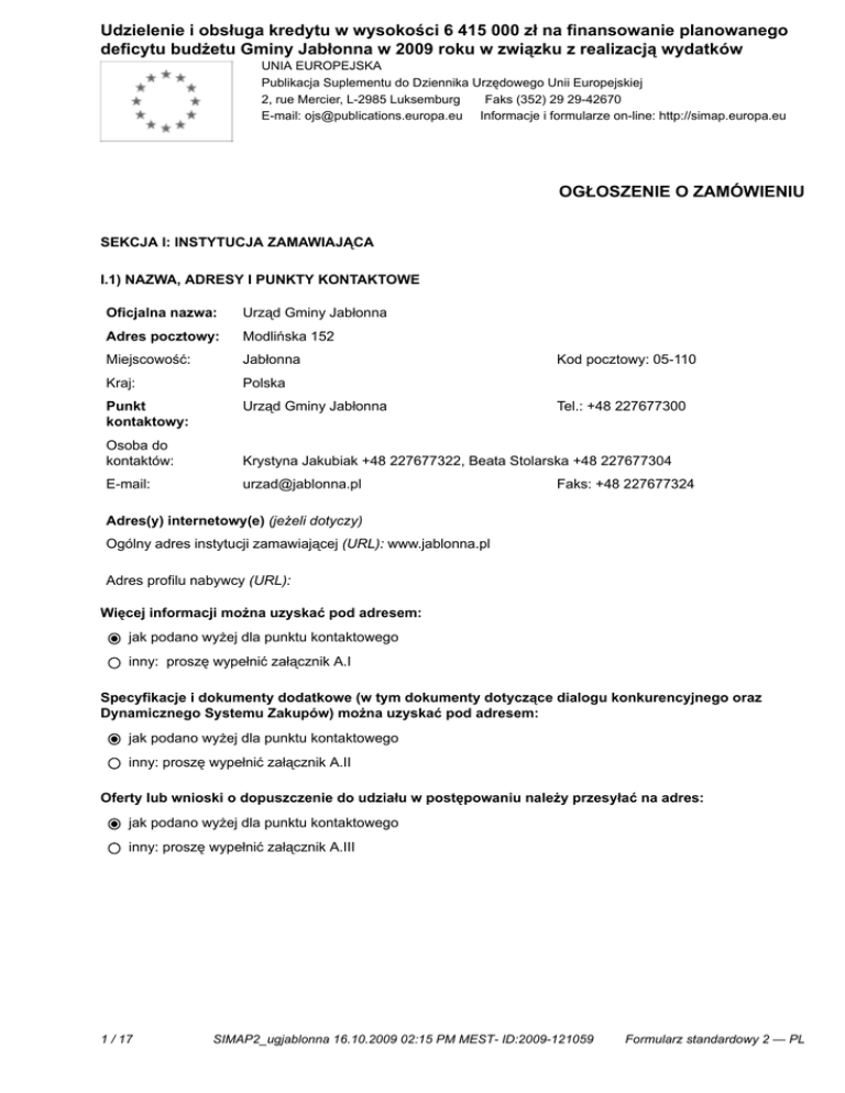 Udzielenie i obsługa kredytu w wysokości 6 415 000 zł na finansowanie planowanego deficytu budżetu Gminy Jabłonna w 2009 roku w związku z realizacją wydatków UNIA EUROPEJSKA nieznajdujących pokrycia w planowanych dochodach Gminy Jabłonna Publikacja Suplementu do Dziennika Urzędowego Unii Europejskiej 2, rue Mercier, L-2985 Luksemburg Faks (352) 29 29-42670 E-mail: [email protected] Informacje i formularze on-line: http://simap.europa.eu OGŁOSZENIE O ZAMÓWIENIU SEKCJA I: INSTYTUCJA ZAMAWIAJĄCA I.1) NAZWA, ADRESY I PUNKTY KONTAKTOWE Oficjalna nazwa: Urząd Gminy Jabłonna Adres pocztowy: Modlińska 152 Miejscowość: Jabłonna Kraj: Polska Punkt kontaktowy: Urząd Gminy Jabłonna Kod pocztowy: 05-110 Tel.: +48 227677300 Osoba do kontaktów: Krystyna Jakubiak +48 227677322, Beata Stolarska +48 227677304 E-mail: [email protected] Faks: +48 227677324 Adres(y) internetowy(e) (jeżeli dotyczy) Ogólny adres instytucji zamawiającej (URL): www.jablonna.pl Adres profilu nabywcy (URL): ________________________________________ Więcej informacji można uzyskać pod adresem: jak podano wyżej dla punktu kontaktowego inny: proszę wypełnić załącznik A.I Specyfikacje i dokumenty dodatkowe (w tym dokumenty dotyczące dialogu konkurencyjnego oraz Dynamicznego Systemu Zakupów) można uzyskać pod adresem: jak podano wyżej dla punktu kontaktowego inny: proszę wypełnić załącznik A.II Oferty lub wnioski o dopuszczenie do udziału w postępowaniu należy przesyłać na adres: jak podano wyżej dla punktu kontaktowego inny: proszę wypełnić załącznik A.III 1 / 17 SIMAP2_ugjablonna 16.10.2009 02:15 PM MEST- ID:2009-121059 Formularz standardowy 2 — PL Udzielenie i obsługa kredytu w wysokości 6 415 000 zł na finansowanie planowanego deficytu budżetu Gminy Jabłonna w 2009 roku w związku z realizacją wydatków nieznajdujących pokrycia w planowanych dochodach Gminy Jabłonna I.2) RODZAJ INSTYTUCJI ZAMAWIAJĄCEJ I GŁÓWNY PRZEDMIOT LUB PRZEDMIOTY DZIAŁALNOŚCI Ministerstwo lub inny organ krajowy lub federalny, w tym jednostki regionalne i lokalne Agencja/Urząd krajowy lub federalny Organ władzy regionalnej lub lokalnej Agencja/Urząd regionalny lub lokalny Podmiot prawa publicznego Instytucja/agencja europejska lub organizacja międzynarodowa Inne (proszę określić): ________________________________ Ogólne usługi publiczne Obrona Porządek i bezpieczeństwo publiczne Środowisko Sprawy gospodarcze i finansowe Zdrowie Budownictwo i obiekty komunalne Ochrona socjalna Rekreacja, kultura i religia Edukacja Inne (proszę określić): ________________________________ Instytucja zamawiająca dokonuje zakupu w imieniu innych instytucji zamawiających tak 2 / 17 nie SIMAP2_ugjablonna 16.10.2009 02:15 PM MEST- ID:2009-121059 Formularz standardowy 2 — PL Udzielenie i obsługa kredytu w wysokości 6 415 000 zł na finansowanie planowanego deficytu budżetu Gminy Jabłonna w 2009 roku w związku z realizacją wydatków nieznajdujących pokrycia w planowanych dochodach Gminy Jabłonna SEKCJA II: PRZEDMIOT ZAMÓWIENIA II.1) OPIS II.1.1) Nazwa nadana zamówieniu przez instytucję zamawiającą Udzielenie i obsługa kredytu w wysokości 6 415 000 zł na finansowanie planowanego deficytu budżetu Gminy Jabłonna w 2009 roku w związku z realizacją wydatków nieznajdujących pokrycia w planowanych dochodach Gminy Jabłonna II.1.2) Rodzaj zamówienia oraz lokalizacja robót budowlanych, miejsce realizacji dostawy lub świadczenia usług (Wybrać wyłącznie jedną kategorię – roboty budowlane, dostawy lub usługi – która najbardziej odpowiada konkretnemu przedmiotowi zamówienia lub zakupu) a) Roboty budowlane b) Dostawy Wykonanie Kupno Zaprojektowanie i wykonanie Dzierżawa Wykonanie, za pomocą dowolnych środków, obiektu budowlanego, odpowiadającego wymogom określonym przez instytucję zamawiającą Najem Główne miejsce lub lokalizacja robót budowlanych c) Usługi Kategoria usług: nr06 (dla usług kategorii 1-27 zob. załącznik II do dyrektywy 2004/18/WE) Leasing Połączenie powyższych form Główne miejsce realizacji dostawy Główne miejsce świadczenia usług Jabłonna Kod NUTS PL129 II.1.3) Ogłoszenie dotyczy Zamówienia publicznego Zawarcia umowy ramowej Utworzenia dynamicznego systemu zakupów (DSZ) II.1.4) Informacje na temat umowy ramowej (jeżeli dotyczy) Umowa ramowa z kilkoma wykonawcami Liczba __, LUB, jeżeli dotyczy, maksymalna liczba uczestników planowanej umowy ramowej __ Umowa ramowa z jednym wykonawcą Czas trwania umowy ramowej: Okres w latach: __ lub miesiącach: ___ Uzasadnienie dla umowy ramowej, której czas trwania przekracza okres czterech lat: ______________________________________________________________________ ______________________________________________________________________ ______________________________________________________________________ Szacunkowa całkowita wartość zakupów w całym okresie obowiązywania umowy ramowej (jeżeli dotyczy; podać wyłącznie dane liczbowe): Szacunkowa wartość bez VAT: _______________ Waluta: ___ LUB Zakres: między _______________ a _______________ Waluta: ___ Częstotliwość oraz wartość zamówień, które zostaną udzielone(jeżeli możliwe do określenia): : ___________________________ 3 / 17 SIMAP2_ugjablonna 16.10.2009 02:15 PM MEST- ID:2009-121059 Formularz standardowy 2 — PL Udzielenie i obsługa kredytu w wysokości 6 415 000 zł na finansowanie planowanego deficytu budżetu Gminy Jabłonna w 2009 roku w związku z realizacją wydatków II.1.5) Krótki opis zamówienia nieznajdujących pokrycialub w zakupu(ów) planowanych dochodach Gminy Jabłonna 1. Przedmiotem zamówienia jest kredyt w wysokości 6.415.000 zł na finansowanie wydatków nie znajdujących pokrycia w planowanych dochodach Gminy Jabłonna. 2. Kredyt ma być zaciągnięty na okres 5 lat, z terminem postawienia do dyspozycji w grudniu 2009 roku i terminem spłaty do grudnia 2014 roku. Spłata kredytu od stycznia 