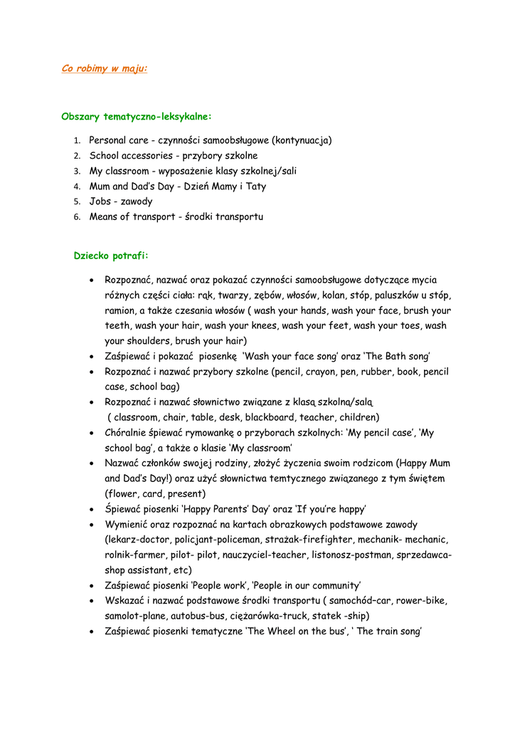 Co robimy w maju: Obszary tematyczno-leksykalne: 1. Personal care - czynności samoobsługowe (kontynuacja) 2. School accessories - przybory szkolne 3. My classroom - wyposażenie klasy szkolnej/sali 4. Mum and Dad’s Day - Dzień Mamy i Taty 5. Jobs - zawody 6. Means of transport - środki transportu Dziecko potrafi: Rozpoznać, nazwać oraz pokazać czynności samoobsługowe dotyczące mycia różnych części ciała: rąk, twarzy, zębów, włosów, kolan, stóp, paluszków u stóp, ramion, a także czesania włosów ( wash your hands, wash your face, brush your teeth, wash your hair, wash your knees, wash your feet, wash your toes, wash your shoulders, brush your hair) Zaśpiewać i pokazać piosenkę ‘Wash your face song’ oraz ‘The Bath song’ Rozpoznać i nazwać przybory szkolne (pencil, crayon, pen, rubber, book, pencil case, school bag) Rozpoznać i nazwać słownictwo związane z klasą szkolną/salą ( classroom, chair, table, desk, blackboard, teacher, children) Chóralnie śpiewać rymowankę o przyborach szkolnych: ‘My pencil case’, ‘My school bag’, a także o klasie ‘My classroom’ Nazwać członków swojej rodziny, złożyć życzenia swoim rodzicom (Happy Mum and Dad’s Day!) oraz użyć słownictwa temtycznego związanego z tym świętem (flower, card, present) Śpiewać piosenki ‘Happy Parents’ Day’ oraz ‘If you’re happy’ Wymienić oraz rozpoznać na kartach obrazkowych podstawowe zawody (lekarz-doctor, policjant-policeman, strażak-firefighter, mechanik- mechanic, rolnik-farmer, pilot- pilot, nauczyciel-teacher, listonosz-postman, sprzedawcashop assistant, etc) Zaśpiewać piosenki ‘People work’, ‘People in our community’ Wskazać i nazwać podstawowe środki transportu ( samochód–car, rower-bike, samolot-plane, autobus-bus, ciężarówka-truck, statek -ship) Zaśpiewać piosenki tematyczne ‘The Wheel on the bus’, ‘ The train song’