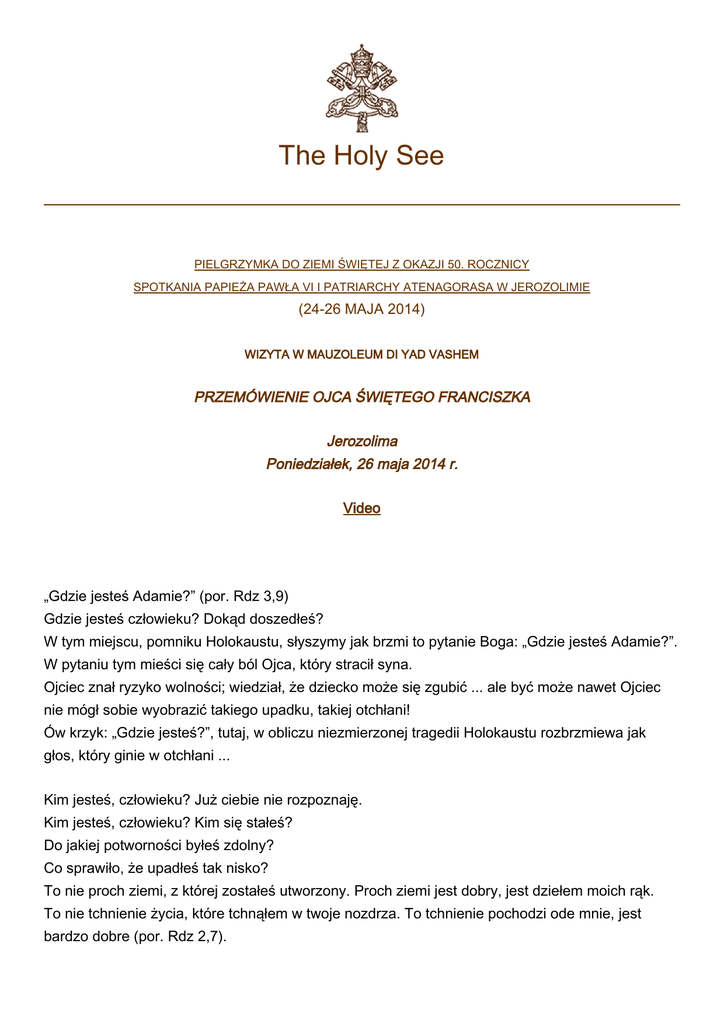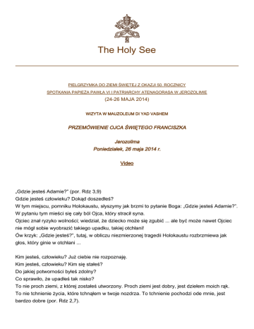 The Holy See PIELGRZYMKA DO ZIEMI ŚWIĘTEJ Z OKAZJI 50. ROCZNICY SPOTKANIA PAPIEŻA PAWŁA VI I PATRIARCHY ATENAGORASA W JEROZOLIMIE (24-26 MAJA 2014) WIZYTA W MAUZOLEUM DI YAD VASHEM PRZEMÓWIENIE OJCA ŚWIĘTEGO FRANCISZKA Jerozolima Poniedziałek, 26 maja 2014 r. Video „Gdzie jesteś Adamie?” (por. Rdz 3,9) Gdzie jesteś człowieku? Dokąd doszedłeś? W tym miejscu, pomniku Holokaustu, słyszymy jak brzmi to pytanie Boga: „Gdzie jesteś Adamie?”. W pytaniu tym mieści się cały ból Ojca, który stracił syna. Ojciec znał ryzyko wolności; wiedział, że dziecko może się zgubić ... ale być może nawet Ojciec nie mógł sobie wyobrazić takiego upadku, takiej otchłani! Ów krzyk: „Gdzie jesteś?”, tutaj, w obliczu niezmierzonej tragedii Holokaustu rozbrzmiewa jak głos, który ginie w otchłani ... Kim jesteś, człowieku? Już ciebie nie rozpoznaję. Kim jesteś, człowieku? Kim się stałeś? Do jakiej potworności byłeś zdolny? Co sprawiło, że upadłeś tak nisko? To nie proch ziemi, z której zostałeś utworzony. Proch ziemi jest dobry, jest dziełem moich rąk. To nie tchnienie życia, które tchnąłem w twoje nozdrza. To tchnienie pochodzi ode mnie, jest bardzo dobre (por. Rdz 2,7). 2 Nie, ta otchłań nie może być tylko twoim dziełem, twoich rąk, twojego serca ... Kto ciebie zdeprawował? Kto ciebie oszpecił? Kto ciebie zaraził pychą stania się panem dobra i zła? Kto cię przekonał, że jesteś bogiem? Nie tylko torturowałeś i zabijałeś swoich braci, ale złożyłeś ich w ofierze dla samego siebie, ponieważ ustanowiłeś siebie bogiem. Dziś wracamy tutaj, aby słuchać głosu Boga: „Gdzie jesteś Adamie?” Z ziemi wznosi się przyciszony jęk: Zmiłuj się nad nami, Panie! Panu, Bogu naszemu, należna jest sprawiedliwość, nam zaś zawstydzenie oblicza, hańba (por. Bar 1,15). Przyszło na nas zło, które nigdzie pod niebem nie było tak spełnione (por. Bar 2,2). Teraz, Panie, wysłuchaj naszej modlitwy, usłysz nasze błagania, zbaw nas przez swe miłosierdzie, zbaw nas od tej potworności. Wszechmogący Boże, dusza w udręce woła do Ciebie. Wysłuchaj ją, Panie, zmiłuj się! Zgrzeszyliśmy przeciwko tobie. Ty królujesz na wieki (por. Ba 3,1-2). Pamiętaj o nas w swoim miłosierdziu. Daj nam łaskę, byśmy wstydzili się tego, co jako ludzie, jesteśmy w stanie uczynić, wstydzili się tego skrajnego bałwochwalstwa, wzgardzenia i zniszczenia naszego ciała, które z mułu uczyniłeś, które ożywiłeś tchnieniem życia. Nigdy więcej, Panie, nigdy więcej! „Gdzie jesteś Adamie?”. Oto jestem, Panie, z hańbą tego co człowiek, stworzony na Twój obraz i podobieństwo, był w stanie uczynić. Pamiętaj o nas w swoim miłosierdziu. © Copyright - Libreria Editrice Vaticana