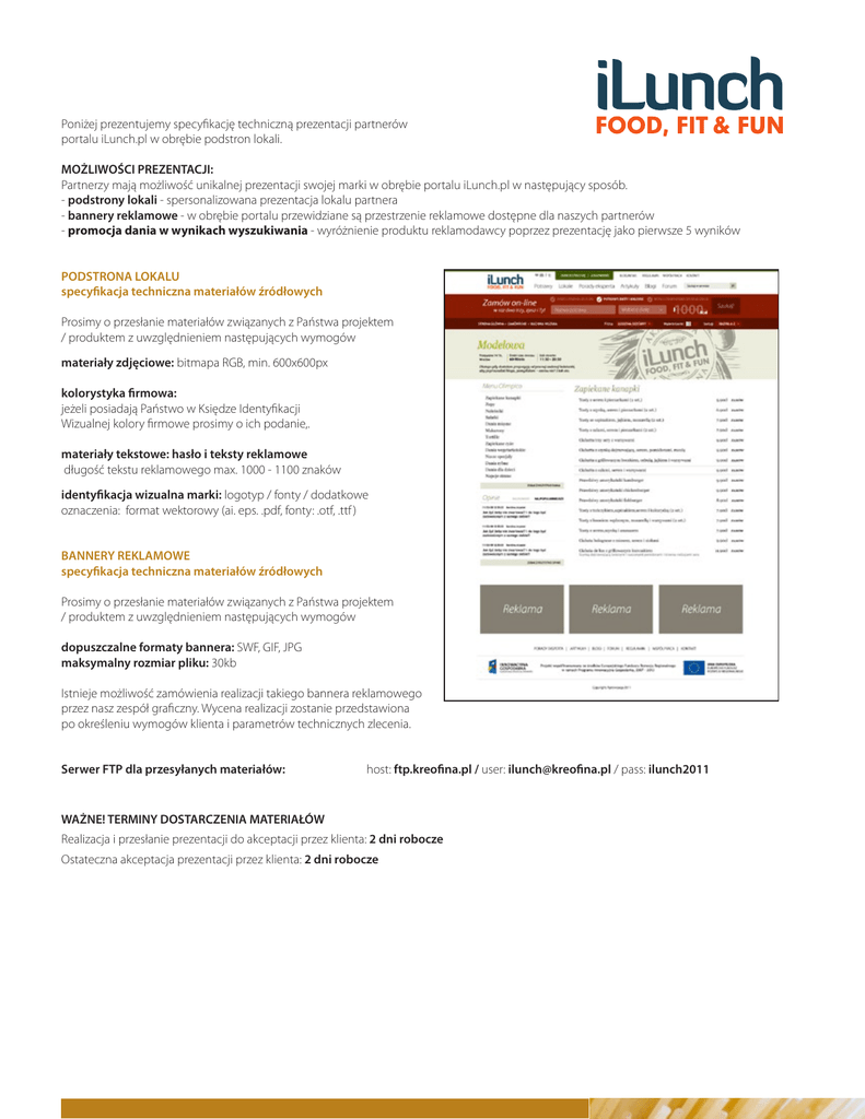 Poniżej prezentujemy specyfikację techniczną prezentacji partnerów portalu iLunch.pl w obrębie podstron lokali. MOŻLIWOŚCI PREZENTACJI: Partnerzy mają możliwość unikalnej prezentacji swojej marki w obrębie portalu iLunch.pl w następujący sposób. - podstrony lokali - spersonalizowana prezentacja lokalu partnera - bannery reklamowe - w obrębie portalu przewidziane są przestrzenie reklamowe dostępne dla naszych partnerów - promocja dania w wynikach wyszukiwania - wyróżnienie produktu reklamodawcy poprzez prezentację jako pierwsze 5 wyników PODSTRONA LOKALU specyfikacja techniczna materiałów źródłowych Prosimy o przesłanie materiałów związanych z Państwa projektem / produktem z uwzględnieniem następujących wymogów materiały zdjęciowe: bitmapa RGB, min. 600x600px kolorystyka firmowa: jeżeli posiadają Państwo w Księdze Identyfikacji Wizualnej kolory firmowe prosimy o ich podanie,. RYS. 2A materiały tekstowe: hasło i teksty reklamowe długość tekstu reklamowego max. 1000 - 1100 znaków identyfikacja wizualna marki: logotyp / fonty / dodatkowe oznaczenia: format wektorowy (ai. eps. .pdf, fonty: .otf, .ttf ) BANNERY REKLAMOWE specyfikacja techniczna materiałów źródłowych Prosimy o przesłanie materiałów związanych z Państwa projektem / produktem z uwzględnieniem następujących wymogów dopuszczalne formaty bannera: SWF, GIF, JPG maksymalny rozmiar pliku: 30kb Istnieje możliwość zamówienia realizacji takiego bannera reklamowego przez nasz zespół graficzny. Wycena realizacji zostanie przedstawiona po określeniu wymogów klienta i parametrów technicznych zlecenia. Serwer FTP dla przesyłanych materiałów: host: ftp.kreofina.pl / user: [email protected] / pass: ilunch2011 WAŻNE! TERMINY DOSTARCZENIA MATERIAŁÓW Realizacja i przesłanie prezentacji do akceptacji przez klienta: 2 dni robocze Ostateczna akceptacja prezentacji przez klienta: 2 dni robocze Poniżej prezentujemy specyfikację techniczną prezentacji partnerów portalu iLunch.pl w obrębie podstron lokali. MOŻLIWOŚCI PREZENTACJI: Partnerzy mają możliwość unikalnej prezentacji swojej marki w obrębie portalu iLunch.pl w następujący sposób. - podstrony lokali - spersonalizowana prezentacja lokalu partnera - bannery reklamowe - w obrębie portalu przewidziane są przestrzenie reklamowe dostępne dla naszych partnerów - promocja dania w wynikach wyszukiwania - wyróżnienie produktu reklamodawcy poprzez prezentację jako pierwsze 5 wyników BANNERY REKLAMOWE - prezentacja możliwości reklamowych w obrębie serwisu iLunch.pl. dostępne warianty bannerów: 1. banner poziom - 468x60 px 2. billboard - 750x100 px 3. double billboard - 750x200 px 4. tapeta pod treścią - dowolny wymiar 5. box newsstream - 500x300px 6. box śródtekstowy - 300x250 px 7. box śródtekstowy - 300x300 px 8. top layer - do 100% powierzchni 9. rotator logotypów sponsorskich (głównych sponsorów) - 300x250px 10. logotypy partnerów projektu - 50x85 px Poniższa prezentacja możliwości reklamowych obejmuje wszelkie możliwe powierzchnie w obrębie layoutu serwisu. Liczba rzeczywistych jednostek reklamowych na pojedynczej stronie jest ustalana indywidualnie przez dział Marketingu iLunch.pl Widok strony głównej TOP LAYER Widok strony głównej 5 8 2 4a 4b 6 KONTAKT W KWESTIACH TECHNICZNYCH: 7 TOMASZ SIARA / KREOFINA: tel.: 603 11 73 11, [email protected] BANNERY REKLAMOWE - prezentacja możliwości reklamowych w obrębie serwisu iLunch.pl. dostępne warianty bannerów: 1. banner poziom - 468x60 px 2. billboard - 750x100 px 3. double billboard - 750x200 px 4. tapeta pod treścią - dowolny wymiar 5. box newsstream - 500x300px 6. box śródtekstowy - 300x250 px 7. box śródtekstowy - 300x300 px 8. top layer - do 100% powierzchni 9. rotator logotypów sponsorskich (głównych sponsorów) - 300x250px 10. logotypy partnerów projektu - 50x85 px Poniższa prezentacja możliwości reklamowych obejmuje wszelkie możliwe powierzchnie w obrębie layoutu serwisu. Liczba rzeczywistych jednostek reklamowych na pojedynczej stronie jest ustalana indywidualnie przez dział Marketingu iLunch.pl Widok restauracji Widok jednostki treściowej: artykuł / blog 1 4b 1 4a 4b 4a 6 7 7 6 6 KONTAKT W KWESTIACH TECHNICZNYCH: TOMASZ SIARA / KREOFINA: tel.: 603 11 73 11, [email protected] BANNERY REKLAMOWE - prezentacja możliwości reklamowych w obrębie serwisu iLunch.pl. dostępne warianty bannerów: 1. banner poziom - 468x60 px 2. billboard - 750x100 px 3. double billboard - 750x200 px 4. tapeta pod treścią - dowolny wymiar 5. box newsstream - 500x300px 6. box śródtekstowy - 300x250 px 7. box śródtekstowy - 300x300 px 8. top layer - do 100% powierzchni 9. rotator logotypów sponsorskich (głównych sponsorów) - 300x250px 10. logotypy partnerów projektu - 50x85 px Poniższa prezentacja możliwości reklamowych obejmuje wszelkie możliwe powierzchnie w obrębie layoutu serwisu. Liczba rzeczywistych jednostek reklamowych na pojedynczej stronie jest ustalana indywidualnie przez dział Marketingu iLunch.pl Widok stron informacyjnych Akademia Kulinarna Ilunch 9 4a 4b 6 10 6 KONTAKT W KWESTIACH TECHNICZNYCH: TOMASZ SIARA / KREOFINA: tel.: 603 11 73 11, [email protected]