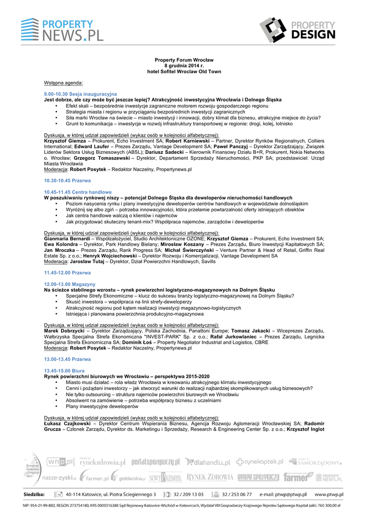 Property Forum Wrocław 8 grudnia 2014 r. hotel Sofitel Wroclaw Old Town Wstępna agenda: 9.00-10.30 Sesja inauguracyjna Jest dobrze, ale czy może być jeszcze lepiej? Atrakcyjność inwestycyjna Wrocławia i Dolnego Śląska • Efekt skali – bezpośrednie inwestycje zagraniczne motorem rozwoju gospodarczego regionu • Strategia miasta i regionu w przyciąganiu bezpośrednich inwestycji zagranicznych • Siła marki Wrocław na świecie – miasto inwestycji i innowacji, dobry klimat dla biznesu, atrakcyjne miejsce do życia? • Grunt to komunikacja – inwestycje w rozwój infrastruktury transportowej w regionie: drogi, kolej, lotnisko Dyskusja, w której udział zapowiedzieli (wykaz osób w kolejności alfabetycznej): Krzysztof Giemza – Prokurent, Echo Investment SA; Robert Karniewski – Partner, Dyrektor Rynków Regionalnych, Colliers International; Edward Laufer – Prezes Zarządu, Vantage Development SA; Paweł Panczyj – Dyrektor Zarządzający, Związek Liderów Sektora Usług Biznesowych (ABSL); Dariusz Sadecki – Kierownik Finansowy Działu B+R, Prokurent, Nokia Networks o. Wrocław; Grzegorz Tomaszewski – Dyrektor, Departament Sprzedaży Nieruchomości, PKP SA; przedstawiciel: Urząd Miasta Wrocławia Moderacja: Robert Posytek – Redaktor Naczelny, Propertynews.pl 10.30-10.45 Przerwa 10.45-11.45 Centra handlowe W poszukiwaniu rynkowej niszy – potencjał Dolnego Śląska dla deweloperów nieruchomości handlowych • Poziom nasycenia rynku i plany inwestycyjne deweloperów centrów handlowych w województwie dolnośląskim • Wyróżnij się albo zgiń – potrzeba innowacyjności, która przełamie powtarzalność oferty istniejących obiektów • Jak centra handlowe walczą o klientów i najemców • Jak przygotować skuteczny tenant-mix? Współpraca najemców, zarządców i deweloperów Dyskusja, w której udział zapowiedzieli (wykaz osób w kolejności alfabetycznej): Gianmaria Bernardi – Współzałożyciel, Studio Architektoniczne OZONE; Krzysztof Giemza – Prokurent, Echo Investment SA; Ewa Kolondra – Dyrektor, Park Handlowy Bielany; Mirosław Koszany – Prezes Zarządu, Biuro Inwestycji Kapitałowych SA; Jan Mroczka – Prezes Zarządu, Rank Progress SA; Michał Świerczyński – Venture Partner & Head of Retail, Griffin Real Estate Sp. z o.o.; Henryk Wojciechowski – Dyrektor Rozwoju i Komercjalizacji, Vantage Development SA Moderacja: Jarosław Tutaj – Dyrektor, Dział Powierzchni Handlowych, Savills 11.45-12.00 Przerwa 12.00-13.00 Magazyny Na ścieżce stabilnego wzrostu – rynek powierzchni logistyczno-magazynowych na Dolnym Śląsku • Specjalne Strefy Ekonomiczne – klucz do sukcesu branży logistyczno-magazynowej na Dolnym Śląsku? • Skusić inwestora – współpraca na linii strefy-deweloperzy • Atrakcyjność regionu pod kątem realizacji inwestycji magazynowo-logistycznych • Istniejąca i planowana powierzchnia produkcyjno-magazynowa Dyskusja, w której udział zapowiedzieli (wykaz osób w kolejności alfabetycznej): Marek Dobrzycki – Dyrektor Zarządzający, Polska Zachodnia, Panattoni Europe; Tomasz Jakacki – Wiceprezes Zarządu, Wałbrzyska Specjalna Strefa Ekonomiczna "INVEST-PARK" Sp. z o.o.; Rafał Jurkowlaniec – Prezes Zarządu, Legnicka Specjalna Strefa Ekonomiczna SA; Dominik Łoś – Property Negotiator Industrial and Logistics, CBRE Moderacja: Robert Posytek – Redaktor Naczelny, Propertynews.pl 13.00-13.45 Przerwa 13.45-15.00 Biura Rynek powierzchni biurowych we Wrocławiu – perspektywa 2015-2020 • Miasto musi działać – rola władz Wrocławia w kreowaniu atrakcyjnego klimatu inwestycyjnego • Cenni i pożądani inwestorzy – jak stworzyć warunki do realizacji najbardziej skomplikowanych usług biznesowych? • Nie tylko outsourcing – struktura najemców powierzchni biurowych we Wrocławiu • Absolwent na zamówienie – potrzeba współpracy biznesu z uczelniami • Plany inwestycyjne deweloperów Dyskusja, w której udział zapowiedzieli (wykaz osób w kolejności alfabetycznej): Łukasz Czajkowski – Dyrektor Centrum Wspierania Biznesu, Agencja Rozwoju Aglomeracji Wrocławskiej SA; Radomir Grucza – Członek Zarządu, Dyrektor ds. Marketingu i Sprzedaży, Research & Engineering Center Sp. z o.o.; Krzysztof Inglot – Dyrektor, Dział Rozwoju Rynków, Work Service SA; Katarzyna Kubicka – Senior Leasing Manager, Echo Investment SA; Łukasz Kwieciński – Menadżer ds. Zarządzania Wartością Budynków, Skanska Property Poland; Edward Laufer – Prezes Zarządu, Vantage Development SA; Jarosław Prawicki – Dyrektor Sprzedaży i Marketingu, UBM Polska Sp. z o.o. Moderacja: Kamil Pakosz – Manager Regionalny we Wrocławiu, Colliers International 15.00-15.15 Przerwa 15.15-16.15 Hotele Biznes czy turystyka – co napędza branżę hotelarską na Dolnym Śląsku? • Rentowność biznesu hotelarskiego na Dolnym Śląsku oczami największych graczy na rynku • Polityka samorządów a rozwój turystyki wypoczynkowej i biznesowej • Największe planowane i realizowane inwestycje hotelarskie w regionie Dyskusja, w której udział zapowiedzieli (wykaz osób w kolejności alfabetycznej): Wojciech Biliński – Dyrektor, Wydział Turystyki, Departament Spraw Społecznych, Urząd Marszałkowski Województwa Dolnośląskiego; Małgorzata Morek – Dyrektor ds. Rozwoju Franczyzy, Orbis SA; Magdalena Piasecka – Prezes Zarządu, Convention Bureau-Wrocław; Dariusz Rutowicz* – Wiceprezes Zarządu, Interferie SA; Przemysław Wieczorek – Członek Zarządu, Puro Hotels Sp. z o.o. Moderacja: Adam Konieczny – Country Head Poland, MRICS Christie+CO * nazwiska osób, których udział jeszcze wyjaśniamy