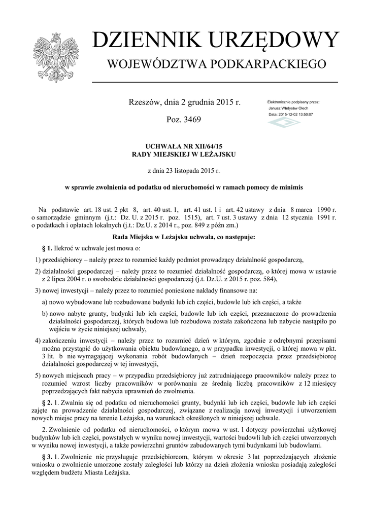 DZIENNIK URZĘDOWY WOJEWÓDZTWA PODKARPACKIEGO Rzeszów, dnia 2 grudnia 2015 r. Elektronicznie podpisany przez: Janusz Władysław Olech Poz. 3469 Data: 2015-12-02 13:50:07 UCHWAŁA NR XII/64/15 RADY MIEJSKIEJ W LEŻAJSKU z dnia 23 listopada 2015 r. w sprawie zwolnienia od podatku od nieruchomości w ramach pomocy de minimis Na podstawie art. 18 ust. 2 pkt 8, art. 40 ust. 1, art. 41 ust. 1 i art. 42 ustawy z dnia 8 marca 1990 r. o samorządzie gminnym (j.t.: Dz. U. z 2015 r. poz. 1515), art. 7 ust. 3 ustawy z dnia 12 stycznia 1991 r. o podatkach i opłatach lokalnych (j.t.: Dz.U. z 2014 r., poz. 849 z późn zm.) Rada Miejska w Leżajsku uchwala, co następuje: § 1. Ilekroć w uchwale jest mowa o: 1) przedsiębiorcy – należy przez to rozumieć każdy podmiot prowadzący działalność gospodarczą, 2) działalności gospodarczej – należy przez to rozumieć działalność gospodarczą, o której mowa w ustawie z 2 lipca 2004 r. o swobodzie działalności gospodarczej (j.t. Dz.U. z 2015 r. poz. 584), 3) nowej inwestycji – należy przez to rozumieć poniesione nakłady finansowe na: a) nowo wybudowane lub rozbudowane budynki lub ich części, budowle lub ich części, a także b) nowo nabyte grunty, budynki lub ich części, budowle lub ich części, przeznaczone do prowadzenia działalności gospodarczej, których budowa lub rozbudowa została zakończona lub nabycie nastąpiło po wejściu w życie niniejszej uchwały, 4) zakończeniu inwestycji – należy przez to rozumieć dzień w którym, zgodnie z odrębnymi przepisami można przystąpić do użytkowania obiektu budowlanego, a w przypadku inwestycji, o której mowa w pkt. 3 lit. b nie wymagającej wykonania robót budowlanych – dzień rozpoczęcia przez przedsiębiorcę działalności gospodarczej w tej inwestycji, 5) nowych miejscach pracy – w przypadku przedsiębiorcy już zatrudniającego pracowników należy przez to rozumieć wzrost liczby pracowników w porównaniu ze średnią liczbą pracowników z 12 miesięcy poprzedzających fakt nabycia uprawnień do zwolnienia. § 2. 1. Zwalnia się od podatku od nieruchomości grunty, budynki lub ich części, budowle lub ich części zajęte na prowadzenie działalności gospodarczej, związane z realizacją nowej inwestycji i utworzeniem nowych miejsc pracy na terenie Leżajska, na warunkach określonych w niniejszej uchwale. 2. Zwolnienie od podatku od nieruchomości, o którym mowa w ust. 1 dotyczy powierzchni użytkowej budynków lub ich części, powstałych w wyniku nowej inwestycji, wartości budowli lub ich części utworzonych w wyniku nowej inwestycji, a także powierzchni gruntów zabudowanych tymi budynkami lub budowlami. § 3. 1. Zwolnienie nie przysługuje przedsiębiorcom, którym w okresie 3 lat poprzedzających złożenie wniosku o zwolnienie umorzone zostały zaległości lub którzy na dzień złożenia wniosku posiadają zaległości względem budżetu Miasta Leżajska. Dziennik Urzędowy Województwa Podkarpackiego –2– Poz. 3469 2. W przypadku powstania zaległości, o których mowa w ust. 1 w trakcie korzystania ze zwolnienia przedsiębiorca traci prawo do zwolnienia. 3. Prawo do zwolnienia od podatku od nieruchomości nie obejmuje nieruchomości zajętych na: stacje paliw, działalność handlową i bankową. § 4. 1. Zwolnienie, o którym mowa w § 2 przysługuje na okres: 1) 6 miesięcy, jeżeli w związku z nową inwestycją utworzono co najmniej 2 nowe miejsca pracy, 2) 12 miesięcy, jeżeli w związku z nową inwestycją utworzono co najmniej 5 nowych miejsc pracy, 3) 24 miesięcy, jeżeli w związku z nową inwestycją utworzono co najmniej 10 nowych miejsc pracy, 4) 36 miesięcy, jeżeli w związku z nową inwestycją utworzono co najmniej 20 nowych miejsc pracy. 2. Zwolnienie od podatku od nieruchomości z tytułu tej samej inwestycji może być przyznane tylko jeden raz. 3. Przedsiębiorca, który spełnił warunki do korzystania ze zwolnienia zobowiązany jest do utrzymania nowej inwestycji i utrzymania nowych miejsc pracy przez cały okres zwolnienia. § 5. Okres zwolnienia rozpoczyna się od pierwszego dnia miesiąca następującego po miesiącu w którym został złożony wniosek o zwolnienie przy spełnieniu warunków określonych w niniejszej uchwale, nie wcześniej jednak, niż przed dniem powstania obowiązku podatkowego zgodnie z art. 6 ust. 2 ustawy o podatkach i opłatach lokalnych. § 6. Zwolnienie, o którym mowa w § 2 stanowi pomoc de minimis, zgodnie z rozporządzeniem Komisji (UE) Nr 1407/2013 z dnia 18 grudnia 2013 r. w sprawie stosowania art. 107 i 108 Traktatu o funkcjonowaniu Unii Europejskiej do pomocy de minimis (Dz. U. UE L Nr 352 z dnia 24.12.2013r.), udzielane jest z uwzględnieniem i na warunkach niniejszego rozporządzenia oraz polskich przepisów dotyczących pomocy de minimis. § 7. Przedsiębiorca ubiegający się o zwolnienie, o którym mowa w § 2 jest zobowiązany do przedłożenia wniosku, którego wzór stanowi załącznik do uchwały wraz z wymienionymi we wniosku dokumentami stanowiącymi integralną jego część. § 8. Przedsiębiorca korzystający ze zwolnienia jest zobowiązany przedkładać w terminie do dnia 31 stycznia każdego roku następnego po roku, w którym korzystał ze zwolnienia następujące dokumenty: 1) wszystkie zaświadczenia o pomocy de minimis, a także pomocy de minimis w rolnictwie lub rybołówstwie jakie otrzymał w roku, w którym ubiega się o pomoc oraz w ciągu 2 poprzedzających go lat kalendarzowych, albo oświadczenia o wielkości otrzymanej pomocy lub o nieotrzymaniu pomocy de minimis oraz pomocy de minimis w rolnictwie lub rybołówstwie w tym okresie, 2) formularz informacji przedstawianych przy ubieganiu się o pomoc de minimis ustalony Rozporządzeniem Rady Ministrów z dnia 29 marca 2010 r w sprawie zakresu informacji przedstawianych przez podmiot ubiegający się o pomoc de minimis (Dz.U. Nr 53, poz. 311 z późn. zm.), 3) oświadczenie o niezaleganiu z zapł