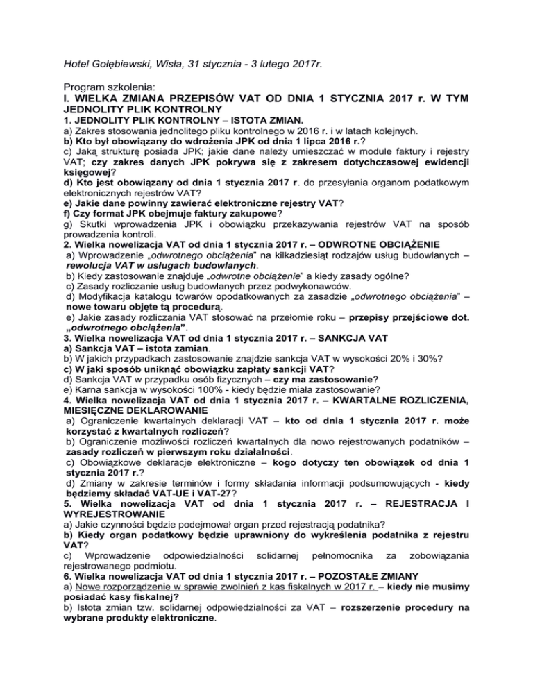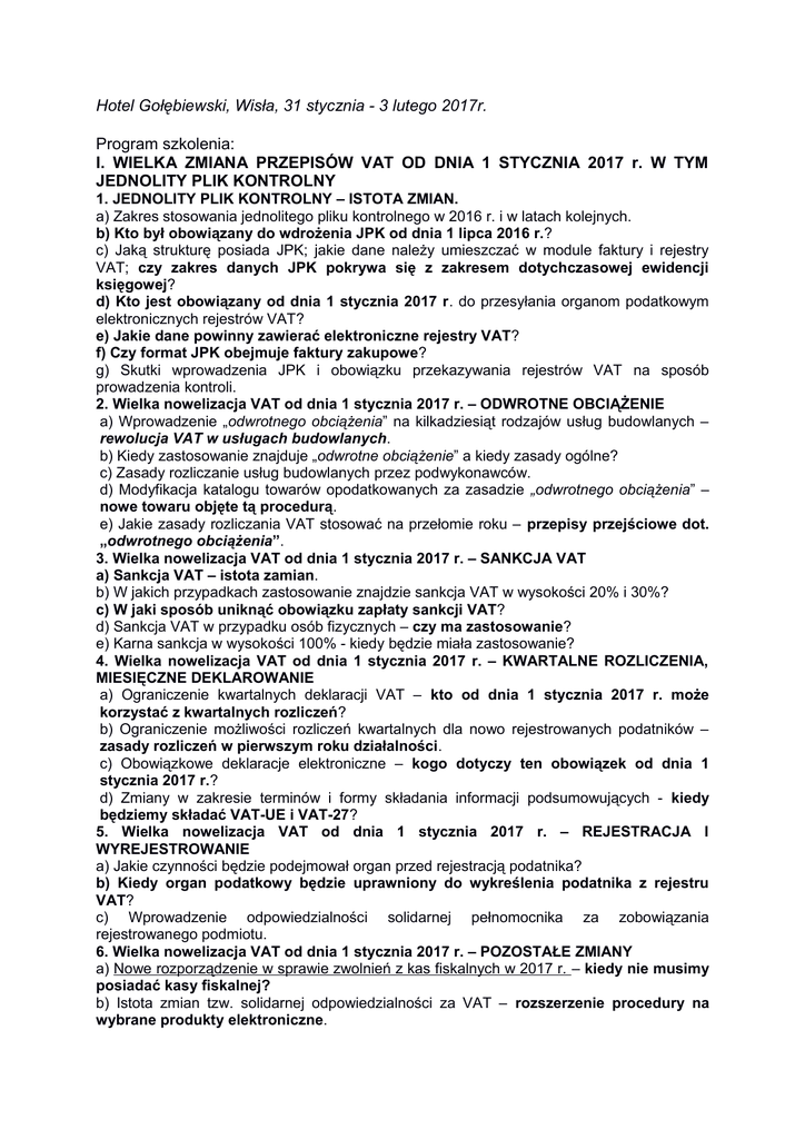Hotel Gołębiewski, Wisła, 31 stycznia - 3 lutego 2017r. Program szkolenia: I. WIELKA ZMIANA PRZEPISÓW VAT OD DNIA 1 STYCZNIA 2017 r. W TYM JEDNOLITY PLIK KONTROLNY 1. JEDNOLITY PLIK KONTROLNY – ISTOTA ZMIAN. a) Zakres stosowania jednolitego pliku kontrolnego w 2016 r. i w latach kolejnych. b) Kto był obowiązany do wdrożenia JPK od dnia 1 lipca 2016 r.? c) Jaką strukturę posiada JPK; jakie dane należy umieszczać w module faktury i rejestry VAT; czy zakres danych JPK pokrywa się z zakresem dotychczasowej ewidencji księgowej? d) Kto jest obowiązany od dnia 1 stycznia 2017 r. do przesyłania organom podatkowym elektronicznych rejestrów VAT? e) Jakie dane powinny zawierać elektroniczne rejestry VAT? f) Czy format JPK obejmuje faktury zakupowe? g) Skutki wprowadzenia JPK i obowiązku przekazywania rejestrów VAT na sposób prowadzenia kontroli. 2. Wielka nowelizacja VAT od dnia 1 stycznia 2017 r. – ODWROTNE OBCIĄŻENIE a) Wprowadzenie „odwrotnego obciążenia” na kilkadziesiąt rodzajów usług budowlanych – rewolucja VAT w usługach budowlanych. b) Kiedy zastosowanie znajduje „odwrotne obciążenie” a kiedy zasady ogólne? c) Zasady rozliczanie usług budowlanych przez podwykonawców. d) Modyfikacja katalogu towarów opodatkowanych za zasadzie „odwrotnego obciążenia” – nowe towaru objęte tą procedurą. e) Jakie zasady rozliczania VAT stosować na przełomie roku – przepisy przejściowe dot. „odwrotnego obciążenia”. 3. Wielka nowelizacja VAT od dnia 1 stycznia 2017 r. – SANKCJA VAT a) Sankcja VAT – istota zamian. b) W jakich przypadkach zastosowanie znajdzie sankcja VAT w wysokości 20% i 30%? c) W jaki sposób uniknąć obowiązku zapłaty sankcji VAT? d) Sankcja VAT w przypadku osób fizycznych – czy ma zastosowanie? e) Karna sankcja w wysokości 100% - kiedy będzie miała zastosowanie? 4. Wielka nowelizacja VAT od dnia 1 stycznia 2017 r. – KWARTALNE ROZLICZENIA, MIESIĘCZNE DEKLAROWANIE a) Ograniczenie kwartalnych deklaracji VAT – kto od dnia 1 stycznia 2017 r. może korzystać z kwartalnych rozliczeń? b) Ograniczenie możliwości rozliczeń kwartalnych dla nowo rejestrowanych podatników – zasady rozliczeń w pierwszym roku działalności. c) Obowiązkowe deklaracje elektroniczne – kogo dotyczy ten obowiązek od dnia 1 stycznia 2017 r.? d) Zmiany w zakresie terminów i formy składania informacji podsumowujących - kiedy będziemy składać VAT-UE i VAT-27? 5. Wielka nowelizacja VAT od dnia 1 stycznia 2017 r. – REJESTRACJA I WYREJESTROWANIE a) Jakie czynności będzie podejmował organ przed rejestracją podatnika? b) Kiedy organ podatkowy będzie uprawniony do wykreślenia podatnika z rejestru VAT? c) Wprowadzenie odpowiedzialności solidarnej pełnomocnika za zobowiązania rejestrowanego podmiotu. 6. Wielka nowelizacja VAT od dnia 1 stycznia 2017 r. – POZOSTAŁE ZMIANY a) Nowe rozporządzenie w sprawie zwolnień z kas fiskalnych w 2017 r. – kiedy nie musimy posiadać kasy fiskalnej? b) Istota zmian tzw. solidarnej odpowiedzialności za VAT – rozszerzenie procedury na wybrane produkty elektroniczne. c) Na jakich zasadach, od dnia 1 stycznia 2017 r. wyłączyć solidarną odpowiedzialność? d) Podniesienie limitu zwolnienia z opodatkowana ze względu na obrót – zasady przyujściowe, e) Zmiany w zakresie zasad i terminów zwrotu podatku – kiedy będzie przysługiwał zwrot w terminie 25 dnia a kiedy 60 dni? f) Zmiany w zakresie terminów odliczania VAT – czy możliwe jest odliczenie VAT w odwrotnym obciążeniu w dwóch kolejnych okresach rozliczeniowych? II. PODATEK DOCHODOWY OD OSÓB PRAWNYCH – ZASADY ROZLICZEŃ ORAZ PLANOWANE ZMIANY NA ROK 2017 1. Zmiany w CIT na 2017 r. - zakaz zaliczania do kosztów podatkowych transakcji uregulowanych z pominięciem rachunku płatniczego; - obniżka stawki podatku od małych firm; - nowe zasady ustalania przychodu przy aporcie. 2. Nowe zasady dokumentacji dla potrzeb cen transferowych - kto ma obowiązek prowadzić ewidencję? - zasady prowadzenia ewidencji; - nowe obowiązki sprawozdawcze. 3. Moment powstania kosztu i przychodu podatkowego podatkowego - ewidencja korekt kosztów i przychodów na tle nowych przepisów. Przykłady kontrowersyjnych zagadnień w zakresie kosztów uzyskania przychodu - np. różnice kursowe przy rozliczaniu delegacji zagranicznych, postępowanie z należnościami przedawnionymi i nieściągalnymi. 4. Nowości interpretacyjne - omówienie najnowszych istotnych wyroków sądowych i interpretacji izb skarbowych. III. ZAKŁAD PRACY PŁATNIKIEM PODATKU DOCHODOWEGO OD OSÓB FIZYCZNYCH. 1. Jak rozliczać prywatne korzystanie z samochodów służbowych: a) ryczałtowe stawki miesięczne, b) jak ustalać wartość w przypadku korzystania w niektórych dniach miesiąca, c) kiedy prywatne korzystanie nie jest oskładkowane?, d) czy koszt paliwa zawiera się w ryczałcie, czy też należy rozliczać go odrębnie?, e) kiedy wydatki eksploatacyjne związane z korzystaniem prywatnym są dla pracodawcy kosztem uzyskania przychodów?, f) co jest korzystniejsze podatkowo: udostępnienie nieodpłatne czy odpłatne? 2. Świadczenia socjalne, w szczególności finansowane z zakładowego funduszu świadczeń socjalnych (ZFŚS): a) zwolnienia od podatku, b) wyłączenia z oskładkowania, c) praktyczne problemy z ZUS. 3. Świadczenia dla członków zarządów i rad nadzorczych: a) prywatne korzystanie z samochodów służbowych, b) podatkowe skutki objęcia składkami na ubezpieczenia społeczne przychodów członków rad nadzorczych. 4. Czy spotkania integracyjne są opodatkowane i oskładkowane: a) jakie są przepisy podatkowe?, b) interpretacje podatkowe i wyroki sądów administracyjnych, c) co wynika z wyroku Trybunału Konstytucyjnego z dnia 8 lipca 2014 r. (sygn. K 7/13)? 5. Podróże służbowe pracowników i innych osób a) zakres zwolnienia od podatku i od składek, b) określenie miejsca pracy w umowie o pracę w aspekcie odbywania podróży służbowej