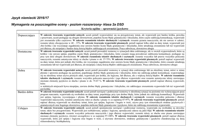 Język niemiecki 2016/17 Wymagania na poszczególne oceny - poziom rozszerzony- klasa 2a DSD Kryteria ogólne – sprawności językowe Dopuszczająca Dostateczna Dobra Bardzo dobra Celująca W zakresie tworzenia wypowiedzi ustnych: uczeń potrafi wypowiedzieć się na przygotowany temat, ale wypowiedź jest bardzo krótka, powolna z przerwami, uczeń posługuje się ubogim słownictwem, popełnia liczne błędy gramatyczne i leksykalne, które często zakłócają komunikację, wypowiedź jest zrozumiała tylko częściowo. W zakresie rozumienia tekstów słuchanych i czytanych: rozumie pytania nauczyciela, ale nie zawsze w całości, rozumie teksty obcojęzyczne w 40 – 57%. W zakresie tworzenia wypowiedzi pisemnych: potrafi napisać kilka zdań na dany temat, wypowiedź jest zbyt krótka i nie wyczerpuje zagadnienia oraz zawiera bardzo liczne błędy gramatyczne i leksykalne, które utrudniają zrozumienie lub też wypowiedź jest dłuższa, ale niespójna z bardzo dużą ilością błędów zakłócających zrozumienie. Praca odtwórcza, słownictwo ubogie W zakresie tworzenia wypowiedzi ustnych: uczeń potrafi prowadzić rozmowę w sytuacjach dnia codziennego, ale w swoich wypowiedziach, które są krótkie i nie zawsze spójne, popełnia często błędy gramatyczne i leksykalne, które czasami mogą powodować zakłócenia komunikacji, posługuje się przy tym dość ubogim słownictwem. W zakresie rozumienia tekstów słuchanych i czytanych: rozumie wszystkie lub prawie wszystkie polecenia nauczyciela, rozumie autentyczne teksty ze słuchu i pisane w ok. 57-75%. W zakresie tworzenia wypowiedzi pisemnych: potrafi napisać wypowiedź na dany temat, która jest jednak zbyt krótka, nie wyczerpuje zagadnienia oraz zawiera liczne błędy gramatyczne i leksykalne, które czasami utrudniają zrozumienie lub też wypowiedź jest dłuższa, ale niespójna z dużą ilością błędów zakłócających zrozumienie. Praca odtwórcza, słownictwo ubogie W zakresie tworzenia wypowiedzi ustnych: uczeń potrafi prowadzić rozmowę w sytuacji dnia codziennego lub na określony temat, mówi w miarę płynnie i sprawnie posługuje się językiem, popełniając drobne błędy gramatyczne i leksykalne, które nie zakłócają jednak komunikacji, wypowiadając się na określony temat używa prostych zdań, wypowiedź jest krótka, ale logiczna, lub dłuższa, ale z większą ilością błędów. W zakresie rozumienia tekstów słuchanych i czytanych: rozumie wszystkie polecenia nauczyciela i jego dłuższe wypowiedzi oraz rozumie autentyczne teksty zawierające nieznane elementy językowe ze słuchu i pisane w ok. 75-87 %. W zakresie tworzenia wypowiedzi pisemnych: potrafi napisać dłuższą wypowiedź, która w niektórych miejscach bywa niespójna, zawiera drobne błędy gramatyczne i leksykalne, nie zakłócające zrozumienia wypowiedzi lub też wypowiedź jest krótka W zakresie tworzenia wypowiedzi ustnych: uczeń potrafi nawiązać i podtrzymać rozmowę w określonej sytuacji na poziomie nie wykraczającym poza program nauczania, wypowiada się swobodnie na dany temat, popełniając przy tym drobne błędy, które jednak nie zakłócają komunikacji. Wypowiedź jest spójna, logiczna, wyczerpująca i płynna. W zakresie rozumienia tekstów słuchanych i czytanych: rozumie wszystkie polecenia i dłuższe wypowiedzi nauczyciela, rozumie autentyczny tekst ze słuchu i pisany w co najmniej 87-97%. W zakresie tworzenia wypowiedzi pisemnych: potrafi napisać dłuższą wypowiedź na określony temat, która jest spójna, logiczna i bogata w treść, używa przy tym różnorodnych struktur językowych i gramatycznych oraz bogatego słownictwa, popełnia nieliczne błędy gramatyczne i językowe, które nie zakłócają zrozumienia wypowiedzi. W zakresie tworzenia wypowiedzi ustnych: uczeń potrafi spontanicznie nawiązać i podtrzymać rozmowę, wypowiada się swobodnie na dowolny temat, także bez przygotowania. Wypowiedź jest rozbudowana, spójna i logiczna, sporadycznie zdarza się jakiś błąd. W zakresie rozumienia tekstów słuchanych i czytanych: rozumie wszystkie polecenia nauczyciela i jego dłuższe wypowiedzi, rozumie teksty ze słuchu oraz pisane zawierające nieznane elementy językowe, również szczegółowo w co najmniej 97-100%. W zakresie tworzenia wypowiedzi pisemnych: potrafi napisać dłuższą wypowiedź, która jest spójna i logiczna oraz bogata w treść, a używane słownictwo, struktury gramatyczne i językowe charakteryzują się dużą różnorodnością i bezbłędnością. 1 Wymagania na poszczególne oceny według podręcznika Alles klar 2a i 2b dla klasy II DSD, I okres- rozdziały 4- 8, II okres – rozdziały 9-12 oraz materiały DSD wg powyższych wymagań sprawnościowych Alles klar 2. Zakres rozszerzony Ocena Dopuszczająca Kapitel 4: Określić przedstawione na obrazkach wartości i niepokoje w życiu człowieka; podać podstawowe informacje na temat swojego przyjaciela; podać swoje skojarzenia związane ze słowem „Liebe; podać zasady tworzenia zdań z zaimkiem wzajemnym einander; podać zasady tworzenia zdań czasowych ze spójnikami während, bevor, seidem i bis; podać rodzaj rzeczowników na podstawie niektórych zakończeń; zrozumieć tekst ze słuchu lub pisany o niskim stopniu trudności, korzystając z pomocy nauczyciela lub kolegów; stosować zasady wymowy i pisowni z licznymi uchybieniami; napisać e-mail oraz list prywatny, zachowując częściowo właściwą formę, częściowo spójny i logiczny układ tekstu oraz wykorzystując bardzo ubogie struktury leksykalno-gramatyczne; opisać obrazek, odpowiadać na pytania z nim związane oraz przeprowadzić rozmowę z odgrywaniem roli, wykorzystując bardzo ubogie struktury leksykalnogramatyczne. Kapitel 5: Dopasować do obrazków nazwy krajobrazów; podać kilka informacji na temat pogody; podać nazwy podstawowych klęsk żywiołowych; podać wybrane przyczyny wypadków górskich; podać zasady