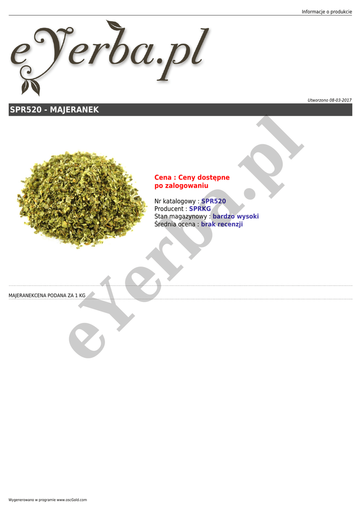Informacje o produkcie Utworzono 08-03-2017 a. pl SPR520 - MAJERANEK Cena : Ceny dostępne po zalogowaniu er b Nr katalogowy : SPR520 Producent : SPRKG Stan magazynowy : bardzo wysoki Średnia ocena : brak recenzji eY MAJERANEKCENA PODANA ZA 1 KG Wygenerowano w programie www.oscGold.com
