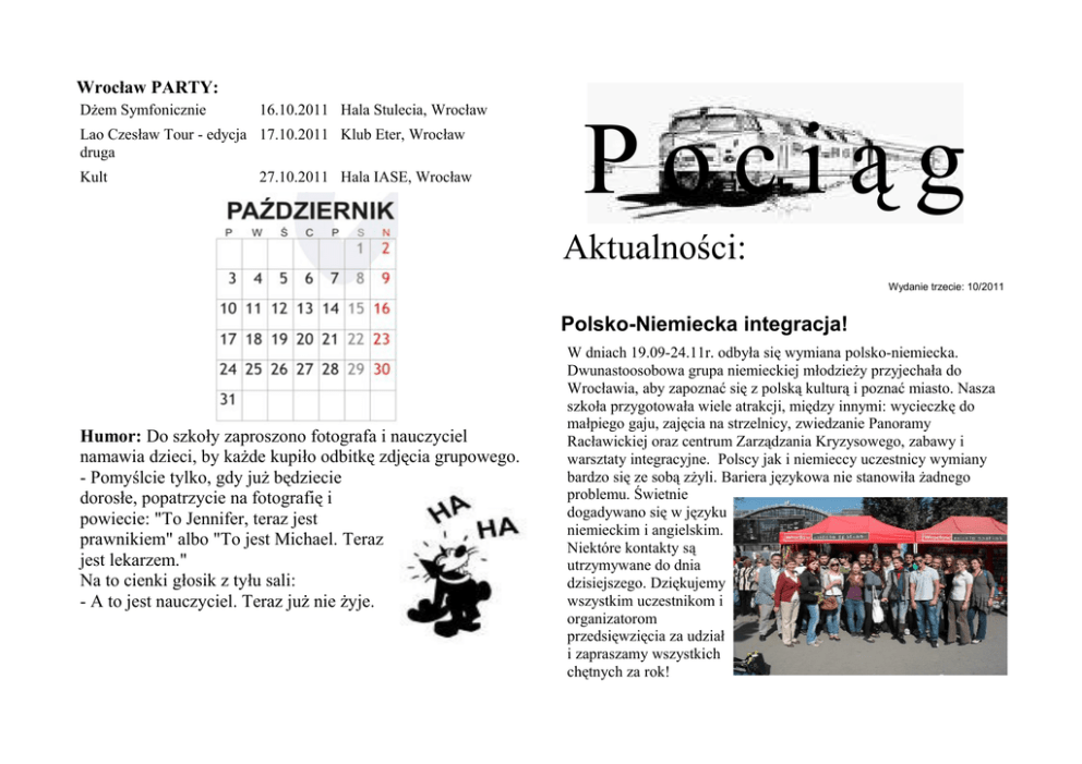 Wrocław PARTY: Dżem Symfonicznie 16.10.2011 Hala Stulecia, Wrocław Lao Czesław Tour - edycja 17.10.2011 Klub Eter, Wrocław druga Kult 27.10.2011 Hala IASE, Wrocław Pociąg Aktualności: Wydanie trzecie: 10/2011 Polsko-Niemiecka integracja! Humor: Do szkoły zaproszono fotografa i nauczyciel namawia dzieci, by każde kupiło odbitkę zdjęcia grupowego. - Pomyślcie tylko, gdy już będziecie dorosłe, popatrzycie na fotografię i powiecie: "To Jennifer, teraz jest prawnikiem" albo "To jest Michael. Teraz jest lekarzem." Na to cienki głosik z tyłu sali: - A to jest nauczyciel. Teraz już nie żyje. W dniach 19.09-24.11r. odbyła się wymiana polsko-niemiecka. Dwunastoosobowa grupa niemieckiej młodzieży przyjechała do Wrocławia, aby zapoznać się z polską kulturą i poznać miasto. Nasza szkoła przygotowała wiele atrakcji, między innymi: wycieczkę do małpiego gaju, zajęcia na strzelnicy, zwiedzanie Panoramy Racławickiej oraz centrum Zarządzania Kryzysowego, zabawy i warsztaty integracyjne. Polscy jak i niemieccy uczestnicy wymiany bardzo się ze sobą zżyli. Bariera językowa nie stanowiła żadnego problemu. Świetnie dogadywano się w języku niemieckim i angielskim. Niektóre kontakty są utrzymywane do dnia dzisiejszego. Dziękujemy wszystkim uczestnikom i organizatorom przedsięwzięcia za udział i zapraszamy wszystkich chętnych za rok! Samorząd uczniowski: Nauczycielskie święto! Dnia 14 października uroczyście jest obchodzony Dzień Edukacji Narodowej w instytucjach związanych z edukacją, jest to okazja do nagradzania wyróżniających się dla edukacji osób. Minister Edukacji Narodowej wręcza nauczycielom złote, srebrne, brązowe Krzyże Zasługi, medale Komisji Edukacji Narodowej oraz nagrody Ministra Edukacji Narodowej za osiągnięcia dydaktyczno-wychowawcze. Odznaczenia i wyróżnienia dla nauczycieli wręczane są przez kuratorów oświaty, władze samorządowe oraz dyrektorów szkół na uroczystościach organizowanych z tej okazji. Mamy nadzieję, że i Wy nagrodzicie swojego nauczyciela za trud i ciężką pracę jaką wykonują. Ściąga: SAVOIR VIVRE Głośny śmiech Nie ma chyba nic bardziej wulgarnego, prostackiego i kompromitującego niż głośny śmiech w miejscu publicznym lub w towarzystwie, które nie jest stanowione przez grono najbliższych przyjaciół. Są oczywiście różne gatunki śmiechu. Niektórzy śmieją się w sposób szczególnie paskudny. Trzeba by nagrać swój śmiech i przesłuchać nagranie, dać je do przesłuchania innym, ewentualnie, zrezygnować już na zawsze, niezależnie od okoliczności, z głośnego wybuchania śmiechem. Gdy jesteśmy w małym, zaprzyjaźnionym gronie w restauracji, kawiarni, teatrze lub na przyjęciu i ktoś opowiada coś niesłychanie zabawnego, ściszmy nasz śmiech do takiego poziomu, że można by go nazwać śmiechem-szeptem. Funkcja kwadratowa 1.Postać ogólna funkcji kwadratowej 2 y=ax +bx+c 2.Postać kanoniczna funkcji kwadratowej y=a(x-p)2+q Wzór na deltę ∆=b2 -4ac Ważne daty: 14 października - Dzień Edukacji Narodowej 16 października - Dzień Papieża Jana Pawła II 19 października - Dzień Ratownika (Polska) 24 października - Światowy Dzień Informacji 29 października - Dzień bez Zakupów 31 października - Światowy Dzień Oszczędności.