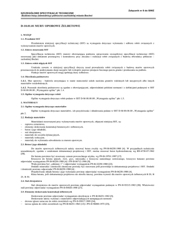 Załącznik nr 8 do SIWZ SZCZEGÓŁOWE SPECYFIKACJE TECHNICZNE Budowa trasy (obwodnicy) północno-zachodniej miasta Bochni D-10.01.01 MURY OPOROWE śELBETOWE 1. WSTĘP 1.1. Przedmiot SST Przedmiotem niniejszej specyfikacji technicznej (SST) są wymagania dotyczące wykonania i odbioru robót związanych z wykonywaniem murów oporowych. 1.2. Zakres stosowania SST Specyfikacja techniczna (SST) stanowi obowiązującą podstawę opracowania szczegółowej specyfikacji technicznej (SST) stosowanej jako dokument przetargowy i kontraktowy przy zlecaniu i realizacji robót związanych z budową obwodnicy północno – zachodniej Bochni. 1.3. Zakres robót objętych SST Ustalenia zawarte w niniejszej specyfikacji dotyczą zasad prowadzenia robót związanych z budową murów oporowych przeznaczonych do podtrzymania skarp nasypów lub wykopów poprzez przejęcie bocznego parcia gruntu i przekazania na podłoże. Funkcje murów oporowych mogą spełniają mury żelbetowe. 1.4. Określenia podstawowe 1.4.1. Mur oporowy - budowla utrzymująca w stanie stateczności uskok naziomu gruntów rodzimych lub nasypowych albo innych materiałów rozdrobnionych. 1.4.2. Pozostałe określenia podstawowe są zgodne z obowiązującymi, odpowiednimi polskimi normami i z definicjami podanymi w SST D-M-00.00.00 „Wymagania ogólne” pkt 1.4. 1.5. Ogólne wymagania dotyczące robót Ogólne wymagania dotyczące robót podano w SST D-M-00.00.00 „Wymagania ogólne” pkt 1.5. 2. MATERIAŁY 2.1. Ogólne wymagania dotyczące materiałów Ogólne wymagania dotyczące materiałów, ich pozyskiwania i składowania podano w SST D-M-00.00.00 „Wymagania ogólne” pkt 2. 2.2. Rodzaje materiałów − − − − − − − Materiałami stosowanymi przy wykonywaniu murów oporowych, objętymi niniejszą SST, są: zaprawa cementowa, elementy deskowania konstrukcji betonowych i żelbetowych, beton i jego składniki, stal zbrojeniowa, materiały do szczelin dylatacyjnych, materiały izolacyjne, materiały do wykonania odwodnienia za murem oporowym. 2.3. Beton i jego składniki Do murów oporowych żelbetowych należy stosować beton zwykły wg PN-B-06250:1988 [4]. W przypadkach technicznie uzasadnionych, zgodnie z ustaleniami dokumentacji projektowej i SST, można stosować beton hydrotechniczny wg BN-6738-07:1962 [38]. Do betonu powinien być stosowany cement powszechnego użytku, wg PN-B-19701:1997 [17]. Kruszywo do betonu (piasek, żwir, grys, mieszanka z kruszywa naturalnego sortowanego, kruszywo łamane) powinno odpowiadać wymaganiom PN-B-06250:1988 [4] i PN-B-06712:1986 [9]. Woda powinna być „odmiany 1” i odpowiadać wymaganiom PN-B-32250:1988 [23]. Dodatki mineralne i domieszki chemiczne powinny być stosowane jeśli przewiduje to dokumentacja projektowa i SST. Dodatki i domieszki powinny odpowiadać PN-B-06250:1988 [4] . Projektowanie składu betonu i jego wykonanie powinny odpowiadać wymaganiom PN-B-06250:1988 [4]. Klasa betonu, jeśli dokumentacja projektowa nie określa inaczej, powinna wynosić dla murów oporowych żelbetowych B 20, B 25, B 30. 2.4. Stal zbrojeniowa Stal zbrojeniowa do murów oporowych powinna odpowiadać wymaganiom podanym w PN-H-93215:1982 [28]. Właściwości stali powinny odpowiadać wymaganiom PN-H-84020:1988 [27]. 2.5. Elementy deskowania konstrukcji Ŝelbetowych − − Deskowanie powinno odpowiadać wymaganiom określonym w PN-B-06251:1963 [5]. Deskowanie należy wykonać z materiałów odpowiadających następującym normom: drewno iglaste tartaczne do robót ciesielskich wg PN-D-95017:1989 [24], tarcica iglasta do robót ciesielskich wg PN-B-06251:1963 [13] i PN-D-96000:1975 [25], Załącznik nr 8 do SIWZ SZCZEGÓŁOWE SPECYFIKACJE TECHNICZNE Budowa trasy (obwodnicy) północno-zachodniej miasta Bochni − − − − tarcica iglasta do drobnych elementów jak kliny, klocki itp. wg PN-D-96002:1972 [26], gwoździe wg BN-5028-12:1987 [35], śruby, wkręty do drewna i podkładki do śrub wg PN-M-82121:1988 [30], PN-M-82503:1985 [31], PN-M-82505:1985 [32] i PN-M82010:1959 [29], płyty pilśniowe z drewna wg BN-7122-11:1969 [42]. Dopuszcza się wykonanie deskowań z innych materiałów, pod warunkiem akceptacji Zamawiającego. 2.9. Materiały do szczelin dylatacyjnych Do dylatacji należy zastosować taśmy dylatacyjne zewnętrzne TRICOSAL DA240 i TRICOSAL FA/2/3, posiadające aprobatę techniczną wydaną przez uprawnioną jednostkę. 2.10. Materiały izolacyjne a) b) c) d) e) f) g) h) i) Do izolacji murów oporowych można stosować następujące materiały: lepik asfaltowy stosowany na zimno wg PN-B-24620:1998 [10], roztwór asfaltowy do gruntowania powierzchni ścian przed ułożeniem właściwej powłoki izolacyjnej wg PN-B-24622:1974 [19], lepik asfaltowy z wypełniaczami stosowany na gorąco wg PN-B-24625:1957 [20], asfaltową emulsję kationową do gruntowania powierzchni wg BN-6771-02:1971 [41], emulsję asfaltową wg BN-6753-01:1982 [40], kit asfaltowy uszczelniający wg PN-B-30175:1974 [22], papę asfaltową na tekturze budowlanej wg PN-B-27617:1989 [21], papę asfaltową na włókninie przyszywanej wg BN-6751-04:1987 [39], inne materiały izolacyjne posiadające aprobatę techniczną wydaną przez uprawnioną jednostkę. Zastosowane materiały izolacyjne muszą być zaakceptowane przez Zamawiającego. 2.11. Materiały do wykonania odwodnienia za murem oporowym Warstwy filtracyjne za murem oporowym mogą być wykonywane z materiałów takich jak żwir, mieszanka, piasek gruby i średni, odpowiadających wymaganiom PN-B-06716:1991 [15] i PN-B-11111:1996 [16]. Rury drenarskie karbowane z PVC–U o φ126/113 mm powinny odpowiadać normie BN-6354-12:1978 [36]. Przy wykonaniu odwodnienia zastosować chudy beton klasy 7,5. Izolacja przeciwwilgociowa wykonana z izolbetu A i izolbetu DP 3. SPRZĘT 3.1. Ogólne wymagania dotyczące sprzętu Ogólne wymagania dotyczące sprzętu podano w SST D-M-00.00.00 „Wymagania ogólne” pkt 3. 3.2. Sprzęt do wykonania murów oporowych Wy