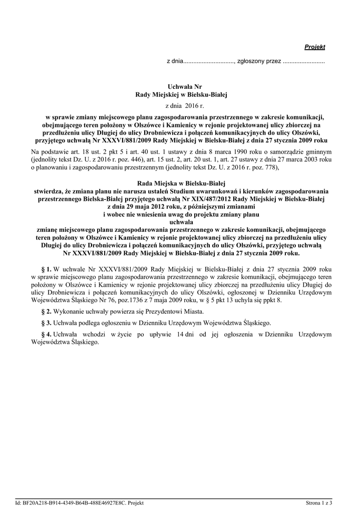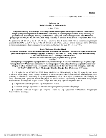 Projekt z dnia.............................., zgłoszony przez ......................... Uchwała Nr Rady Miejskiej w Bielsku-Białej z dnia 2016 r. w sprawie zmiany miejscowego planu zagospodarowania przestrzennego w zakresie komunikacji, obejmującego teren położony w Olszówce i Kamienicy w rejonie projektowanej ulicy zbiorczej na przedłużeniu ulicy Długiej do ulicy Drobniewicza i połączeń komunikacyjnych do ulicy Olszówki, przyjętego uchwałą Nr XXXVI/881/2009 Rady Miejskiej w Bielsku-Białej z dnia 27 stycznia 2009 roku Na podstawie art. 18 ust. 2 pkt 5 i art. 40 ust. 1 ustawy z dnia 8 marca 1990 roku o samorządzie gminnym (jednolity tekst Dz. U. z 2016 r. poz. 446), art. 15 ust. 2, art. 20 ust. 1, art. 27 ustawy z dnia 27 marca 2003 roku o planowaniu i zagospodarowaniu przestrzennym (jednolity tekst Dz. U. z 2016 r. poz. 778), Rada Miejska w Bielsku-Białej stwierdza, że zmiana planu nie narusza ustaleń Studium uwarunkowań i kierunków zagospodarowania przestrzennego Bielska-Białej przyjętego uchwałą Nr XIX/487/2012 Rady Miejskiej w Bielsku-Białej z dnia 29 maja 2012 roku, z późniejszymi zmianami i wobec nie wniesienia uwag do projektu zmiany planu uchwala zmianę miejscowego planu zagospodarowania przestrzennego w zakresie komunikacji, obejmującego teren położony w Olszówce i Kamienicy w rejonie projektowanej ulicy zbiorczej na przedłużeniu ulicy Długiej do ulicy Drobniewicza i połączeń komunikacyjnych do ulicy Olszówki, przyjętego uchwałą Nr XXXVI/881/2009 Rady Miejskiej w Bielsku-Białej z dnia 27 stycznia 2009 roku. § 1. W uchwale Nr XXXVI/881/2009 Rady Miejskiej w Bielsku-Białej z dnia 27 stycznia 2009 roku w sprawie miejscowego planu zagospodarowania przestrzennego w zakresie komunikacji, obejmującego teren położony w Olszówce i Kamienicy w rejonie projektowanej ulicy zbiorczej na przedłużeniu ulicy Długiej do ulicy Drobniewicza i połączeń komunikacyjnych do ulicy Olszówki, ogłoszonej w Dzienniku Urzędowym Województwa Śląskiego Nr 76, poz.1736 z 7 maja 2009 roku, w § 5 pkt 13 uchyla się ppkt 8. § 2. Wykonanie uchwały powierza się Prezydentowi Miasta. § 3. Uchwała podlega ogłoszeniu w Dzienniku Urzędowym Województwa Śląskiego. § 4. Uchwała wchodzi w życie po upływie 14 dni od jej ogłoszenia w Dzienniku Urzędowym Województwa Śląskiego. Id: BF20A218-B914-4349-B64B-488E46927E8C. Projekt Strona 1 z 3 Uzasadnienie 1.Projekt zmiany miejscowego planu zagospodarowania przestrzennego sporządzany jest na podstawie uchwały Nr X/164/2015 Rady Miejskiej w Bielsku-Białej z dnia 25 sierpnia 2015 roku w sprawie przystąpienia do sporządzenia zmiany miejscowego planu zagospodarowania przestrzennego w zakresie komunikacji, obejmującego teren położony w Olszówce i Kamienicy w rejonie projektowanej ulicy zbiorczej na przedłużeniu ulicy Długiej do ulicy Drobniewicza i połączeń komunikacyjnych do ulicy Olszówki. Teren objęty projektem zmiany planu położony jest w południowej części miasta Bielsko-Biała, w obrębach Kamienica i Olszówka Dolna, przy Alei Armii Krajowej. Powierzchnia terenu wynosi ok. 17,0 ha, znajdują się tu obiekty Szpitala Wojewódzkiego, w tym spalarnia odpadów medycznych. Obsługa komunikacyjna odbywa sie przez Aleję Armii Krajowej oraz ulicę Św. Andrzeja Boboli. W terenie tym obowiązuje miejscowy plan zagospodarowania przestrzennego w zakresie komunikacji, obejmujący teren położony w Olszówce i Kamienicy w rejonie projektowanej ulicy zbiorczej na przedłużeniu ulicy Długiej do ulicy Drobniewicza i połączeń komunikacyjnych do ulicy Olszówki (uchwała Nr XXXVI/881/2009 Rady Miejskiej w Bielsku-Białej z dnia 27 stycznia 2009 roku). Zmiana ww. planu miejscowego opracowywana jest na wniosek Komisji Gospodarki Przestrzennej i Ochrony Środowiska Rady Miejskiej z dnia 22 kwietnia 2015 roku dotyczący likwidacji zapisu umożliwiającego istnienie spalarni odpadów medycznych w jednostce planu UZ-01. Zgodnie z wnioskiem spalarnia odpadów medycznych została wykreślona z § 5 pkt 13 obowiązującego planu. Punkt 13 zawiera listę przedsięwzięć stanowiących wyjątki w zakazie lokalizacji przedsięwzięć mogących znacząco oddziaływać na środowisko oraz przedsięwzięć, dla których obowiązek sporządzenia raportu oddziaływania na środowisko może być wymagany. Rysunek planu stanowiący załącznik nr 1 do ww. uchwały nie ulega zmianie. Zgodnie ze studium, które zostało przyjęte uchwałą Rady Miejskiej w Bielsku-Białej z dnia 29 maja 2012 roku Nr XIX/487/2012, obszar objęty zmianą planu położony jest w strefie usługowo-wytwórczej i oznaczony symbolem U – obszary koncentracji funkcji usługowej. W terenach tych możliwy jest rozwój i budowa specjalnych ośrodków usługowych m. in. związanych z ochroną zdrowia. W strefie tej dopuszczono usługi z wykluczeniem takich, które mogą powodować ponadnormatywne oddziaływanie na środowisko. 2.Procedura planistyczna rozpoczęła się w dniu 11 września 2015 roku ogłoszeniem w prasie lokalnej, obwieszczeniem w Urzędzie Miejskim w Bielsku-Białej, udostępnieniem informacji o przystąpieniu do sporządzania projektu planu w Biuletynie Informacji Publicznej na stronie internetowej Biura Rozwoju Miasta oraz zawiadomieniem organów właściwych do uzgadniania i opiniowania projektu planu. W październiku 2015 roku uzyskano pisma Państwowego Powiatowego Inspektora Sanitarnego w Bielsku-Białej oraz Regionalnego Dyrektora Ochrony Środowiska w Katowicach stwierdzające brak potrzeby przeprowadzenia strategicznej oceny oddziaływania na środowisko dla projektu zmiany planu. W lutym 2016 roku sporządzona została prognoza skutków finansowych uchwalenia zmiany planu. Projekt zmiany planu został uzgodniony i wyłożony do publicznego wglądu. Wyznaczony został termin dyskusji publicznej i składania uwag do projektu zmiany planu. 3.W obszarze objętym projektem zmiany planu, ze względu na zakres zmian