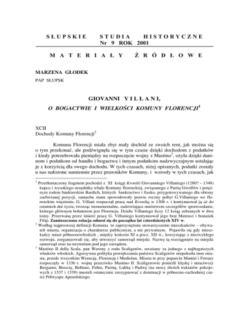 SŁUPSKIE STUDIA HISTORYCZNE Nr 9 ROK 2001 M A T E R I A Ł Y Ź R Ó D Ł O W E MARZENA GŁODEK PAP SŁUPSK GIOVANNI V I L L A N I, O BOGACTWIE I WIELKOŚCI KOMUNY FLORENCJI1 XCII Dochody Komuny Florencji2 Komuna Florencji miała zbyt mały dochód ze swoich rent, jak można się o tym przekonać, ale podźwignęła się w tym czasie dzięki dochodom z podatków i kiedy potrzebowała pieniędzy na rozpoczęcie wojny z Mastino3, ożyła dzięki daninom i podatkom od handlu i bogactwa i innym podatkom nadzwyczajnym ustalając je z korzyścią dla swego dochodu. W tych czasach, niżej opisanych, podatki zostały u nas nałożone sumiennie przez prawników Komuny, i wzrosły w tych czasach, jak 1 Przetłumaczony fragment pochodzi z XI księgi Kroniki Giovanniego Villaniego (1280? – 1348) kupca i wysokiego urzędnika władz Komuny florenckiej, związanego z Partią Gwelfów i potężnym rodem bankierskim Bardich, których bankructwo i fiasko, przygotowywanego dla obrony zachwianej pozycji, zamachu stanu spowodowały prawie roczny pobyt G.Villaniego we florenckim więzieniu. G. Villani rozpoczął pracę nad Kroniką w 1308 r. i kontynuował ją aż do ostatnich dni życia, tworząc monumentalne, zadziwiające mnóstwem szczegółów sprawozdanie, którego głównym bohaterem jest Florencja. Dzieło Villaniego liczy 12 ksiąg zebranych w dwa tomy. Przerwaną przez śmierć pracę G. Villaniego kontynuował jego brat Mateusz i bratanek Filip. Zamieszczona relacja odnosi się do początku lat czterdziestych XIV w. 2 Według najprostszej definicji Komuna to zaprzysiężone stowarzyszenie mieszkańców – obywateli miasta, organizacja o charakterze publicznym, a nie prywatnym. Pojawiła się gdy mieszkańcy miast północnowłoskich , między końcem XI a pocz. XII w., korzystając z niezwykłego rozwoju, zorganizowali się, aby utworzyć samorząd miejski. Nazwę tą rozciągnięto na miejski samorząd oraz na terytorium pod jego zarządem. 3 Mastino II della Scala, pan Werony z rodu Scaligerów, uważany za jednego z najbogatszych władców włoskich. Agresywna polityka powiększania państwa Scaligerów niepokoiła inne miasta, przede wszystkim Wenecję, Florencję i Mediolan. Miasta te przy poparciu Mantui i Ferrary rozpoczęły w 1336 r. wojnę przeciwko Mastino II. Scaligerowie ponieśli klęskę i utraciwszy Bergamo, Brescię, Belluno, Feltre, Parmę, Lukkę i Padwę (na mocy dwóch traktatów pokojowych z 1337 i 1339) musieli ostatecznie zrezygnować z dominacji w północno-zachodniej części Półwyspu Apenińskiego.