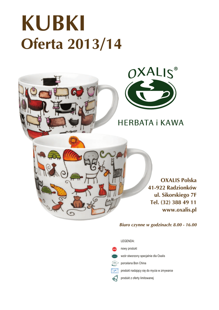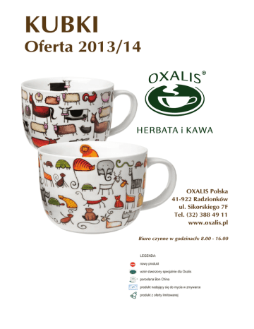KUBKI Oferta 2013/14 OXALIS Polska 41-922 Radzionków ul. Sikorskiego 7F Tel. (32) 388 49 11 www.oxalis.pl Biuro czynne w godzinach: 8.00 - 16.00 LEGENDA: nowy produkt wzór stworzony specjalnie dla Oxalis porcelana Bon China produkt nadający się do mycia w zmywarce produkt z oferty limitowanej Kubki do herbaty DOTYK AFRYKI 50967 kubek porcelanowy Poj. MIDORI 0,6 l 50475 Poj. kubek porcelanowy 0,5 l 40971 BUSINESS 50970 Poj. kubek porcelanowy BLUES 0,35 l 50978 Poj. PAJACYK 0,6 l 50883 Poj. kubek porcelanowy 0,3 l 40972 PORY ROKU 50971 kubek porcelanowy 2 Poj. kubek porcelanowy 0,45 l PTASZKI 50968 WESOŁE KOTY Poj. kubek porcelanowy 50872 0,3 l kubek porcelanowy Poj. 0,3 l 40966 40967 AZOR 50869 KONTYNENTY Poj. kubek porcelanowy 0,4 l kubek porcelanowy 0,4 l 50871 kubek porcelanowy Poj. 0,45 l FLOREK 50870 50591 TEA MOMENT 50572 kubek porcelanowy 50848 JAPOŃSKI BAMBUS Poj. 50589 0,6 l 3 kubek porcelanowy Poj. 0,6 l 40428 50964 40436 ASIAN GARDEN 50563 kubek porcelanowy HERBS TEA TIME Poj. 50966 0,4 l kubek porcelanowy Poj. 0,25 l z metalowym zaparzaczem 50848 LAVENDER 50571 JAPOŃSKI BAMBUS Poj. kubek porcelanowy 50591 0,4 l z metalowym zaparzaczem BERTA 50982 0,35 l z metalowym zaparzaczem BRUNO Poj. kubek porcelanowy kubek porcelanowy Poj. 50983 0,35 l z metalowym zaparzaczem Poj. kubek porcelanowy z metalowym zaparzaczem 4 0,35 l HERBS CHERRY 50965 kubek porcelanowy HERBS VINONA Poj. 50464 0,28 l z metalowym zaparzaczem HERBS MIĘTA 50448 kubek porcelanowy kubek porcelanowy Poj. 0,33 l HERBS RUMIANEK Poj. 50449 0,33 l z metalowym zaparzaczem kubek porcelanowy 15,90 zł (19,56 zł) z metalowym zaparzaczem Poj. 0,33 l z metalowym zaparzaczem 40964 40954 MAŁA GEJSZA TAJEMNICZY OGRÓD 50474 kubek porcelanowy Poj. 50473 kubek porcelanowy o podwójnej ściance 0,33 l z metalowym zaparzaczem o podwójnej ściance 5 Poj. 0,33 l PIRUM 50471 kubek porcelanowy Poj. NARANJA 0,33 l 50472 Poj. kubek porcelanowy o podwójnej ściance o podwójnej ściance z metalowym zaparzaczem z metalowym zaparzaczem 0,33 l (23,36 zł) 40980 PERU 50476 KROPKI Poj. kubek porcelanowy 50980 0,33 l Poj. kubek porcelanowy 0,75 l o podwójnej ściance z metalowym zaparzaczem FARMA 50962 Poj. kubek porcelanowy ZOO 50963 0,75 l 6 Poj. kubek porcelanowy 18,99 zł 0,75 l JAZZ 50979 SŁOŃ Poj. kubek porcelanowy 50853 0,75 l Kubki świąteczne Poj. kubek porcelanowy 0,75 l Kubki do kawy 40404 40094 50 g 40968 100 g GWIAZDY 50609 kubek porcelanowy REBECA 50877 KAWA Poj. kubek porcelanowy 0,2 l 50972 Poj. ANTONIO 0,3 l 50876 7 Poj. kubek porcelanowy 0,3 l Poj. kubek porcelanowy 0,3 l