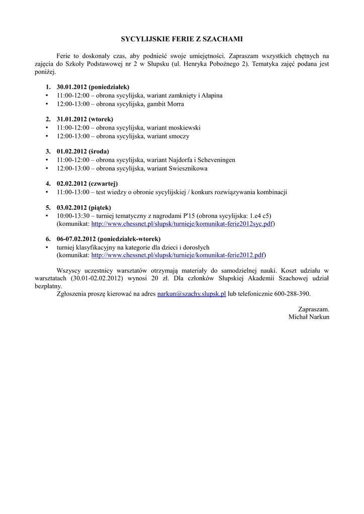 SYCYLIJSKIE FERIE Z SZACHAMI Ferie to doskonały czas, aby podnieść swoje umiejętności. Zapraszam wszystkich chętnych na zajęcia do Szkoły Podstawowej nr 2 w Słupsku (ul. Henryka Pobożnego 2). Tematyka zajęć podana jest poniżej. 1. 30.01.2012 (poniedziałek) • 11:00-12:00 – obrona sycylijska, wariant zamknięty i Ałapina • 12:00-13:00 – obrona sycylijska, gambit Morra 2. 31.01.2012 (wtorek) • 11:00-12:00 – obrona sycylijska, wariant moskiewski • 12:00-13:00 – obrona sycylijska, wariant smoczy 3. 01.02.2012 (środa) • 11:00-12:00 – obrona sycylijska, wariant Najdorfa i Scheveningen • 12:00-13:00 – obrona sycylijska, wariant Swiesznikowa 4. 02.02.2012 (czwartej) • 11:00-13:00 – test wiedzy o obronie sycylijskiej / konkurs rozwiązywania kombinacji 5. 03.02.2012 (piątek) • 10:00-13:30 – turniej tematyczny z nagrodami P'15 (obrona sycylijska: 1.e4 c5) (komunikat: http://www.chessnet.pl/slupsk/turnieje/komunikat-ferie2012syc.pdf) 6. 06-07.02.2012 (poniedziałek-wtorek) • turniej klasyfikacyjny na kategorie dla dzieci i dorosłych (komunikat: http://www.chessnet.pl/slupsk/turnieje/komunikat-ferie2012.pdf) Wszyscy uczestnicy warsztatów otrzymają materiały do samodzielnej nauki. Koszt udziału w warsztatach (30.01-02.02.2012) wynosi 20 zł. Dla członków Słupskiej Akademii Szachowej udział bezpłatny. Zgłoszenia proszę kierować na adres [email protected] lub telefonicznie 600-288-390. Zapraszam. Michał Narkun