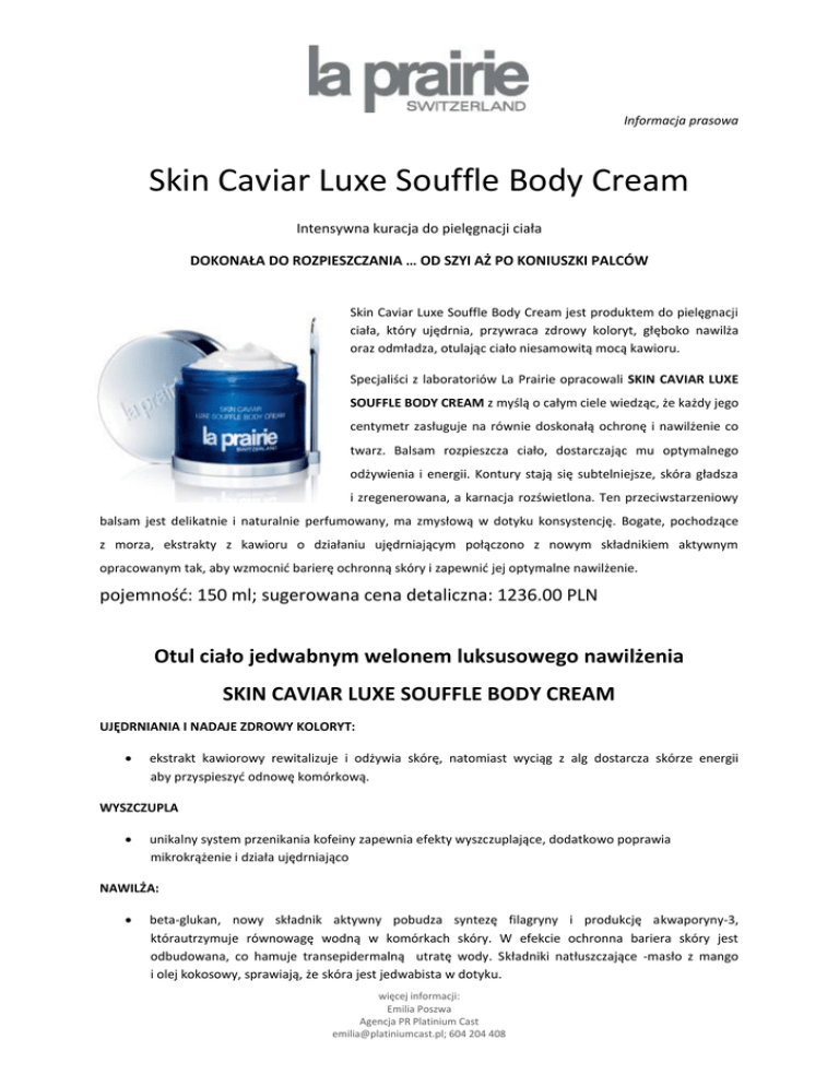 Informacja prasowa Skin Caviar Luxe Souffle Body Cream Intensywna kuracja do pielęgnacji ciała DOKONAŁA DO ROZPIESZCZANIA … OD SZYI AŻ PO KONIUSZKI PALCÓW Skin Caviar Luxe Souffle Body Cream jest produktem do pielęgnacji ciała, który ujędrnia, przywraca zdrowy koloryt, głęboko nawilża oraz odmładza, otulając ciało niesamowitą mocą kawioru. Specjaliści z laboratoriów La Prairie opracowali SKIN CAVIAR LUXE SOUFFLE BODY CREAM z myślą o całym ciele wiedząc, że każdy jego centymetr zasługuje na równie doskonałą ochronę i nawilżenie co twarz. Balsam rozpieszcza ciało, dostarczając mu optymalnego odżywienia i energii. Kontury stają się subtelniejsze, skóra gładsza i zregenerowana, a karnacja rozświetlona. Ten przeciwstarzeniowy balsam jest delikatnie i naturalnie perfumowany, ma zmysłową w dotyku konsystencję. Bogate, pochodzące z morza, ekstrakty z kawioru o działaniu ujędrniającym połączono z nowym składnikiem aktywnym opracowanym tak, aby wzmocnić barierę ochronną skóry i zapewnić jej optymalne nawilżenie. pojemność: 150 ml; sugerowana cena detaliczna: 1236.00 PLN Otul ciało jedwabnym welonem luksusowego nawilżenia SKIN CAVIAR LUXE SOUFFLE BODY CREAM UJĘDRNIANIA I NADAJE ZDROWY KOLORYT: ekstrakt kawiorowy rewitalizuje i odżywia skórę, natomiast wyciąg z alg dostarcza skórze energii aby przyspieszyć odnowę komórkową. WYSZCZUPLA unikalny system przenikania kofeiny zapewnia efekty wyszczuplające, dodatkowo poprawia mikrokrążenie i działa ujędrniająco NAWILŻA: beta-glukan, nowy składnik aktywny pobudza syntezę filagryny i produkcję akwaporyny-3, którautrzymuje równowagę wodną w komórkach skóry. W efekcie ochronna bariera skóry jest odbudowana, co hamuje transepidermalną utratę wody. Składniki natłuszczające -masło z mango i olej kokosowy, sprawiają, że skóra jest jedwabista w dotyku. więcej informacji: Emilia Poszwa Agencja PR Platinium Cast [email protected]; 604 204 408 Informacja prasowa ZŁUSZCZA I WYGŁADZA: kompleks zawierający ekstrakty z drożdży, kory wierzby i aminokwasów soi, złuszcza naskórek dając efekt maksymalnego wygładzenia i poprawy wyglądu skóry DZIAŁA PRZECIWSTARZENIOWO rozświetlający skórę kompleks botaniczny, redukuje pojawianie się plam starczych opatentowany kompleks sfermentowanych antyoksydantów, chroni przed uszkodzeniami wywołanymi zanieczyszczeniami środowiska, chroni barierę lipidową, DNA komórek oraz włókna kolagenowe i elastynę przed procesem glikacji Jak stosować: Używać RANO i/lub WIECZOREM. Rozprowadzić na całe ciało po kąpieli. Dla lepszych rezultatów używać produktu w ciągu 3 minut po umyciu co zwiększy ilość zatrzymywanej wody w skórze. Opis produktu: Opakowanie: niebieski szklany słoiczek typowy dla linii Skin Caviar więcej informacji: Emilia Poszwa Agencja PR Platinium Cast [email protected]; 604 204 408