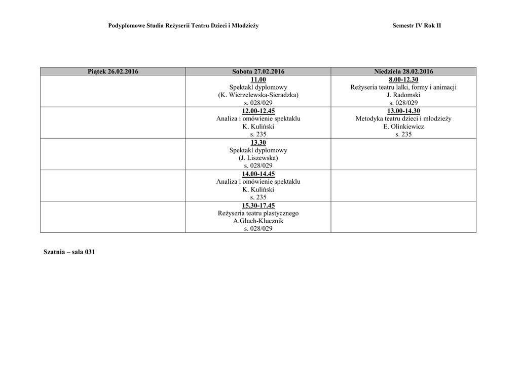 Podyplomowe Studia Reżyserii Teatru Dzieci i Młodzieży Piątek 26.02.2016 Szatnia – sala 031 Sobota 27.02.2016 11.00 Spektakl dyplomowy (K. Wierzelewska-Sieradzka) s. 028/029 12.00-12.45 Analiza i omówienie spektaklu K. Kuliński s. 235 13.30 Spektakl dyplomowy (J. Liszewska) s. 028/029 14.00-14.45 Analiza i omówienie spektaklu K. Kuliński s. 235 15.30-17.45 Reżyseria teatru plastycznego A.Głuch-Klucznik s. 028/029 Semestr IV Rok II Niedziela 28.02.2016 8.00-12.30 Reżyseria teatru lalki, formy i animacji J. Radomski s. 028/029 13.00-14.30 Metodyka teatru dzieci i młodzieży E. Olinkiewicz s. 235 Podyplomowe Studia Reżyserii Teatru Dzieci i Młodzieży Piątek 11.03.2016 Szatnia - 031 Sobota 12.03.2016 10.00-14.30 Reżyseria teatru lalki, formy i animacji J. Radomski s. 028/029 14.30-17.30 Reżyseria teatru plastycznego A.Głuch-Klucznik s. 028/029 Semestr IV Rok II Niedziela 13.03.2016 9.00-12.00 Reżyseria teatru plastycznego A.Głuch-Klucznik s. 028/029 12.15-14.30 Metodyka teatru dzieci i młodzieży E. Olinkiewicz s. 235 Podyplomowe Studia Reżyserii Teatru Dzieci i Młodzieży Piątek 18.03.2016 Szatnia - 031 Sobota 19.03.2016 9.00-11.15 Reżyseria teatru lalki, formy i animacji J. Radomski s. 027 (egzamin) 12.00 Spektakl dyplomowy (P. Koniarska) Czarna Sala 12.45-13.30 Analiza i omówienie spektaklu K. Kuliński s. 235 14.30-17.30 Reżyseria teatru plastycznego A.Głuch-Klucznik s. 028/029 (egzamin) Semestr IV Rok II Niedziela 20.03.2016 8.15-10.30 E. Olinkiewicz s. 235 Podyplomowe Studia Reżyserii Teatru Dzieci i Młodzieży Piątek 01.04.2016 Sobota 02.04.2016 11.00 Spektakl dyplomowy (M. Karmińska) s. 028/029 12.00-12.45 Analiza i omówienie spektaklu K. Kuliński s. 235 13.00 Spektakl dyplomowy (J.Lewandowska) s. 028/029 13.45-14.30 Analiza i omówienie spektaklu K. Kuliński s. 235 Szatnia - 031 Semestr IV Rok II Niedziela 03.04.2016 Podyplomowe Studia Reżyserii Teatru Dzieci i Młodzieży Piątek 15.04.2016 Sobota 16.04.2016 11.00 Spektakl dyplomowy (K. Szczepanowska) Czarna Sala 12.00-12.45 Analiza i omówienie spektaklu A. Głuch-Klucznik s. 235 13.00 Spektakl dyplomowy (J. Kwiatkowska) s. 028/029 14.00-15.30 Analiza i omówienie spektaklu K. Kuliński s. 235 16.00-19.45 Reżyseria teatru ruchu E. Ciszewska s. 230/231 20.00-21.30 E. Olinkiewicz s. 235 (zaliczenie) Szatnia - 031 Semestr IV Rok II Niedziela 17.04.2016 9.00-12.45 Muzyka w teatrze M. Jaworska-Kaczmarek s. 051 13.00 Spektakl dyplomowy (P.Kontny) s. 028/029 14.00-14.45 Analiza i omówienie spektaklu A. Głuch-Klucznik s. 235 Podyplomowe Studia Reżyserii Teatru Dzieci i Młodzieży Piątek 22.04.2016 Sobota 23.04.2016 9.00 Spektakl dyplomowy (Z. Bartczak) s. 028/029 10.00-10.45 Analiza i omówienie spektaklu K. Kuliński s. 235 12.00 Spektakl dyplomowy (G. Kowal) s. 028/029 13.00-13.45 Analiza i omówienie spektaklu K. Kuliński s. 235 14.30-18.00 Reżyseria teatru ruchu E. Ciszewska s. 230/231 Szatnia - 031 Semestr IV Rok II Niedziela 24.04.2016 8.45-11.00 Muzyka w teatrze M. Jaworska-Kaczmarek s. 051 11.00 Spektakl dyplomowy (I. Spławska) s. 028/029 12.00-12.45 Analiza i omówienie spektaklu K. Kuliński s. 235 13.00 Spektakl dyplomowy (J. Busz) s. 028/029 14.00-14.45 Analiza i omówienie spektaklu K. Kuliński s. 235 Podyplomowe Studia Reżyserii Teatru Dzieci i Młodzieży Piątek 06.05.2016 18.00-21.00 Techniki interpersonalne w procesie reżyserskim D. Bielska s. 230/231 Sobota 07.05.2016 8.45-11.00 Muzyka w teatrze M. Jaworska-Kaczmarek s. 051 Niedziela 08.05.2016 10.00 Spektakl dyplomowy (A. Smoliński) s. 028/029 11.00 Spektakl dyplomowy (E.Adamowicz) s. 028/029 10.45-11.30 Analiza i omówienie spektaklu K. Kuliński s. 235 11.45-12.30 Analiza i omówienie spektaklu K. Kuliński s. 235 12.30 Spektakl dyplomowy (A.Marcowska) s. 235 12.00 Spektakl dyplomowy (M. Ochenduszko) s. 028/029 13.15-14.00 Analiza i omówienie spektaklu K. Kuliński s. 235 15.00-19.00 Reżyseria teatru ruchu E. Ciszewska s. 230/231 Szatnia - 031 Semestr IV Rok II 12.45-13.30 Analiza i omówienie spektaklu K. Kuliński s. 235 13.30-15.30 Reżyseria teatru ruchu E. Ciszewska s. 230/231 (egzamin) Podyplomowe Studia Reżyserii Teatru Dzieci i Młodzieży Piątek 20.05.2016 18.00-21.00 Techniki interpersonalne w procesie reżyserskim D. Bielska s. 230/231 Szatnia - 031 Sobota 21.05.2016 10.00-14.30 Techniki interpersonalne w procesie reżyserskim D. Bielska s. 230/231 15.30-18.30 Techniki interpersonalne w procesie reżyserskim D. Bielska s. 230/231 (zaliczenie) Semestr IV Rok II Niedziela 22.05.2016 9.00-12.00 Muzyka w teatrze M. Jaworska-Kaczmarek s. 051 13.00-16.00 Muzyka w teatrze M. Jaworska-Kaczmarek s. 051 (zaliczenie)