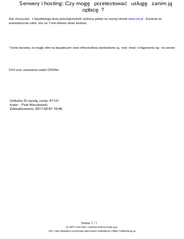 Serwery i hosting: Czy mog przetestowa opłac ? usług zanim j Aby skorzysta z bezpłatnego testu prosimyzamówi wybrany pakiet na naszej stronie www.cal.pl . Zostanie on automatycznie zało ony na 7-mio dniowy okres testowy. * konta testowe, ze wzgl dów na bezpiecze stwo infrastruktury pozbawione s mo lwio SSH oraz ustawienia zada CRONa. Unikalny ID rozwi zania: #1131 Autor: : Piotr Wesolowski Zaktualizowano: 2011-02-01 10:46 Strona 1 / 1 (c) 2017 John Doe <[email protected]> URL: http://helpdesk.cal.pl/index.php?action=artikel&cat=13&id=132&artlang=pl ci logowania si na serwer