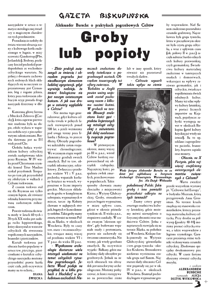 naszyjników w sztuce o te− matyce mitologicznej świad− czy o magicznym charakte− rze tych przedmiotów. Przeniknięcie ozdoby do świata wierzeń obrazują sce− ny z kultowego kotła znale− zionego w bagnie, w miej− scowości Gundestrup (Płw. Jutlandzki). Srebrny, pozła− cany kocioł pochodził praw− dopodobnie ze wschodnio− celtyckiego warsztatu. Na jednej z dwunastu zachowa− nych srebrnych blach skła− dających się na naczynie za− prezentowany jest Cernun− nos, bóg z rogami jelenia, który poza torkwesem zdo− biącym szyję posiada drugi naszyjnik dzierżony w dło− ni. Kamienną głowę herosa z Mšeckich Žehrovic (Cze− chy), która zapewne pierwo− tnie osadzona była na słu− pie, zdobi wykuta w wapie− niu ozdoba szyi z pieczątko− watymi zakończeniami. Rze− źba datowana jest na II−I wiek przed Chr. Ozdoba będąca wyróż− nikiem kultury celtyckiej została zaadaptowana także przez Rzymian. W IV wie− ku przed Chrystusem rzym− ski konsul Titus Manlius zyskał przydomek Torqua− tus po tym jak przyozdobił się zdobytym w walkach z Celtami torkwesem. Z czasem torkwes stał się dla Rzymian nie tylko cennym łupem, ale również odznaką honorową przyzna− waną zasłużonym żołnie− rzom. Powrót torkwesa do świa− ta mody w latach 60−tych i 70−tych XX wieku jest zasłu− gą ruchu hippisowskiego, który skorzystał ze wzorców celtyckich dla stworzenia współczesnych naszyjników, bransolet i pierścionków. Kształt torkwesa jest obecnie bardzo popularny w sztuce tzw. piercingu, pierś− cionkami o kształcie celty− ckiego naszyjnika możemy przyozdobić prawie każdą część ciała, jeśli oczywiście mamy na to ochotę... DIANA ŚWIĘCKA Aleksander Bursche o praktykach pogrzebowych Celtów by wojowników. Nad Sa− nem znaleziono pozostałości ceramiki grafitowej. Najcie− kawsza była grupa tyniecka, która w początkowym okre− sie była czystą grupą celtyc− ką, a wraz z upływem czasu (ok. połowy II w. p.n.e.) za− częła nabierać bardzo silnych cech kultury przeworskiej, czyli germańskiej. Świade− mczech znaleziono do− lub w inny sposób, który ctwa kultury materialnej wody świadczące o po− również nie pozostawał znalezione w tamtejszych grzebowych ucztach. Ob− trwałych śladów. osadach i domostwach, rzędom towarzyszyły też − Celtowie wywarli wskazujące na wpływy za− ofiary zwierzęce. W także wpływ na ziemie równo germańskie, jak i Yorkshire w Anglii celtyckie, świadczą o pewien ważny wojo− współistnieniu dwóch wnik został pocho− odrębnych kultur. wany razem z kilko− Mamy też silne wpły− ma swoimi końmi. wy kultury lateńskiej, W grobach na tere− w postaci licznych nie Słowacji znale− importów na Kuja− ziono kości gęsi − wach, pojedyncze za− ptaków kojarzonych bytki występują na− wg mitologii celty− wet w okolicach Bis− ckiej z zaświatami. kupina (gród kultury Jak dalej ewoluowa− łużyckiej już wtedy nie ły zwyczaje pogrze− istniał). Są to np. bowe? szklane i sapropelito− − W późniejszym we paciorki, branso− okresie, mniej więcej lety, brązowe zapinki po III w. p.n.e., wśród oraz monety. Celtów bardziej roz− − Obecnie, na X powszechniał się ob− Festynie, gdzie naj− rządek ciałopalny. więcej znajdziemy Najczęściej kości, po Wódz festynu Aleksander Bursche na co autentycznych ele− spaleniu zwłok zmar− dzień jest wykładowcą w Instytucie mentów związa− łych, przechowywano Archeologii Uniwersytetu Warszawskiego. nych z Celtami? fot. Ala Dużyk −Witkowska w popielnicach. Takie −Warto zwiedzić sposoby chowania znamy południowej Polski. Jakie przede wszystkim wystawę chociażby z miejscowości groby i inne pamiątki pt. “Celtowie lud Europy”, Kietrz, z Wyżyny Głubczy− przeszłości odkryto na w budynku Muzeum, którą ckiej. Groby, stosunkowo tych terenach? przygotowała Anna Gros− jeszcze bogato wyposażone, − Znamy cztery grupy sman. Na terenie kraalu w miarę upływu czasu, zwartego osadnictwa kultu− znajdują się stanowiska rze− gdzieś w okresie późnola− ry lateńskiej, gdzie może− mieślników, którzy prezen− tyńskim ok. II wieku p.n.e., my mówić niewątpliwie o tują materialną kulturę cel− stopniowo zanikały. W cza− fizycznej obecności oraz osa− tycką. Przy drodze na pół− sie zwanym "okresem opi− dnictwie Celtów. Jedna z wysep (punkty 40−44) mo− dów", gdy budowano wspa− najstarszych rozwijała się na żemy poznać celtycką stra− niałe osady i protomiasta, terenie Śląska, na południe wę, a także wojowników z prawie nie zachowały się od Wrocławia. Kolejne fun− legionu rzymskiego. Garn− ówczesne cmentarzyska. Nie kcjonowały na Wyżynie carze prezentują różne tech− wiemy, jak wtedy grzebano Głubczyckiej − górnośląska niki wykonywania ceramiki zmarłych. Są oczywiście i tzw. grupa tyniecka − oko− celtyckiej. Zbudowano spe− wyjątki − Bałkany, gdzie zna− lice Krakowa. Stosunkowo cjalny dwukomorowy piec leźliśmy ślady obrzędów po− niedawno wyróżniona zos− celtycki. W czasie festynu grzebowych. Jednak na in− tała grupa nad Sanem. Naj− słyszymy również celtycką nych obszarach ten obrzą− starsze ślady obecności Cel− muzykę. z wodzem dek jest nieuchwytny arche− tów pojawiały się już w ok. ALEKSANDREM ologicznie. Możemy podej− IV w p.n.e., w okolicach BURSCHE rzewać, że kości rozsypywa− Wrocławia. Stamtąd pocho− rozmawiała ALICJA no na powierzchni ziemi dzą bogato wyposażone gro− DUŻYK−WITKOWSKA Groby lub popioły − Zbiór praktyk zwią− zanych ze śmiercią i ob− rzędem pogrzebu jest nieodłacznym elementem ludzkiej egzystencji, gdyż wyrażają nadzieję, że śmierć biologiczna nie jest naszym ostatecznym końcem. A jak owa dro− ga w zaświaty wyglądała u Celtów? − Nie można tego gene− ralizowa