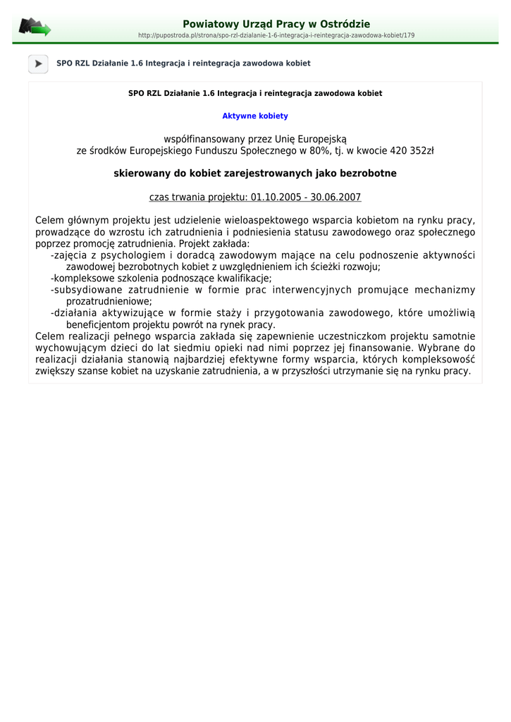Powiatowy Urząd Pracy w Ostródzie http://pupostroda.pl/strona/spo-rzl-dzialanie-1-6-integracja-i-reintegracja-zawodowa-kobiet/179 SPO RZL Działanie 1.6 Integracja i reintegracja zawodowa kobiet SPO RZL Działanie 1.6 Integracja i reintegracja zawodowa kobiet Aktywne kobiety współfinansowany przez Unię Europejską ze środków Europejskiego Funduszu Społecznego w 80%, tj. w kwocie 420 352zł skierowany do kobiet zarejestrowanych jako bezrobotne czas trwania projektu: 01.10.2005 - 30.06.2007 Celem głównym projektu jest udzielenie wieloaspektowego wsparcia kobietom na rynku pracy, prowadzące do wzrostu ich zatrudnienia i podniesienia statusu zawodowego oraz społecznego poprzez promocję zatrudnienia. Projekt zakłada: -zajęcia z psychologiem i doradcą zawodowym mające na celu podnoszenie aktywności zawodowej bezrobotnych kobiet z uwzględnieniem ich ścieżki rozwoju; -kompleksowe szkolenia podnoszące kwalifikacje; -subsydiowane zatrudnienie w formie prac interwencyjnych promujące mechanizmy prozatrudnieniowe; -działania aktywizujące w formie staży i przygotowania zawodowego, które umożliwią beneficjentom projektu powrót na rynek pracy. Celem realizacji pełnego wsparcia zakłada się zapewnienie uczestniczkom projektu samotnie wychowującym dzieci do lat siedmiu opieki nad nimi poprzez jej finansowanie. Wybrane do realizacji działania stanowią najbardziej efektywne formy wsparcia, których kompleksowość zwiększy szanse kobiet na uzyskanie zatrudnienia, a w przyszłości utrzymanie się na rynku pracy.