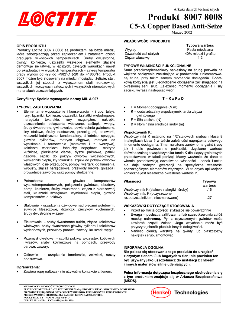 Arkusz danych technicznych Produkt 8007 8008 C5-A Copper Based Anti-Seize Marzec 2002 WŁAŚCIWOŚCI PRODUKTU OPIS PRODUKTU Produkty Loctite 8007 i 8008 są produktami na bazie miedzi, które zabezpieczają przed zapieczeniem i zatarciem części pracujące w wysokich temperaturach. Śruby dwustronne, gwinty, kołnierze, uszczelki wszystkie elementy złączne demontuje się łatwiej, w lepszych, czystych warunkach nawet po eksploatacji w wysokich temperaturach - zakres temperatur pracy wynosi od -29 do +982oC (-20 do +1800oF). Produkt 8007 możne być stosowany na miedzi, mosiądzu, żeliwie, stali, wszystkich jej stopach z wyłączeniem stali nierdzewnej, wszystkich tworzywach sztucznych i wszystkich niemetalowych materiałach uszczelniających. Typowa wartość Pasta miedziana 40% miedzi i grafitu 1.2 Wygląd Zawartość ciał stałych Ciężar właściwy TYPOWE WŁASNOŚCI FUNKCJONALNE Smar przeciwzapieczeniowy naniesiony na śrubę pozwala na większe obciążenie zaciskające w porównaniu z niesmarowaną śrubą, przy takim samym momencie dociągania. Dodatkową korzyścią jest ujednolicenie obciążenia zaciskającego na określonej serii śrub. Zależność momentu dociągania i siły zacisku wyraża następując wzór T=KxFxD Certyfikaty: Spełnia wymagania normy MIL A 907 • • T = Moment dociągania (N.m) K = doświadczalny współczynnik tarcia złącza gwintowego F = Siła zacisku (N) D = Nominalna średnica śruby (m) TYPOWE ZASTOSOWANIA • Elementarne wyposażenie i konserwacja - śruby, tuleje, rury, łączniki, kołnierze, uszczelki, kształtki wielodrogowe, narzędzia tokarskie, rury rozgałęźne, nakrętki, uszczelnienia, połączenia wtłaczane, zaślepki, wkręty, śruby dwustronne, gwintownice, powierzchnie gwintowane, liny stalowe, śruby nastawcze, przeciągarki, odlewarki, kruszarki katalityczne, kondensatory, chłodnice, sprzęgła, głowice cylindrów, matryce ciągowe, matryce do wyciskania i formowania (metalowe i z tworzywa), kołnierze wiertnicze, łańcuchy napędowe, matryce kuźnicze, pierścienie cierne, dysze paliwowe, palniki gazowe, szpilki do pokryw otworów wyczystkowych, wymienniki ciepła, kły tokarskie, szpilki do pokryw otworów włazowych, osie przegubów, pompy, wiertarki do kamienia, wypusty, złącza narzędziowe, przewody rurowe, gniazda i prowadnice zaworów oraz pompy studzienne. Współczynnik K: Współczynniki K ustalono na 1/2”stalowych śrubach klasa 8 i nakrętkach klasa 5 w teście zależności naprężenia osiowego i momentu dociągania. Smar nałożono zarówno na gwint śruby jak i obie powierzchnie podkładki. Uzyskane wartości doświadczalnego współczynnika tarcia K dla złączy gwintowych przedstawiono w tabeli poniżej. Mamy wrażenie, że dane te wiernie przedstawiają oczekiwane własności. Jednak Loctite nie daje żadnych gwarancji na specyficzne własności poszczególnych elementów złącznych. W trudnych aplikacjach konieczne jest niezależne określenie wartości K. • Własności Petrochemia głowice kompresorów wysokotemperaturowych, połączenia gwintowe, obudowy pomp, kołnierze, śruby dwustronne, złącza z nierdzewnej stali, kruszarki szczękowe, wymienniki ciepła, głowice kompresorów, autoklawy. • Stalownie - urządzenia dźwigowe nad piecami wgłębnymi, suwnice kleszczowe, drzwiczki piecyków kuchennych, śruby dwustronne włazów. • Elektrownie - śruby dwustronne turbin, złącza kolektorów wlotowych, śruby dwustronne głowicy cylindra i kolektorów wydechowych, przewody parowe, zawory, kruszarki węgla. • Przemysł okrętowy - szpilki pokryw wyczystek kotłowych i włazów, śruby kołnierzowe na pompach, przewody parowe, zawory. • Odlewnie - urządzenia formierskie, żeliwiaki, ruszty podsuwowe. Ograniczenia: • Zawiera ropę naftową - nie używać w kontakcie z tlenem. • • Współczynnik K (stalowe nakrętki i śruby) Współczynnik, K (oczyszczone rozpuszczalnikiem, niesmarowane) Typowa wartość .16 .27 WSKAZÓWKI DOTYCZĄCE STOSOWANIA • Przed aplikacją oczyścić stykające się powierzchnie • Uwaga – podczas szlifowania lub szczotkowania załóż maskę ochronną. Pył z czyszczonych gwintów może zawierać cząstki żelaza. Jego wdychanie może być przyczyną chorób płuc lub innych dolegliwości. • Nanieść cienką warstwę na gwinty lub płaszczyzny nakrętek i śrub, zmontować INFORMACJA OGÓLNA Nie poleca się stosowania tego produktu do urządzeń z czystym tlenem i/lub bogatych w tlen; nie powinien też być używany jako uszczelniacz do instalacji z chlorem i innych materiałów silnie utleniających. Pełna informacja dotycząca bezpiecznego obchodzenia się z tym produktem znajduje się w Arkuszu Bezpieczeństwa (MSDS). NIE DOTYCZY WYMOGÓW TECHNICZNYCH. PRZYTOCZONE TUTAJ DANE TECHNICZNE MAJĄ JEDYNIE SŁUŻYĆ JAKO PUNKTY ODNIESIENIA. PO POMOC I WSKAZÓWKI DOTYCZĄCE WARUNKÓW TECHNICZNYCH TEGO PRODUKTU PROSZĘ ZWRÓCIĆ SIĘ DO DZIAŁU JAKOŚCI KORPORACJI LOCTITE. ROCKY HILL, CT FAX: +1 (860)-571-5473 DUBLIN, IRLANDIA FAX: +353-(1)-451 - 9959 TDS Loctite®128500 8007/8008, Marzec 2002 Magazynowanie O ile na etykiecie produktu nie ma innych wskazań, idealnym sposobem jego przechowywania będzie pozostawienie go w zamkniętych pojemnikach w chłodnym i suchym pomieszczeniu w temperaturze pomiędzy 8°C a 28°C (46°F do 82°F). Optymalna temperatura magazynowania to dolna połowa tego zakresu. Resztek materiału nie należy umieszczać z powrotem w jego oryginalnym pojemniku, gdyż mogłoby dojść do zanieczyszczenia produktu. Dalsze informacje na temat okresu przydatności produktu można uzyskać w lokalnym ośrodku obsługi technicznej. Zakresy danych Przytoczone tutaj dane mogą służyć jako typowe wartości i/lub jako ich zakres. Wartości oparte są na danych uzyskanych z aktualnie przeprowadzonych badań i są okresowo weryfikowane. Uwaga Materiał zawarty w niniejszym opracowaniu został przygotowany w oparciu o najlepszą wiedz