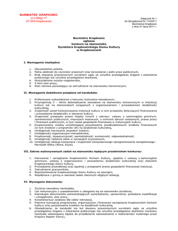 BURMISTRZ KRAPKOWIC ul.3 Maja 17 47-303 Krapkowice Załącznik Nr 1 do Zarządzenia Nr 112/2011 Burmistrza Krapkowic z dnia 21 lipca 2011 r. Burmistrz Krapkowic ogłasza konkurs na stanowisko Dyrektora Krapkowickiego Domu Kultury w Krapkowicach I. Wymagania niezbędne: 1. 2. 3. 4. 5. 6. Obywatelstwo polskie, Pełna zdolność do czynności prawnych oraz korzystanie z pełni praw publicznych, Brak skazania prawomocnym wyrokiem sądu za umyślne przestępstwo ścigane z oskarŜenia publicznego lub umyślne przestępstwo skarbowe, Wykształcenie wyŜsze magisterskie, 5 letni staŜ pracy, Stan zdrowia pozwalający na zatrudnienie na stanowisku kierowniczym, II. Wymagania dodatkowe poŜądane od kandydata: 1. 2. Preferowane wykształcenie o kierunku kulturalno-oświatowym, Przynajmniej 3 – letnie doświadczenie zawodowe na stanowisku kierowniczym w instytucji kultury lub na stanowiskach związanych z organizowaniem i prowadzeniem działalności kulturalnej, 3. Znajomość zasad funkcjonowania instytucji kultury w tym przepisów dotyczących finansowania i prowadzenia działalności w obszarze kultury, 4. Znajomość przepisów prawa między innymi z zakresu: ustawy o samorządzie gminnym, zamówieniach publicznych, imprezach masowych, o ochronie danych osobowych, prawa pracy i finansach publicznych, w tym zasad gospodarki finansowej w instytucjach kultury, 5. Dysponowanie wiedzą umoŜliwiającą pozyskiwanie pozabudŜetowych środków finansowych (w tym środków z programów UE) na działalność kulturalną, 6. Umiejętność kierowania zespołem ludzkim, 7. Umiejętności organizacyjno-menadŜerskie, 8. Kreatywność, dyspozycyjność, samodzielność, sumienność, odpowiedzialność, 9. Umiejętność radzenia sobie w sytuacjach kryzysowych, 10. Umiejętność obsługi komputera i znajomość komputerowego oprogramowania narzędziowego Microsoft Office (Word, Excel). III. Zakres wykonywanych zadań na stanowisku będącym przedmiotem konkursu: 1. 2. 3. 4. 5. Kierowanie i zarządzanie Krapkowickim Domem Kultury, zgodnie z ustawą o samorządzie gminnym, ustawą o organizowaniu i prowadzeniu działalności kulturalnej oraz statutem Krapkowickiego Domu Kultury, Prowadzenie prawidłowej oraz zgodnej z przepisami prawa gospodarki finansowej instytucji, Zatrudnianie pracowników, Reprezentowanie Krapkowickiego Domu Kultury na zewnątrz, Współpraca z gminą w zakresie zadań zleconych objętych dotacją. IV. Wymagane dokumenty: 1. 2. 3. 4. 5. 6. śyciorys zawodowy kandydata, List motywacyjny z uzasadnieniem o ubieganie się na stanowisko dyrektora, Kserokopie dokumentów potwierdzających wykształcenie, uprawnienia, posiadane kwalifikacje i umiejętności, staŜ pracy, Kwestionariusz osobowy dla celów rekrutacji, Pisemna koncepcja programowa, organizacyjna i finansowa zarządzania Krapkowickim Domem Kultury oraz pozyskiwania środków na działalność kulturalną, Oświadczenie, Ŝe kandydat nie był skazany prawomocnym wyrokiem sądu za umyślne przestępstwo ścigane z oskarŜenia publicznego lub umyślne przestępstwo skarbowe (wybrany kandydat zobowiązany będzie do przedłoŜenia zaświadczenia o niekaralności wydanego przez Krajowy Rejestr Karny), 7. Oświadczenie, Ŝe kandydat nie ma zakazu pełnienia funkcji kierowniczych związanych z dysponowaniem środkami publicznymi o których mowa w ustawie z dnia 17 grudnia 2004r. o odpowiedzialności za naruszenie dyscypliny finansów publicznych (Dz. U z 2005r. Nr 14 poz. 114 z późn. zm.), 8. Oświadczenie, Ŝe kandydat wyraŜa zgodę na przetwarzanie swoich danych osobowych dla potrzeb postępowania konkursowego (zgodnie z ustawą z dnia 29 sierpnia 1997 roku o ochronie danych osobowych Dz.U. z 2002 r. Nr 101 poz.926 z późn. zm.), 9. Oświadczenie o posiadaniu przez kandydata pełni praw publicznych, 10. Oświadczenie o posiadaniu przez kandydata stanu zdrowia pozwalającego na zatrudnienie na stanowisku kierowniczym ( wybrany kandydat zobowiązany będzie do przedłoŜenia, wystawionego przez lekarza medycyny pracy zaświadczenia o stanie zdrowia), 11. List motywacyjny i Ŝyciorys zawodowy powinny być opatrzone własnoręcznym podpisem oraz zawierać klauzulę: „WyraŜam zgodę na przetwarzanie moich danych osobowych zawartych w ofercie pracy dla potrzeb niezbędnych do realizacji procesu rekrutacji zgodnie z ustawą z dnia 29 sierpnia 1997r. o ochronie danych osobowych (Dz. U. z 2002r. Nr 101 poz.926 z późn. zm.)". V. Termin i miejsce składania dokumentów: 1. 2. Wymagane dokumenty naleŜy składać w zamkniętej kopercie z dopiskiem „Konkurs na stanowisko Dyrektora Krapkowickiego Domu Kultury" w siedzibie Urzędu Miasta i Gminy w Krapkowicach, 47–303 Krapkowice, ul. 3 Maja 17 – sekretariat (pok. 28) lub za pośrednictwem poczty w terminie do 31 sierpnia 2011 r. (liczy się data wpływu do Urzędu Miasta i Gminy) Dokumenty złoŜone po wyŜej określonym terminie nie będą rozpatrywane. VI. Informacje dodatkowe 1. Konkurs zostanie przeprowadzony w dwóch etapach: I etap - sprawdzenie ofert pod względem formalnym, bez udziału kandydatów. Rozpatrzenie ofert nastąpi do 6 dni po upływie terminu do ich składania. II etap - komisja konkursowa przeprowadzi rozmowę z kandydatami, podczas której zaprezentują swoją koncepcję programową, organizacyjną i finansową zarządzania Krapkowickim Domem Kultury oraz pozyskiwania środków na działalność kulturalną. Przeprowadzenie rozmowy kwalifikacyjnej nastąpi w terminie do dnia 16 września 2011 r. O terminie i miejscu przeprowadzenia II etapu - kandydaci zostaną powiadomieni telefonicznie. Rozstrzygnięcie konkursu na stanowisko dyrektora nastąpi w ciągu 5 dni po upływie terminu do przeprowadzenia rozmowy kwalifikacyjnej. 2. Informację o warunkach organizacyjno-finansowych moŜna uzyskać w siedzibie Krapkowickiego Domu Kultury przy ul. Prudnickiej 7, 47-300 Krapkowice w terminie od 27 lipca do 29 sierpnia 2011 r. (w kaŜdy dzień roboczy w godz.10.00 – 1
