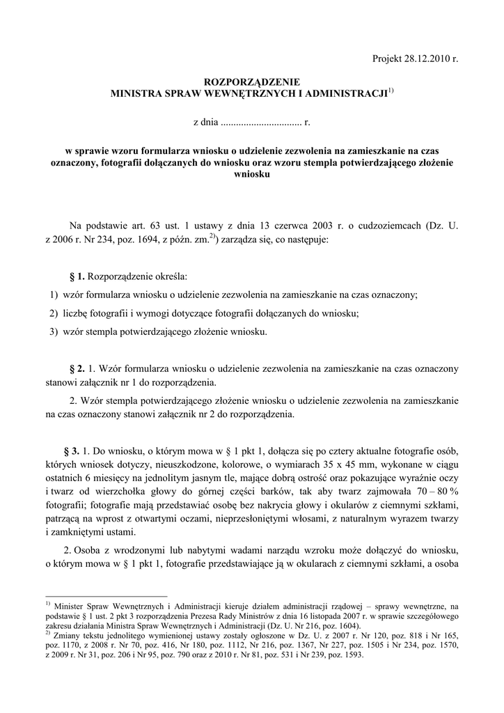 Projekt 28.12.2010 r. ROZPORZĄDZENIE MINISTRA SPRAW WEWNĘTRZNYCH I ADMINISTRACJI1) z dnia ................................ r. w sprawie wzoru formularza wniosku o udzielenie zezwolenia na zamieszkanie na czas oznaczony, fotografii dołączanych do wniosku oraz wzoru stempla potwierdzającego złożenie wniosku Na podstawie art. 63 ust. 1 ustawy z dnia 13 czerwca 2003 r. o cudzoziemcach (Dz. U. z 2006 r. Nr 234, poz. 1694, z późn. zm.2)) zarządza się, co następuje: § 1. Rozporządzenie określa: 1) wzór formularza wniosku o udzielenie zezwolenia na zamieszkanie na czas oznaczony; 2) liczbę fotografii i wymogi dotyczące fotografii dołączanych do wniosku; 3) wzór stempla potwierdzającego złożenie wniosku. § 2. 1. Wzór formularza wniosku o udzielenie zezwolenia na zamieszkanie na czas oznaczony stanowi załącznik nr 1 do rozporządzenia. 2. Wzór stempla potwierdzającego złożenie wniosku o udzielenie zezwolenia na zamieszkanie na czas oznaczony stanowi załącznik nr 2 do rozporządzenia. § 3. 1. Do wniosku, o którym mowa w § 1 pkt 1, dołącza się po cztery aktualne fotografie osób, których wniosek dotyczy, nieuszkodzone, kolorowe, o wymiarach 35 x 45 mm, wykonane w ciągu ostatnich 6 miesięcy na jednolitym jasnym tle, mające dobrą ostrość oraz pokazujące wyraźnie oczy i twarz od wierzchołka głowy do górnej części barków, tak aby twarz zajmowała 70 – 80 % fotografii; fotografie mają przedstawiać osobę bez nakrycia głowy i okularów z ciemnymi szkłami, patrzącą na wprost z otwartymi oczami, nieprzesłoniętymi włosami, z naturalnym wyrazem twarzy i zamkniętymi ustami. 2. Osoba z wrodzonymi lub nabytymi wadami narządu wzroku może dołączyć do wniosku, o którym mowa w § 1 pkt 1, fotografie przedstawiające ją w okularach z ciemnymi szkłami, a osoba 1) Minister Spraw Wewnętrznych i Administracji kieruje działem administracji rządowej – sprawy wewnętrzne, na podstawie § 1 ust. 2 pkt 3 rozporządzenia Prezesa Rady Ministrów z dnia 16 listopada 2007 r. w sprawie szczegółowego zakresu działania Ministra Spraw Wewnętrznych i Administracji (Dz. U. Nr 216, poz. 1604). 2) Zmiany tekstu jednolitego wymienionej ustawy zostały ogłoszone w Dz. U. z 2007 r. Nr 120, poz. 818 i Nr 165, poz. 1170, z 2008 r. Nr 70, poz. 416, Nr 180, poz. 1112, Nr 216, poz. 1367, Nr 227, poz. 1505 i Nr 234, poz. 1570, z 2009 r. Nr 31, poz. 206 i Nr 95, poz. 790 oraz z 2010 r. Nr 81, poz. 531 i Nr 239, poz. 1593. nosząca nakrycie głowy zgodnie z zasadami swojego wyznania – fotografie przedstawiające ją z nakryciem głowy. Nakrycie głowy nie może zakrywać ani zniekształcać owalu twarzy. § 4. Rozporządzenie wchodzi w życie z dniem ogłoszenia3). MINISTER SPRAW WEWNĘTRZNYCH I ADMINISTRACJI 3) Niniejsze rozporządzenie było poprzedzone rozporządzeniem Ministra Spraw Wewnętrznych i Administracji z dnia 5 sierpnia 2003 r. w sprawie wzoru formularza wniosku o udzielenie zezwolenia na zamieszkanie na czas oznaczony oraz fotografii dołączanych do wniosku (Dz. U. Nr 147, poz. 1435), które traci moc z dniem wejścia w życie niniejszego rozporządzenia, na podstawie art. 8 ustawy z dnia 3 grudnia 2010 r. o zmianie ustawy o cudzoziemcach oraz niektórych innych ustaw (Dz. U. Nr 239, poz. 1593). Załączniki do rozporządzenia Ministra Spraw Wewnętrznych i Administracji z dnia ………… (poz. …) Załącznik nr 1 WZÓR WNIOSKU O UDZIELENIE ZEZWOLENIA NA ZAMIESZKANIE NA CZAS OZNACZONY .............................................................................................. / / ..................................................................... rok / year / année (pieczęć organu przyjmującego wniosek) / (stamp of the authority accepting the application) / (cachet de l’organe qui reçoit la demande) miesiąc / month / mois dzień / day /jour (miejsce i data złożenia wniosku) / (place and date of filing the application) / (lieu et date du dépôt de la demande) Przed wypełnieniem wniosku proszę zapoznać się z pouczeniem zamieszczonym na stronie 11 Prior to completing the application please familiarise yourself with the notes on page 11 Avant de remplir la demande consultez l’instruction sur la page 11 Wniosek wypełnia się w języku polskim Fotografia The application should be completed in Polish language La demande doit être remplie en langue polonaise Photo / Photo (35 x 45 mm) WNIOSEK O UDZIELENIE ZEZWOLENIA NA ZAMIESZKANIE NA CZAS OZNACZONY APPLICATION FOR THE RESIDENCE PERMIT FOR A DEFINED PERIOD OF TIME DEMANDE D’AUTORISATION DE RÉSIDENCE POUR UNE PÉRIODE DÉTERMINÉE Do / to / à .................................................................................................................................. (nazwa organu, do którego składany jest wniosek) / (name of the authority the application is filed to) / (dénomination de l’organe où la demande est déposée) A. DANE OSOBOWE CUDZOZIEMCA / PERSONAL DATA OF THE FOREIGNER / COORDONNÉES DE L’ÉTRANGER wypełnia wnioskodawca / completed by the applicant / à remplir par le demandeur 1. Nazwisko / Surname / Nom: 2. Nazwiska poprzednie / Previous surnames / Noms précédents: 3. Nazwisko rodowe / Family name / Nom de famille: 4. Imię (imiona) / Name (names) / Prénom (prénoms): 5. Imię ojca / Father’s name / Prénom du père: 6. Imię matki / Mother’s name / Prénom de la mère: 7. Nazwisko rodowe matki / Mother’s maiden name / Nom de famille de la mère: 8. Data urodzenia / Date of birth / Date de naissance: / rok / year / année 9. Płeć / Sex / Sexe: / miesiąc / month / mois -1- dzień / day / jour 10. Miejsce urodzenia / Place of birth / Lieu de naissance: 11. Kraj urodzenia (nazwa państwa) / Country of birth (name of the country) / Pays de naissance (appellation du pays): 12. Narodowość / Nationality / Origine: 13. Obywatelstwo / Citizenship / Nationalité: 14. Stan cywilny / Marital status / État civil: 15. Wykształcenie / Education 