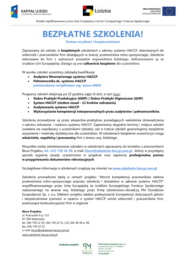 BEZPŁATNE SZKOLENIA! Postaw na jakość i bezpieczeństwo! Zapraszamy do udziału w bezpłatnych szkoleniach z zakresu systemu HACCP, skierowanych do właścicieli i pracowników firm działających w branży przetwórstwa rolno-spożywczego. Szkolenia skierowane do firm z wybranych powiatów województwa łódzkiego, dofinansowane są ze środków Unii Europejskiej, dlatego są one całkowicie bezpłatne dla uczestników. W wyniku szkoleń uczestnicy zdobędą kwalifikacje: Audytora Wewnętrznego systemu HACCP Pełnomocnika ds. systemu HACCP potwierdzone certyfikatem wg. wzoru MEN! Programy szkoleń obejmują po 32 godziny zajęć (4 dni), w tym m.in.: Dobre Praktyki Produkcyjne (GMP) / Dobre Praktyki Higieniczne (GHP) System HACCP (siedem zasad - 12 kroków wdrażania) Audytowanie systemu HACCP Wykorzystanie kompetencji interpersonalnych przez audytorów i pełnomocników. Szkolenia prowadzone są przez ekspertów-praktyków posiadających wieloletnie doświadczenia z zakresu wdrażania i nadzoru systemu HACCP. Zapewniamy dogodne terminy i miejsca szkoleń (ustalane we współpracy z uczestnikami szkoleń), zaś w trakcie szkoleń gwarantujemy bezpłatnie wyżywienie i materiały dydaktyczne dla uczestników. W szkoleniach bezpłatnie uczestniczyć mogą właściciele, wspólnicy i pracownicy firm z terenu woj. łódzkiego. Wszystkie osoby zainteresowane udziałem w szkoleniach zapraszamy do kontaktu z pracownikami Biura Projektu, tel. (12) 739 22 50, e-mail: [email protected] , którzy w przystępny sposób wyjaśnią zasady uczestnictwa w projekcie oraz zapewnią profesjonalną pomoc w przygotowaniu dokumentów rekrutacyjnych Szczegółowe informacje o szkoleniach znajdują się również na www.szkolenia-haccp.com.pl Szkolenia prowadzone będą w ramach projektu "Wzrost kompetencji pracowników sektora przetwórstwa rolno-spożywczego poprzez szkolenia i doradztwo w zakresie systemu HACCP" współfinansowanego przez Unię Europejską ze środków Europejskiego Fundusz Społecznego realizowanego na terenie woj. łódzkiego przez firmę szkoleniowo-doradczą PM Doradztwo Gospodarcze Sp. z o.o. Efektem projektu będzie podwyższenie kompetencji dotyczących jakości i bezpieczeństwa żywności w oparciu o system HACCP wśród właścicieli i pracowników firm, podnoszące konkurencyjności firm w regionie Biuro Projektu: ul. Kościuszki 6 p. 112 97-500 Radomsko tel. (44) 739 22 50, (44) 739 22 51, (12) 383 38 38 w. 85, fax. (44) 739 22 52 e-mail: [email protected] www.szkolenia-haccp.com.pl