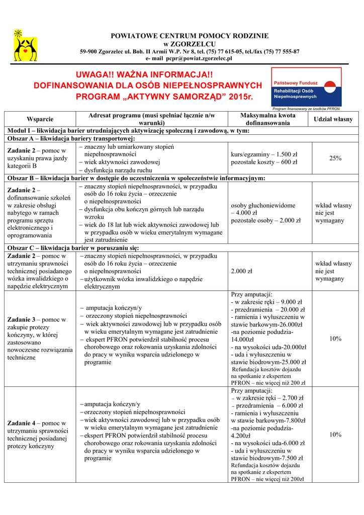 POWIATOWE CENTRUM POMOCY RODZINIE w ZGORZELCU 59-900 Zgorzelec ul. Boh. II Armii W.P. Nr 8, tel. (75) 77 615-05, tel./fax (75) 77 555-87 e- mail [email protected] UWAGA!! WAŻNA INFORMACJA!! DOFINANSOWANIA DLA OSÓB NIEPEŁNOSPRAWNYCH PROGRAM „AKTYWNY SAMORZĄD” 2015r. Program finansowany ze środków PFRON Adresat programu (musi spełniać łącznie n/w Maksymalna kwota Wsparcie warunki) dofinansowania Moduł I – likwidacja barier utrudniających aktywizację społeczną i zawodową, w tym: Obszar A – likwidacja bariery transportowej: − znaczny lub umiarkowany stopień Zadanie 2 – pomoc w niepełnosprawności kurs/egzaminy – 1.500 zł uzyskaniu prawa jazdy pozostałe koszty – 600 zł − wiek aktywności zawodowej kategorii B − dysfunkcja narządu ruchu Obszar B – likwidacja barier w dostępie do uczestniczenia w społeczeństwie informacyjnym: − znaczny stopień niepełnosprawności, w przypadku Zadanie 2 – osób do 16 roku życia – orzeczenie dofinansowanie szkoleń o niepełnosprawności osoby głuchoniewidome w zakresie obsługi − dysfunkcja obu kończyn górnych lub narządu – 4.000 zł nabytego w ramach wzroku programu sprzętu pozostałe osoby – 2.000 zł zawodowej lub − wiek do 18 lat lub wiek aktywności elektronicznego i w przypadku osób w wieku emerytalnym wymagane oprogramowania jest zatrudnienie Obszar C – likwidacja barier w poruszaniu się: − znaczny stopień niepełnosprawności, w przypadku Zadanie 2 – pomoc w osób do 16 roku życia – orzeczenie utrzymaniu sprawności 2.000 zł technicznej posiadanego o niepełnosprawności wózka inwalidzkiego o − użytkownik wózka inwalidzkiego o napędzie napędzie elektrycznym elektrycznym Przy amputacji: - w zakresie ręki – 9.000 zł − amputacja kończyn/y - przedramienia – 20.000 zł − orzeczony stopień niepełnosprawności - ramienia i wyłuszczeniu w Zadanie 3 – pomoc w − wiek aktywności zawodowej lub w przypadku osób stawie barkowym-26.000zł zakupie protezy w wieku emerytalnym wymagane jest zatrudnienie -na poziomie podudziakończyny, w której − ekspert PFRON potwierdził stabilność procesu 14.000zł zastosowano chorobowego oraz rokowania uzyskania zdolności - na wysokości uda-20.000zł nowoczesne rozwiązania do pracy w wyniku wsparcia udzielonego w - uda i wyłuszczeniu w techniczne programie stawie biodrowym-25.000 zł Udział własny 25% wkład własny nie jest wymagany wkład własny nie jest wymagany 10% Refundacja kosztów dojazdu na spotkanie z ekspertem PFRON – nie więcej niż 200 zł Zadanie 4 – pomoc w utrzymaniu sprawności technicznej posiadanej protezy kończyny − amputacja kończyn/y − orzeczony stopień niepełnosprawności − wiek aktywności zawodowej lub w przypadku osób w wieku emerytalnym wymagane jest zatrudnienie − ekspert PFRON potwierdził stabilność procesu chorobowego oraz rokowania uzyskania zdolności do pracy w wyniku wsparcia udzielonego w programie Przy amputacji: – w zakresie ręki – 2.700 zł – przedramienia – 6.000 zł - ramienia i wyłuszczeniu w stawie barkowym-7.800zł -na poziomie podudzia4.200zł - na wysokości uda-6.000 zł - uda i wyłuszczeniu w stawie biodrowym-7.500 zł Refundacja kosztów dojazdu na spotkanie z ekspertem PFRON – nie więcej niż 200zł 10% Obszar D – pomoc w utrzymaniu aktywności zawodowej poprzez zapewnienie opieki dla osoby zależnej − aktywność zawodowa − znaczny lub umiarkowany stopień niepełnosprawności − pełnienie roli opiekuna prawnego dziecka - znaczny lub umiarkowany stopień niepełnosprawności Moduł II – pomoc w - nauka w szkole w wyższej lub szkole policealnej lub uzyskaniu wykształcenia kolegium lub przewód doktorski otwarty poza studiami na poziomie wyższym doktoranckimi 200 zł miesięcznie, jednak nie więcej niż 2.400 zł w ciągu roku – tytułem kosztów opieki nad każdą (jedną) osobą zależną - opłata za naukę (czesne) – równowartość kosztów czesnego w ramach jednej, aktualnie realizowanej formy kształcenia na poziomie wyższym (na jednym kierunku) - opłata za przeprowadzenie przewodu doktorskiego – 4.000 zł - dodatek na pokrycie kosztów kształcenia – nie mniej niż 500 zł 15% - osoby niepracujące wkład własny nie jest wymagany, - osoby zatrudnione: 15% jeśli korzystają z dof. do nauki na jednym kierunku 65% jeżeli korzystają z dof. do nauki na więcej niż jednym kierunku Warunki wykluczające uczestnictwo w programie: – w modułach I i II - wymagalne zobowiązania wobec PFRON lub wobec realizatora programu, – w module II - przerwa w nauce. Częstotliwość udzielania pomocy w ramach Modułu I: – Obszar A, Obszar B, Obszar C - Zadania 3 - pomoc może być udzielana co 3 lata, licząc od początku roku następującego po roku, w którym udzielono pomocy, – Obszar C - Zadania 2 i 4 - pomoc może być udzielana po zakończeniu okresu gwarancji, – Obszar D i Moduł II – pomoc może być udzielana jeżeli upłynął okres zawartej umowy. Termin przyjmowania wniosków: - Moduł I - od 11.032015r. do 30.08.2015r. - Moduł II - 2 cykle realizacji wniosków: od 11.032015r. do 30.03.2015r. i od 1.06.2015r. do 30.09 2015r. Termin zakończenia wypłaty dofinansowania w ramach aktualnego semestru/półrocza (moduł II) 31.05.2015r., pozostałe 31.01.2016r. WIĘCEJ INFORMACJI: - na stronie internetowej www.pcpr.powiat.zgorzelec.pl, - w siedzibie Powiatowego Centrum Pomocy Rodzinie w Zgorzelcu.