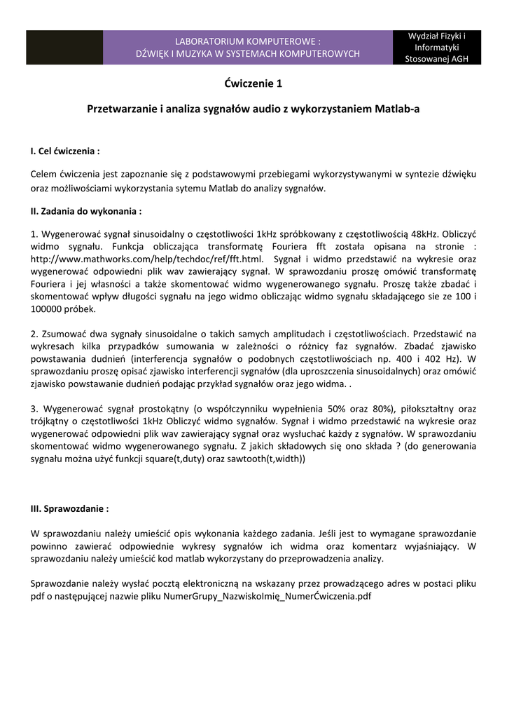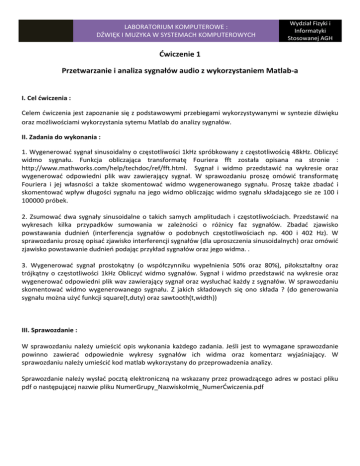 LABORATORIUM KOMPUTEROWE : DŹWIĘK I MUZYKA W SYSTEMACH KOMPUTEROWYCH Wydział Fizyki i Informatyki Stosowanej AGH Ćwiczenie 1 Przetwarzanie i analiza sygnałów audio z wykorzystaniem Matlab-a I. Cel ćwiczenia : Celem ćwiczenia jest zapoznanie się z podstawowymi przebiegami wykorzystywanymi w syntezie dźwięku oraz możliwościami wykorzystania sytemu Matlab do analizy sygnałów. II. Zadania do wykonania : 1. Wygenerować sygnał sinusoidalny o częstotliwości 1kHz spróbkowany z częstotliwością 48kHz. Obliczyć widmo sygnału. Funkcja obliczająca transformatę Fouriera fft została opisana na stronie : http://www.mathworks.com/help/techdoc/ref/fft.html. Sygnał i widmo przedstawić na wykresie oraz wygenerować odpowiedni plik wav zawierający sygnał. W sprawozdaniu proszę omówić transformatę Fouriera i jej własności a także skomentować widmo wygenerowanego sygnału. Proszę także zbadać i skomentować wpływ długości sygnału na jego widmo obliczając widmo sygnału składającego sie ze 100 i 100000 próbek. 2. Zsumować dwa sygnały sinusoidalne o takich samych amplitudach i częstotliwościach. Przedstawić na wykresach kilka przypadków sumowania w zależności o różnicy faz sygnałów. Zbadać zjawisko powstawania dudnień (interferencja sygnałów o podobnych częstotliwościach np. 400 i 402 Hz). W sprawozdaniu proszę opisać zjawisko interferencji sygnałów (dla uproszczenia sinusoidalnych) oraz omówić zjawisko powstawanie dudnień podając przykład sygnałów oraz jego widma. . 3. Wygenerować sygnał prostokątny (o współczynniku wypełnienia 50% oraz 80%), piłokształtny oraz trójkątny o częstotliwości 1kHz Obliczyć widmo sygnałów. Sygnał i widmo przedstawić na wykresie oraz wygenerować odpowiedni plik wav zawierający sygnał oraz wysłuchać każdy z sygnałów. W sprawozdaniu skomentować widmo wygenerowanego sygnału. Z jakich składowych się ono składa ? (do generowania sygnału można użyć funkcji square(t,duty) oraz sawtooth(t,width)) III. Sprawozdanie : W sprawozdaniu należy umieścić opis wykonania każdego zadania. Jeśli jest to wymagane sprawozdanie powinno zawierać odpowiednie wykresy sygnałów ich widma oraz komentarz wyjaśniający. W sprawozdaniu należy umieścić kod matlab wykorzystany do przeprowadzenia analizy. Sprawozdanie należy wysłać pocztą elektroniczną na wskazany przez prowadzącego adres w postaci pliku pdf o następującej nazwie pliku NumerGrupy_NazwiskoImię_NumerĆwiczenia.pdf