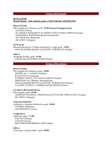 23 lipca 2010 (piątek) BIAŁYSTOK Rynek Sienny - Plac miejski, godz. 13:00 PARADA ZESPOŁÓW BIAŁYSTOK Plac miejski przy Ratuszu, godz. 18:00 Koncert Inauguracyjny LINAGO (Litwa), ELASSONA RESEARCH ACADEMY FOLK DANCE GROUP (Grecja), KUBAŃSKA BANDURA (Kraj Krasnodarski), TEATR RADA (Białoruś), ISLAMEY (Adygeja) SUWAŁKI Muszla koncertowa w Parku Konstytucji 3 maja, godz. 19:00 MAX KLEZMER BAND (ACOUSTIC ACROBATS) (Polska) ORLA Synagoga Wielka, godz. 19:00 CHANAJKI KLEZMER BAND (Polska) 24 lipca 2010 (sobota) BIAŁYSTOK Plac miejski przy Ratuszu, godz. 18:00 ZESPÓŁ im. L. ŁOJASA (Polska), KAZACZATA (Adygeja), EVEREST NEPAL CULTURAL GROUP (Nepal), HERCEGOVAC (Bośnia i Hercegowina), MAX KLEZMER BAND (ACOUSTIC ACROBATS) (Polska), VALERIY FILIPOV i ANDRZEJ KOZŁOWSKI (Polska) CZARNA BIAŁOSTOCKA Plac miejski, godz. 19:00 AKHİSAR ANADOLU LİSESİ HALK OYUNLARI TOPLULUĞU (Turcja), ISLAMEY (Adygeja) CIECHANOWIEC Amfiteatr w Muzeum Rolnictwa, godz. 18:00 CHABRY (Białoruś), GRANDINELE (Litwa) NAREWKA Amfiteatr, godz. 17:00 POLTEX (Polska), LINAGO (Litwa), RHYTHM PERFORMING ARTS (Indie) ORLA Uroczysko „Zielony Dąb”, godz. 18:00 KLEK (Chorwacja) GONIĄDZ Scena plenerowa nad Biebrzą, godz. 19:00 ELASSONA RESEARCH ACADEMY FOLK DANCE GROUP (Grecja), POLISYANKA (Ukraina), DREWLANY (Ukraina) SOKOLE Dom Ludowy, godz. 19:00 NOHCHO (Czeczenia/Polska), JOŁDYZ (Tatarstan) KRYPNO Hala Sportowa przy ZS, godz. 18:00 GOŚCINIEC (Białoruś) 25 lipca 2010 (niedziela) BIAŁYSTOK Plac miejski przy Ratuszu, godz. 17:30 TEATR OBRZĘDOWY ZE ZBÓJNEJ (Polska), POLISYANKA (Ukraina), DREWLANY (Ukraina), RHYTHM PERFORMING ARTS (Indie), CHANAJKI KLEZMER BAND (Polska), MARIA POMIANOWSKA I ZESPÓŁ POLSKI (Polska) BIELSK PODLASKI Amfiteatr miejski, godz. 18:00 ELASSONA RESEARCH ACADEMY FOLK DANCE GROUP (Grecja), EVEREST NEPAL CULTURAL GROUP (Nepal) HAJNÓWKA Amfiteatr miejski, godz. 18:00 MAX KLEZMER BAND (ACOUSTIC ACROBATS) (Polska) AUGUSTÓW Błonie nad Nettą, godz. 15:00 ZESPÓŁ im. L. ŁOJASA (Polska), AKHİSAR ANADOLU LİSESİ HALK OYUNLARI TOPLULUĞU (Turcja) ŁOMŻA Kościół pw. Krzyża Świętego, godz. 13:00 VALERIY FILIPOV i ANDRZEJ KOZŁOWSKI (Polska), KUBAŃSKA BANDURA (Kraj Krasnodarski), KAZACZATA (Adygeja) KRYNKI Ośrodek Sportu i Rekreacji, godz. 16:00 NOHCHO (Czeczenia/Polska), JOŁDYZ (Tatarstan) MICHAŁOWO Amfiteatr miejski, godz. 18:00 POLTEX (Polska), ISLAMEY (Adygeja), GOŚCINIEC (Białoruś) SOKÓŁKA Plac przed kinem „Sokół”, godz. 14:00 GRANDINELE (Litwa), CHABRY (Białoruś), RANOK (Polska) SIEMIATYCZE Amfiteatr przy Szkole Muzycznej, godz. 19:00 ČAČI VORBA (Polska) DOBRZYNIEWO DUŻE Hala Sportowa przy ZSP, godz. 15:30 LINAGO (Litwa), HERCEGOVAC (Bośnia i Hercegowina) MOŃKI Amfiteatr miejski, godz. 16:00 KALINKA (Polska), TEATR RADA (Białoruś) SUPRAŚL Dom Ludowy, godz. 17:00 KLEK (Chorwacja) 26 lipca 2010 (poniedziałek) BIAŁYSTOK Plac miejski przy Ratuszu, godz. 18:00 POLTEX (Polska), AKHİSAR ANADOLU LİSESİ HALK OYUNLARI TOPLULUĞU (Turcja), KLEK (Chorwacja), GOŚCINIEC (Białoruś), JOŁDYZ (Tatarstan), ČAČI VORBA (Polska) HAJNÓWKA Amfiteatr miejski, godz. 18:00 ZESPÓŁ im. L. ŁOJASA (Polska) TYKOCIN Wielka Synagoga, godz. 18:00 KUBAŃSKA BANDURA (Kraj Krasnodarski), VALERIY FILIPOV i ANDRZEJ KOZŁOWSKI (Polska) BOĆKI Scena przy Urzędzie Gminy, godz. 18:00 KLEKOCIAKI (Polska), KAZACZATA (Adygeja) GONIĄDZ Scena plenerowa nad Biebrzą, godz. 19:00 EVEREST NEPAL CULTURAL GROUP (Nepal) SURAŻ Świetlica Wiejska w Rynkach, godz. 18:00 HERCEGOVAC (Bośnia i Hercegowina), RHYTHM PERFORMING ARTS (Indie) 27 lipca 2010 (wtorek) BIAŁYSTOK Plac miejski przy Ratuszu, godz. 17:00 CHABRY (Białoruś), NOHCHO (Czeczenia/Polska), KLEKOCIAKI (Polska), RANOK (Polska), KALINKA (Polska) TYKOCIN Wielka Synagoga, godz. 18:00 MAX KLEZMER BAND (ACOUSTIC ACROBATS) (Polska) 28 lipca 2010 (środa) BIAŁYSTOK Plac miejski przy Ratuszu, godz. 17:30 Koncert Finałowy Zespoły wytypowane przez Międzynarodową Radę Artystyczną