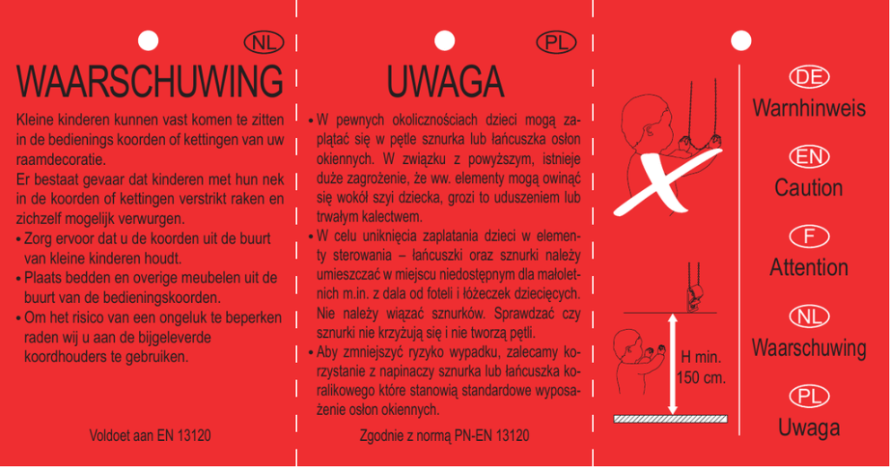 NL WAARSCHUWING Kleine kinderen kunnen vast komen te zitten in de bedienings koorden of kettingen van uw raamdecoratie. Er bestaat gevaar dat kinderen met hun nek in de koorden of kettingen verstrikt raken en zichzelf mogelijk verwurgen. Zorg ervoor dat u de koorden uit de buurt van kleine kinderen houdt. Plaats bedden en overige meubelen uit de buurt van de bedieningskoorden. Om het risico van een ongeluk te beperken raden wij u aan de bijgeleverde koordhouders te gebruiken. Voldoet aan EN 13120 UWAGA PL W pewnych okolicznościach dzieci mogą zaplątać się w pętle sznurka lub łańcuszka osłon okiennych. W związku z powyższym, istnieje duże zagrożenie, że ww. elementy mogą owinąć się wokół szyi dziecka, grozi to uduszeniem lub trwałym kalectwem. W celu uniknięcia zaplatania dzieci w elementy sterowania – łańcuszki oraz sznurki należy umieszczać w miejscu niedostępnym dla małoletnich m.in. z dala od foteli i łóżeczek dziecięcych. Nie należy wiązać sznurków. Sprawdzać czy sznurki nie krzyżują się i nie tworzą pętli. Aby zmniejszyć ryzyko wypadku, zalecamy korzystanie z napinaczy sznurka lub łańcuszka koralikowego które stanowią standardowe wyposażenie osłon okiennych. Zgodnie z normą PN-EN 13120 DE Warnhinweis EN Caution F Attention NL H min. 150 cm. Waarschuwing PL Uwaga DE WARNHINWEIS CAUTION EN ATTENTION F Kleinkinder können sich unter Umständen in den Schlaufen von Bedienschnüren und Ketten zur Bedienung von Fensterverkleidungen verfangen und erwürgen. Es besteht die Gefahr, dass sie sich die Schnüre um den Hals wickeln. Schnüre sind aus der Reichweite von Kindern zu halten, um Strangulierungen und Verwicklungen zu vermeiden. Betten, Kinderbetten und Einrichtungsgegenstände sind entfernt von Schnüren für Fensterabdeckungen aufzustellen. Um das Risiko eines Unfalls zu verringern, empfehlen wir die Verwendung unseres Schnurwicklers bzw. Kettenhalters. Under certain circumstances, small children and toddlers can get caught in the loops of control lines and chains used to operate window blinds. There is a danger that the lines could wind around their necks. To prevent that, keep children away from the lines and chains. Beds and furnishings should not be placed near window blind control lines and chains. To reduce the risk of accidents, we recommend the use of our line winder or chain clips. Les enfants en bas âge peuvent éventuellement rester coincés et s’ étranger dans les passants des cordons et chaînes servant à l’utilisation des garnitures de fenêtre. Ils risquent de s’enrouler les cordons autour du cou. Afin d’empêcher cela, mettez les cordons et les chaînes hors portée des enfants. Les lits et objets d’aménagement ne doivent pas se situer à proximité des cordons d’utilisation et des chaînes pour les garnitures de fenêtre. Afin de diminuer tout risque d’accident, nous vous recommandons l’utilisation de notre enrouler de cordon ou de notre porte-chaîne. Entspricht EN 13120 Corresponds to EN 13120 Correspond à la norme EN 13120